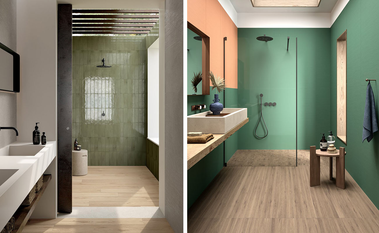 Während eine Kombination aus Salbeigrün für ein anspruchsvolles und versöhnliches Ambiente sorgt, kann eine Kombination mit einem dunkleren Grün oder einer glänzenden Oberfläche ein städtischeres Badezimmer schaffen, in dem häufig Metallelemente und große Fenster zu finden sind.
