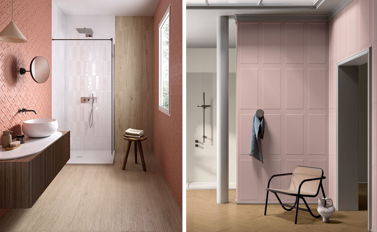 Die Fliesen aus der Kollektion Elisir sind die perfekte Wahl, um die lebendige Leichtigkeit eines rosa Wandbelags auszugleichen.
