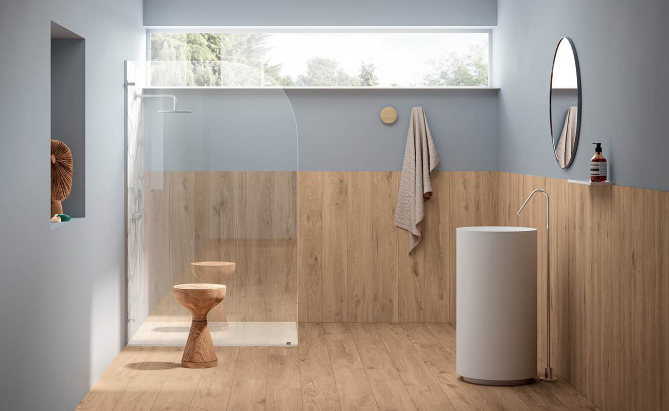 Die Böden aus holzähnlichem Feinsteinzeug von Elisir passen mit natürlicher Eleganz zur Farbe Blau und verleihen dem Bad dank ihrer Metalleinsätze eine überraschende Helligkeit.