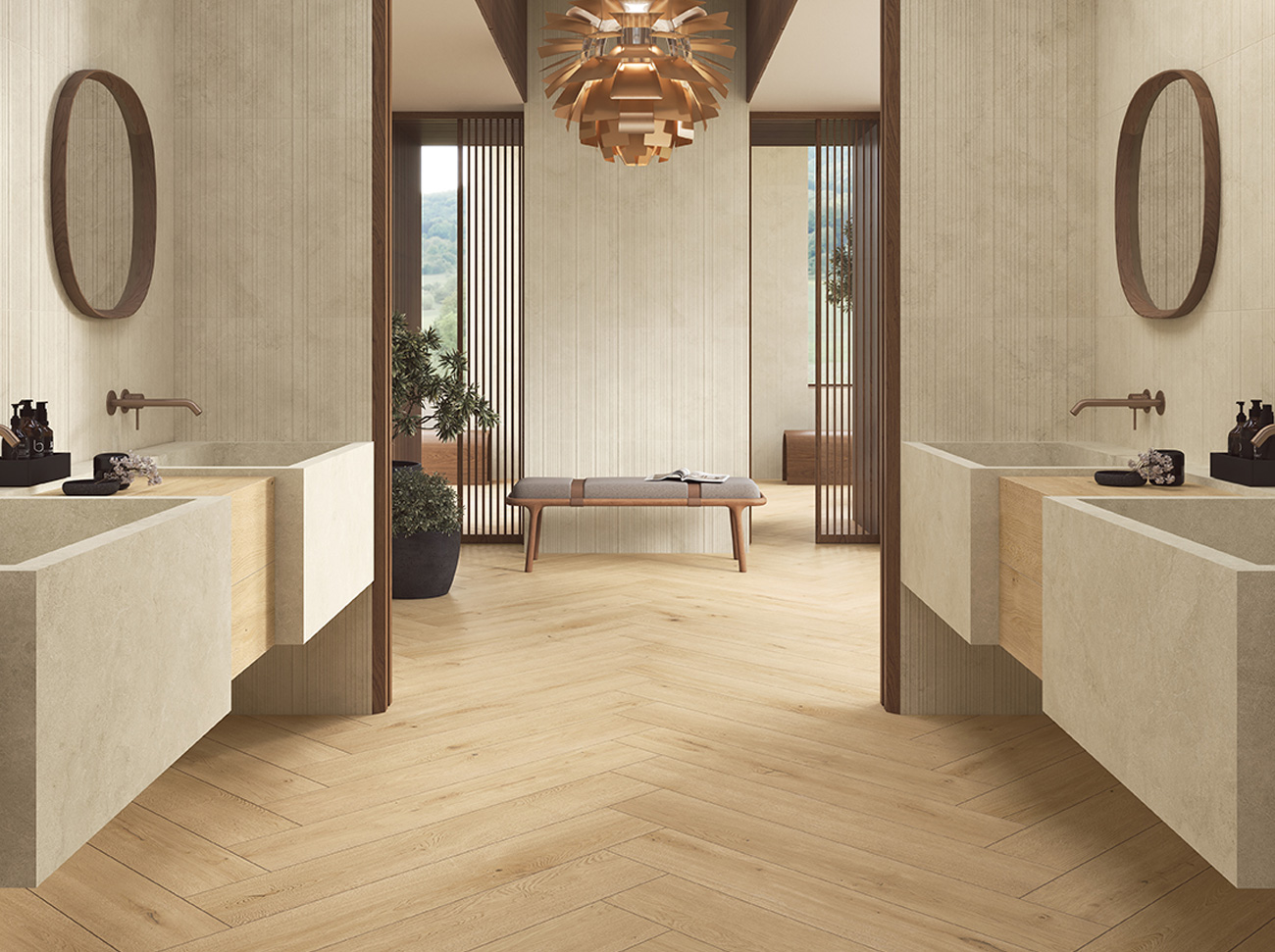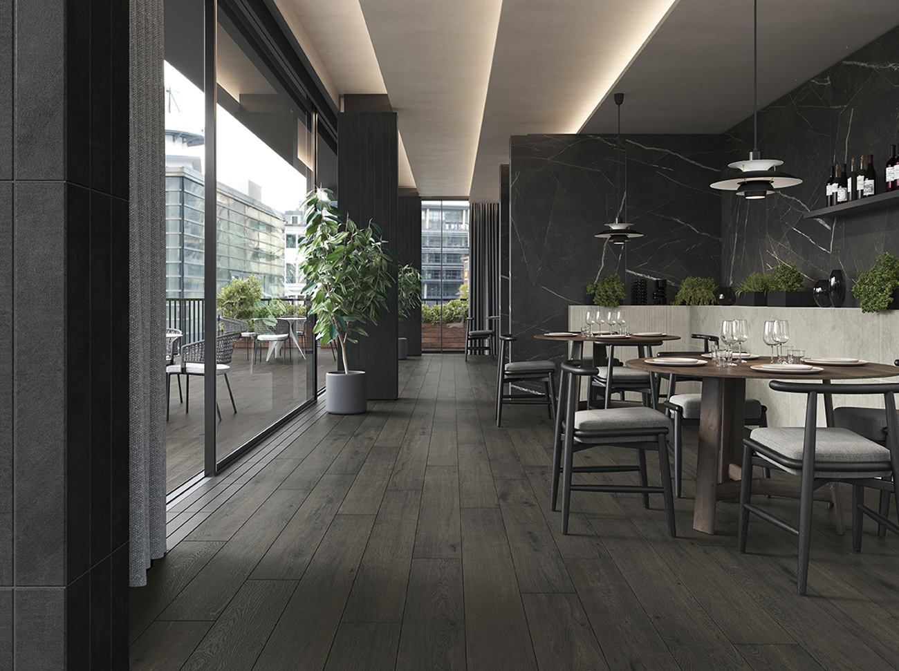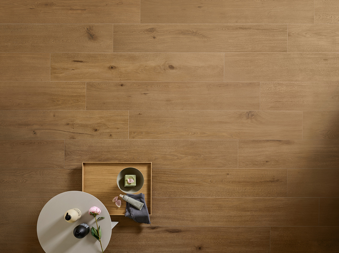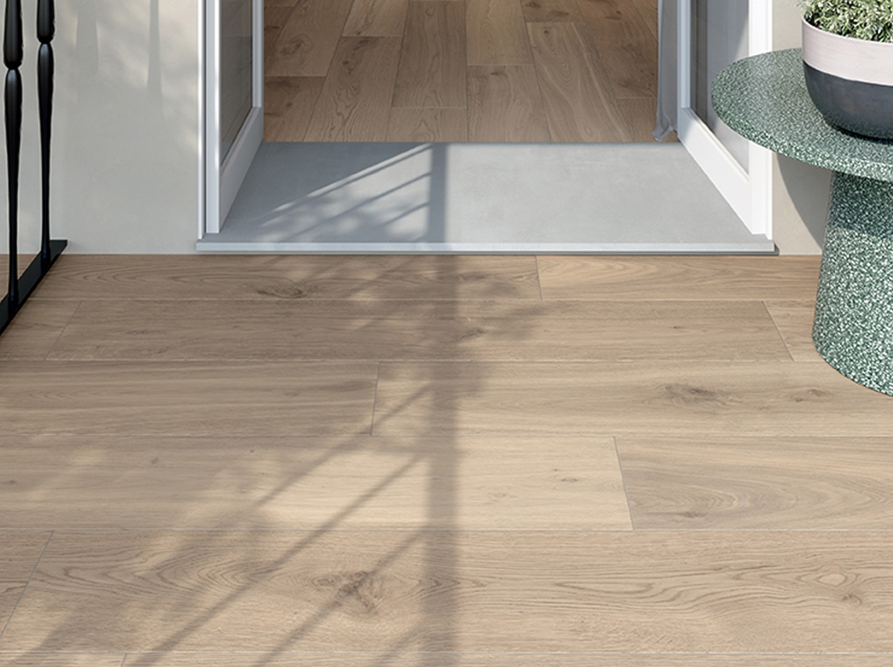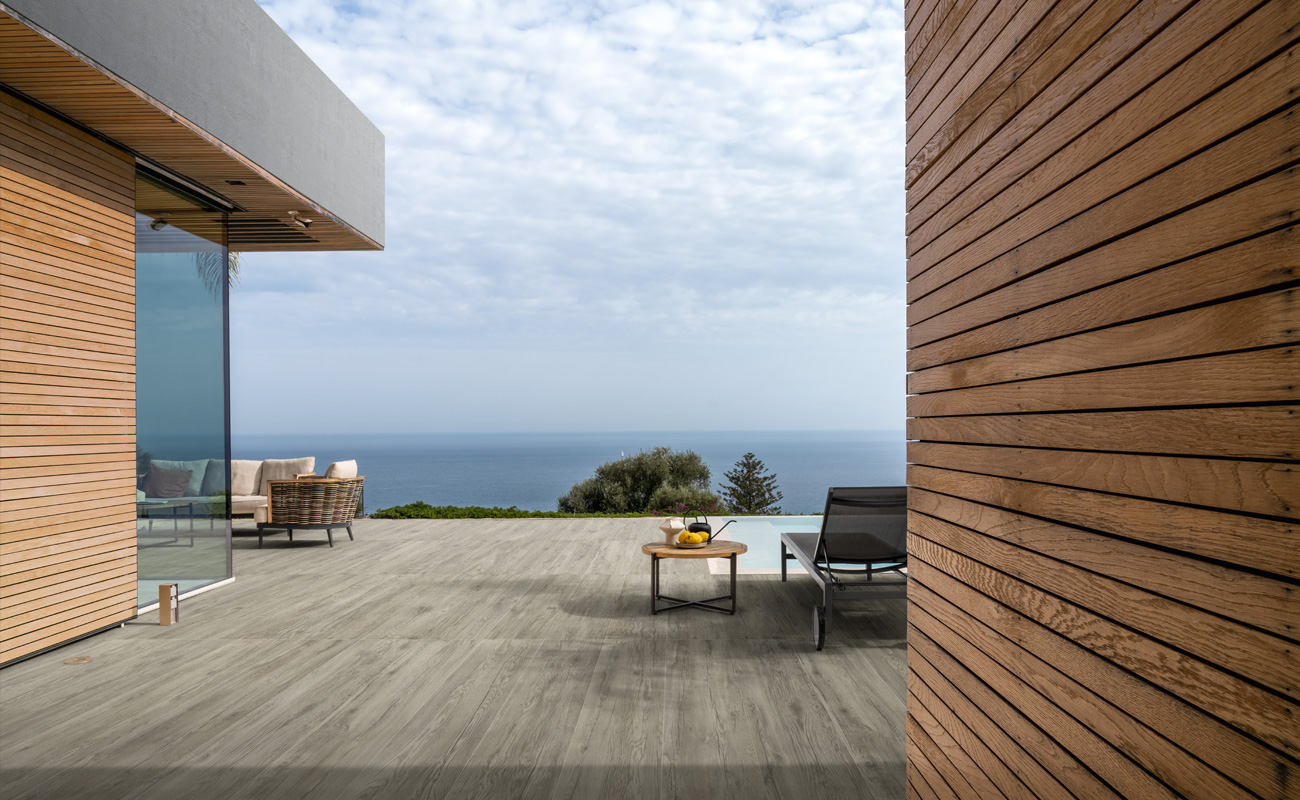 Und gerade ausgehend vom Format ermöglichen Bodenbeläge aus Feinsteinzeug in Holzoptik eine optische Vergrößerung der Räume. Darüber hinaus bieten sie gleichzeitig größtmögliche Kontinuität zwischen den Räumen, auch zwischen Innen- und Außenbereich.
