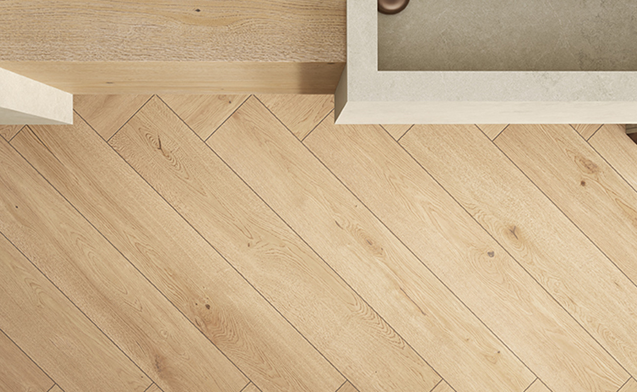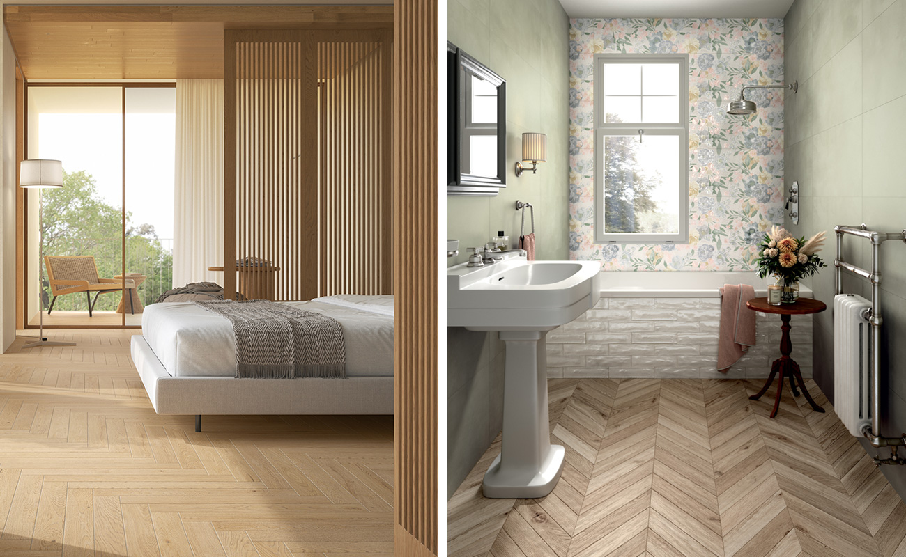 Mit der Verlegeart der Feinsteinzeugfliesen in Holzoptik lassen sich Räume aufwerten