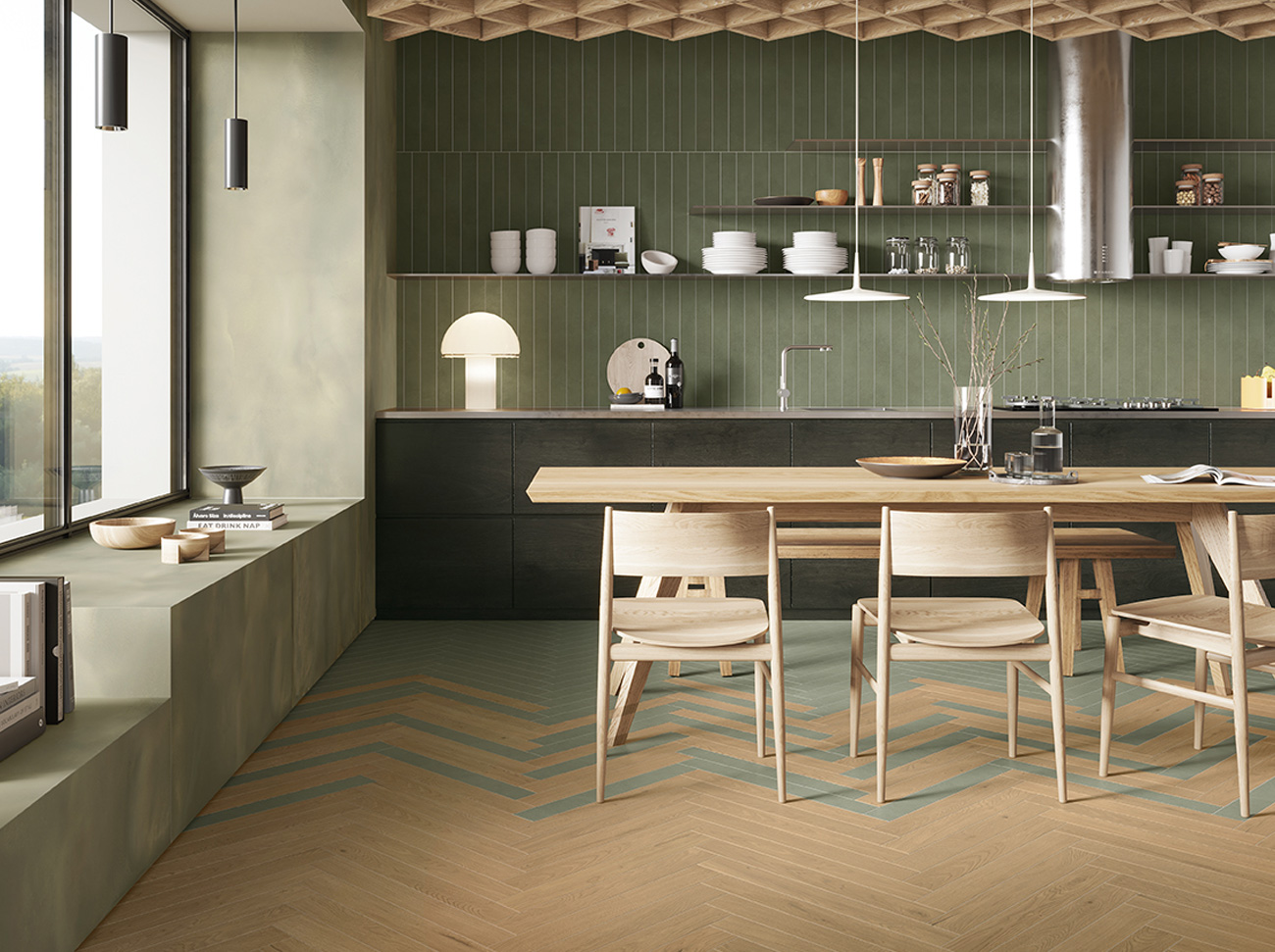 Beginnen wir mit modernen Räumen, in denen die Verlegung im Verband den Innenräumen einen raffinierten und minimalistischen Charakter verleiht.