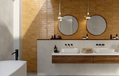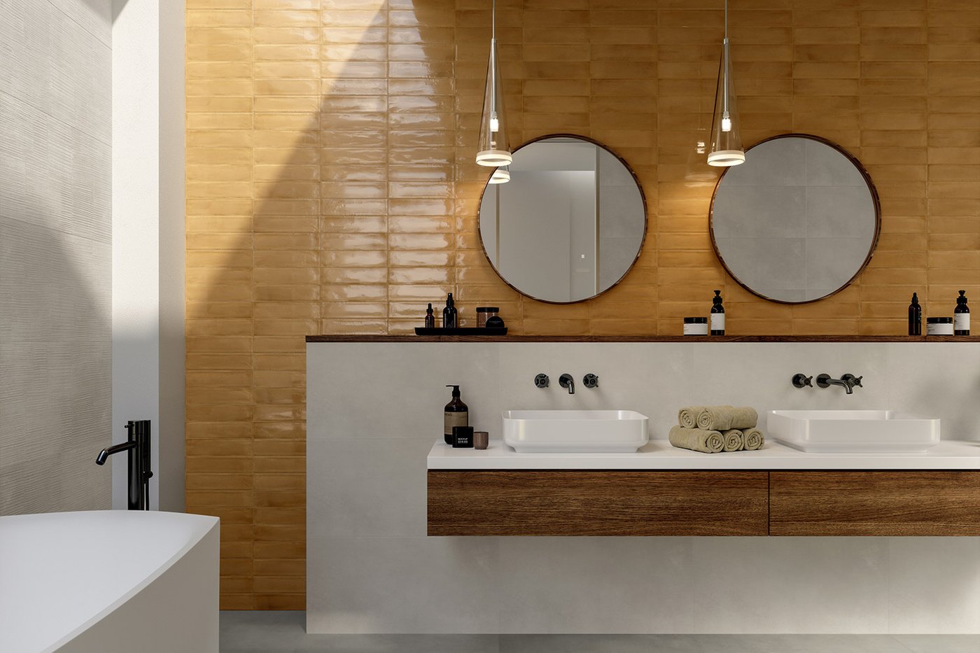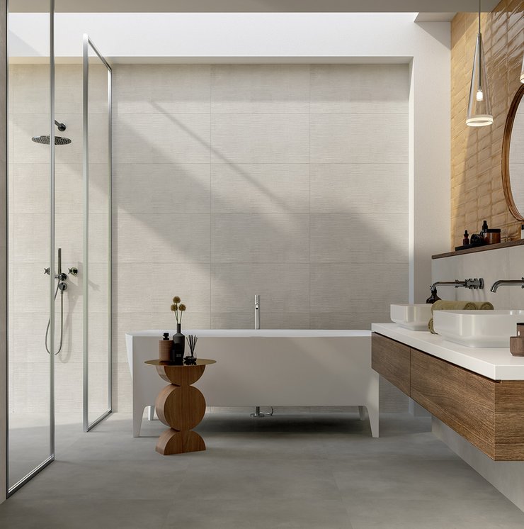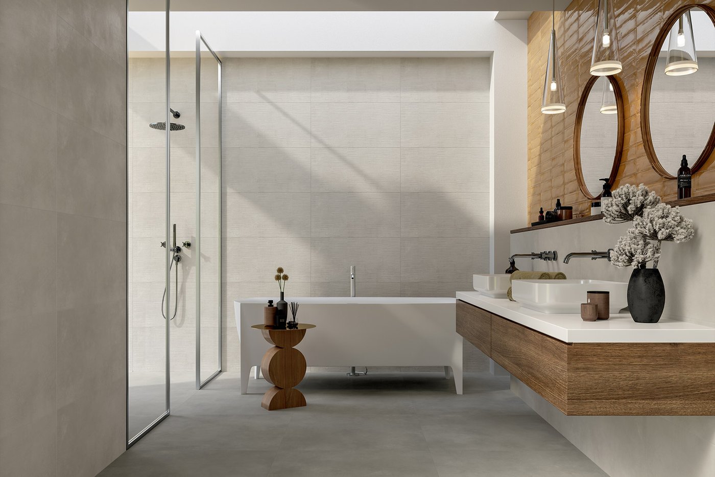 Ein neuer Einrichtungstrend, der Feinsteinzeug und essentielle Einrichtungsgegenstände mit industriellem Flair und umweltfreundlichen Elementen kombiniert.