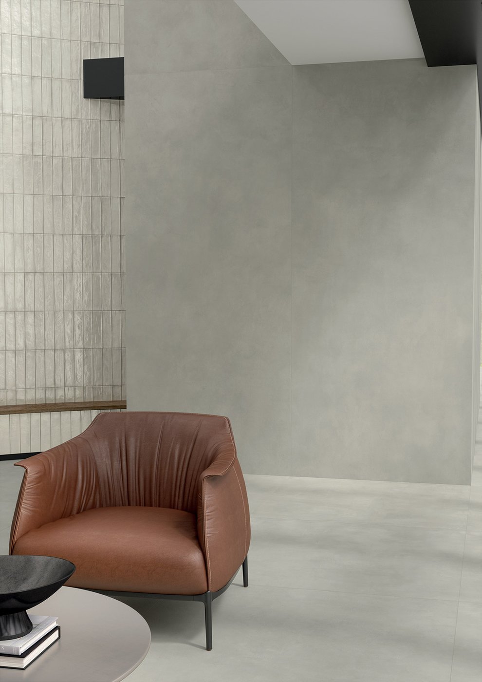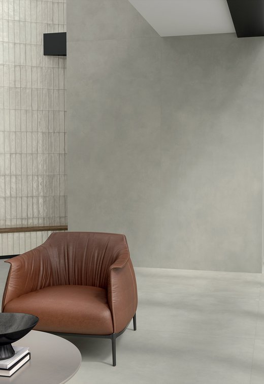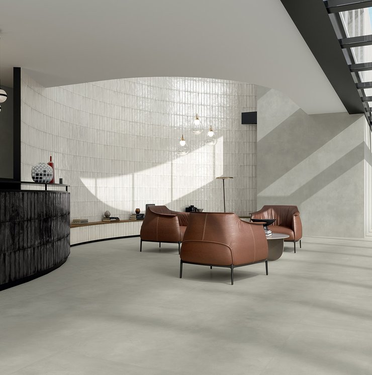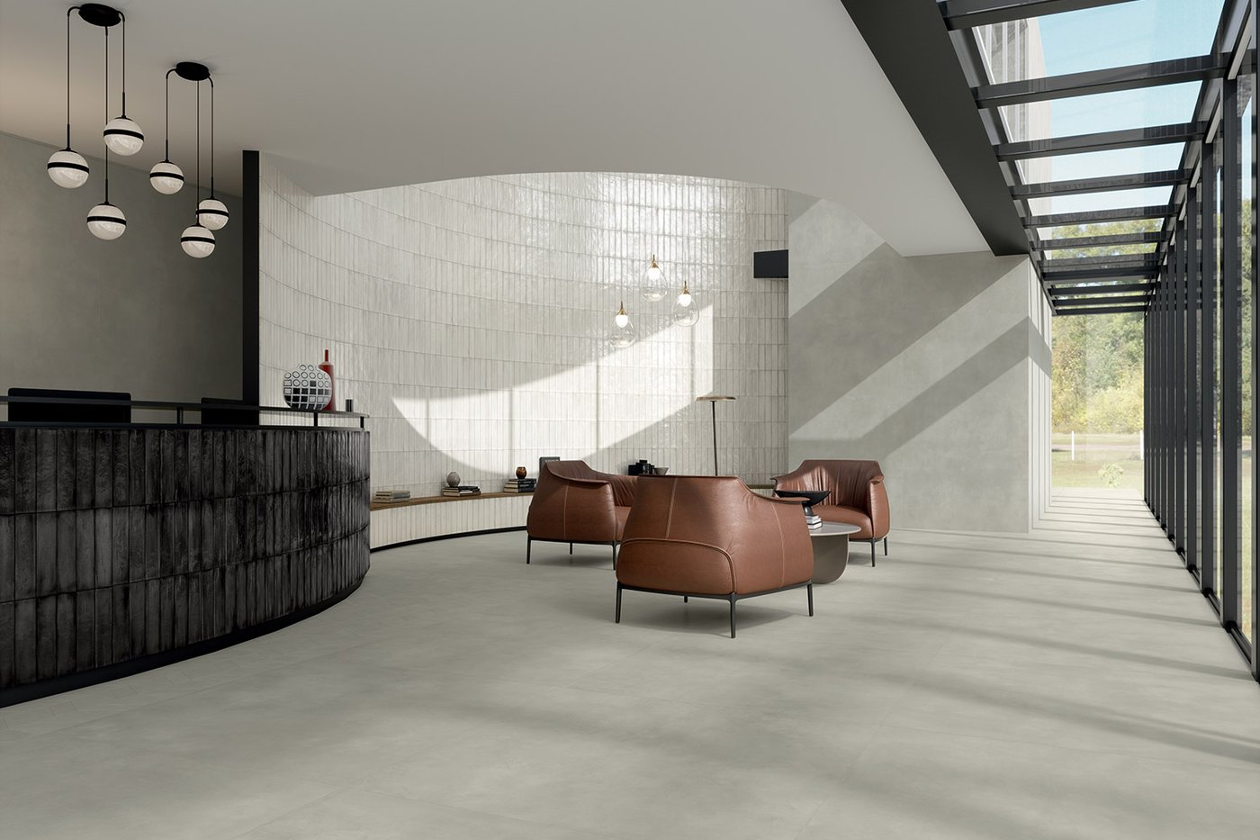 Wenn man von Industriestil spricht, denkt man sofort an Betonoptik: Boden- und Wandbeläge aus Feinsteinzeug mit Zementeffekt sind mit ihrem "rohen" und unbearbeiteten Aussehen ein großer Klassiker der Industriegebäude.