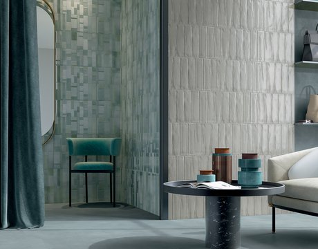 Marca Corona bietet zahlreiche Kollektionen und Effekte, die Ihren Wohnbereich in ein Ambiente im perfekten Industrial Green Style verwandeln können. Je nach Bedarf und Vorliebe für Farben und Effekte kann man verschiedene Interpretationen dieses seit mehr als einem halben Jahrhundert so beliebten und geschätzten Stils erhalten, darunter auch überraschende kleinformatige Varianten aus grünem, korallenfarbenem, achat- und amethystfarbenem Feinsteinzeug [Verde, Corallo, Agata und Ametista].