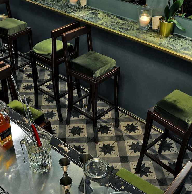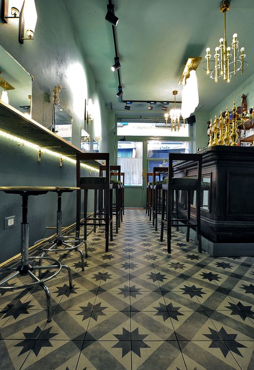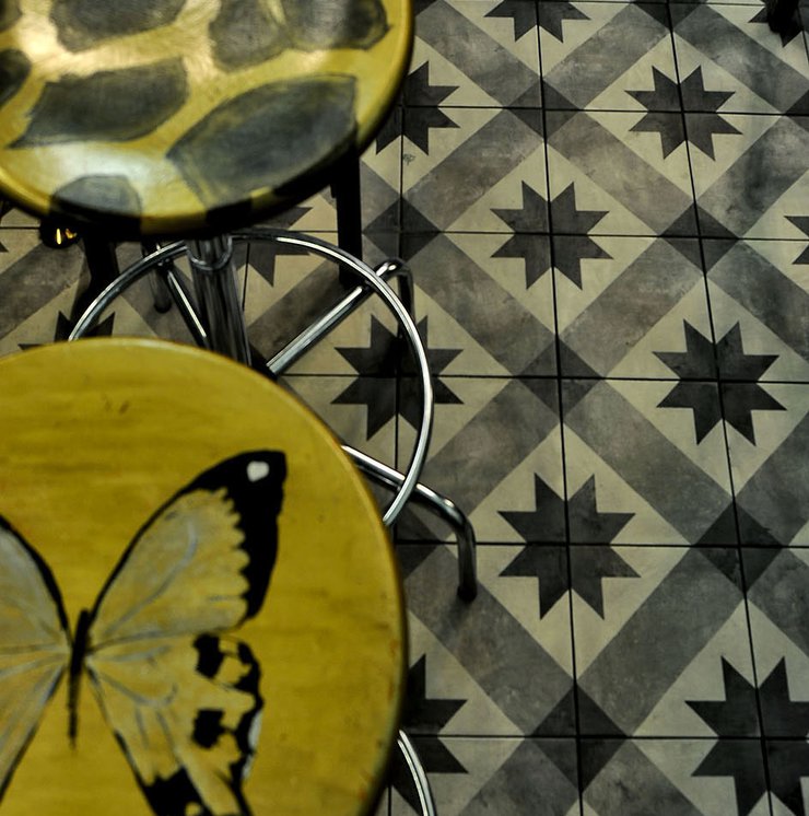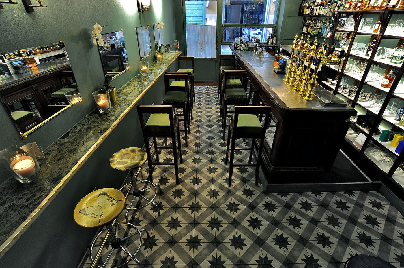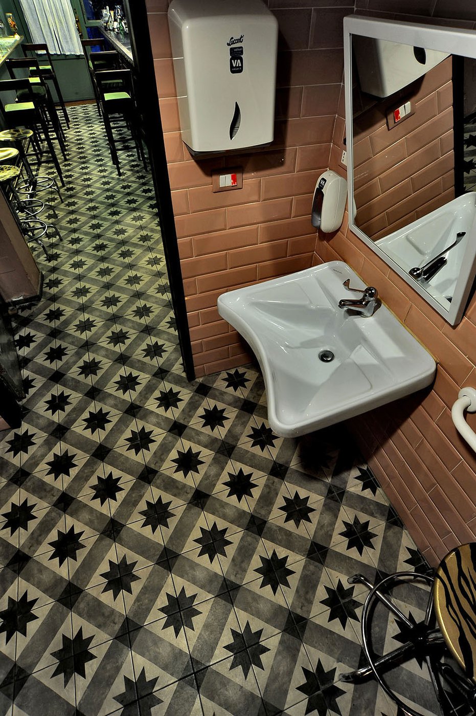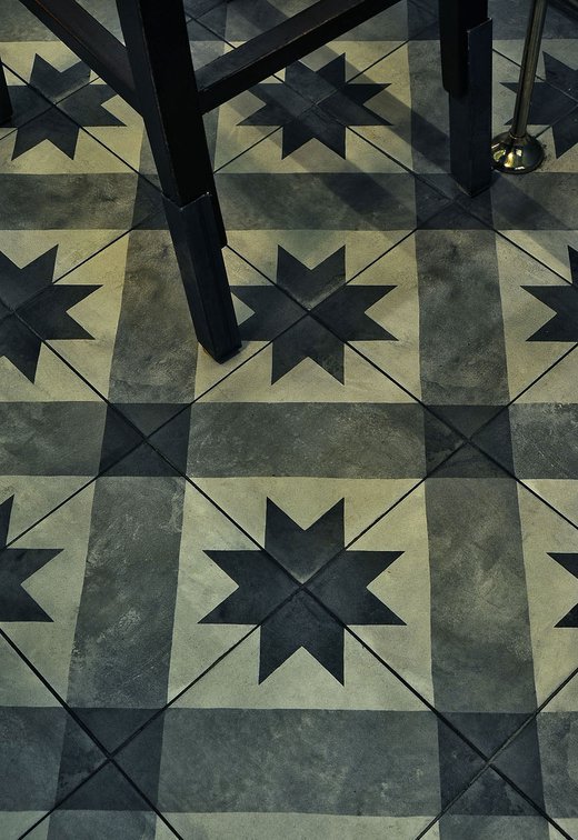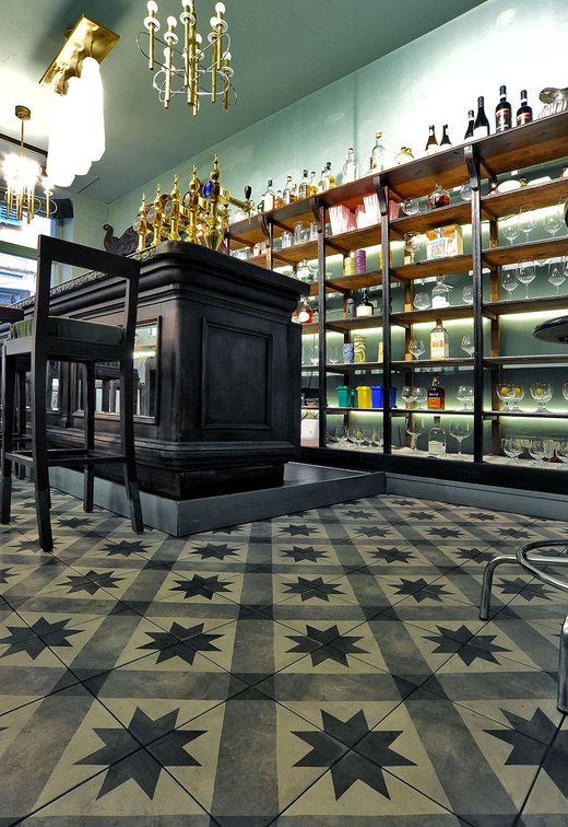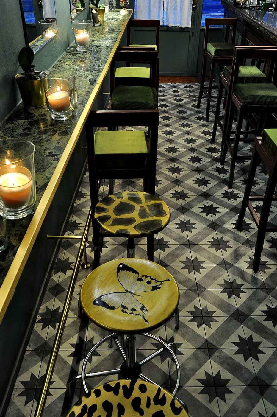 Eine exzentrische Cocktailbar im Herzen von Bologna, ein Ort zum Entspannen und Bewundern der bezaubernden Serie Terra: Die Wände in Salbeigrün und die Theken in Alchimistenmanier werden mit dem Motiv 20x20 Stella kombiniert und schaffen eine vielseitige und raffinierte Atmosphäre. Die Fliesen in Zementoptik 1741 in Grautönen verwandeln sich so in einen eleganten und trendigen Dekorteppich.