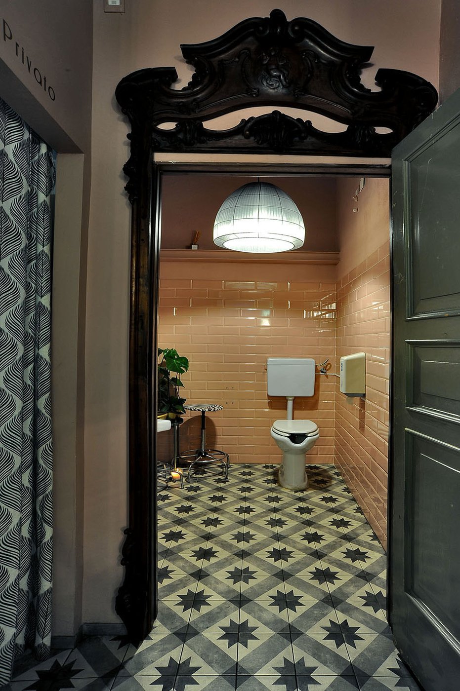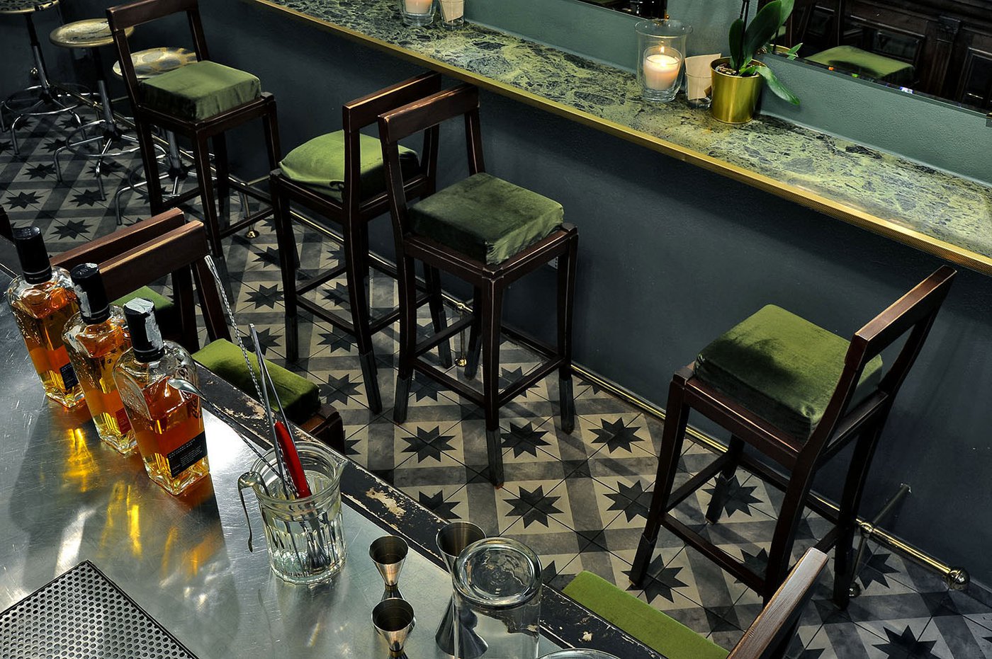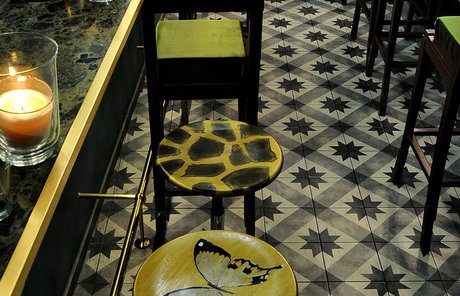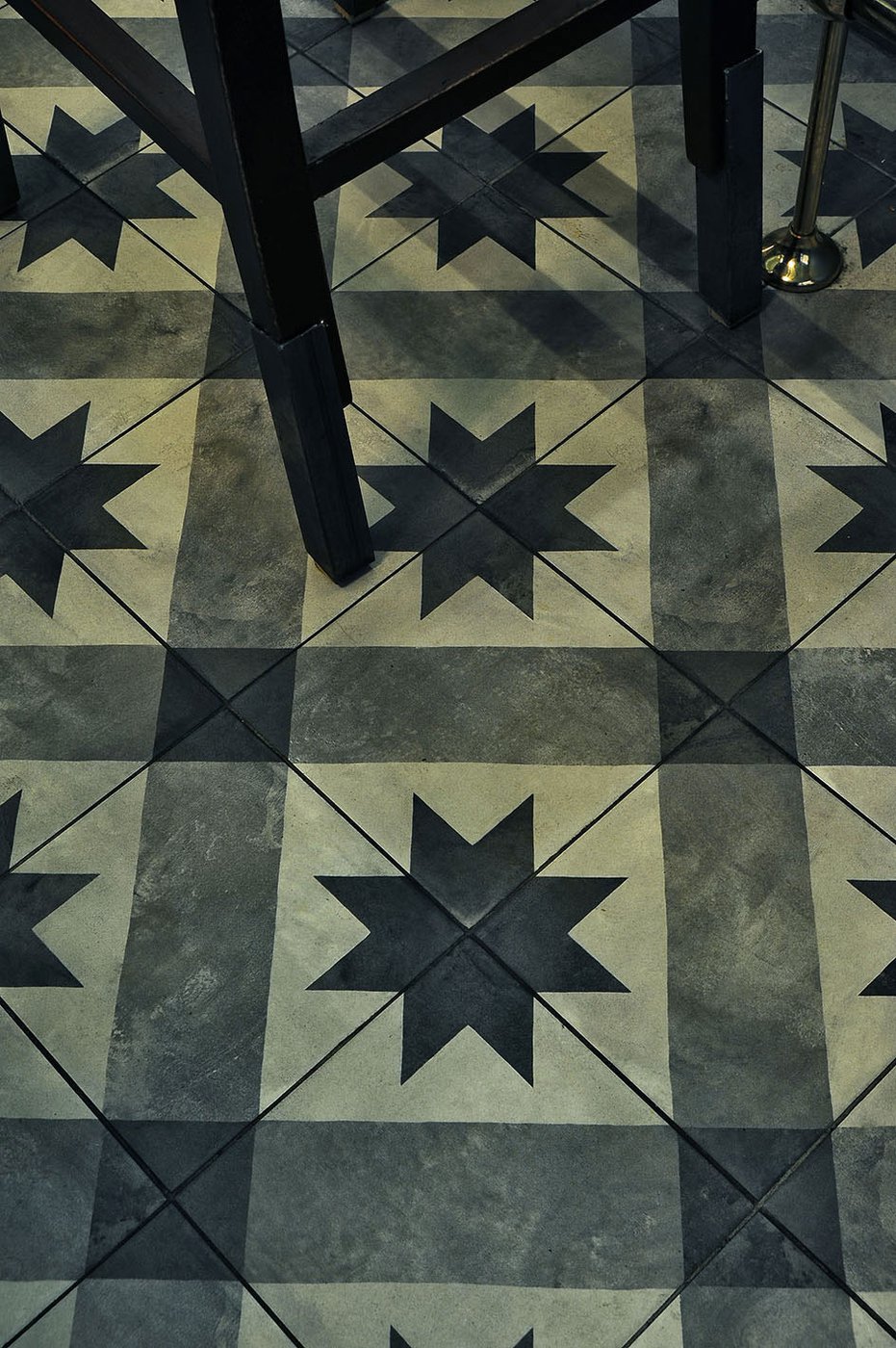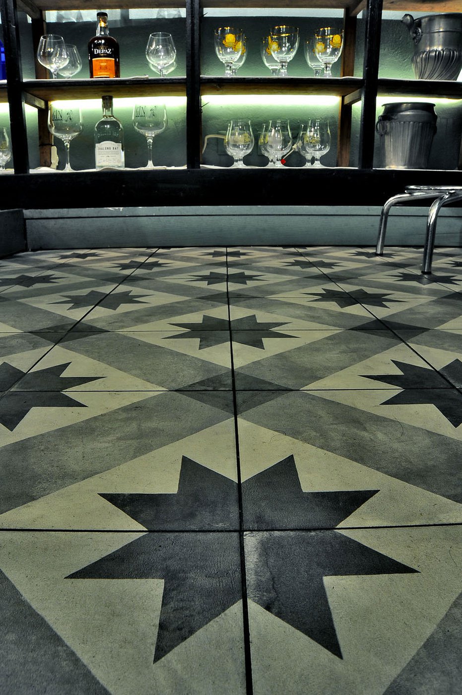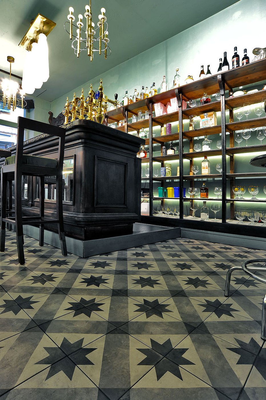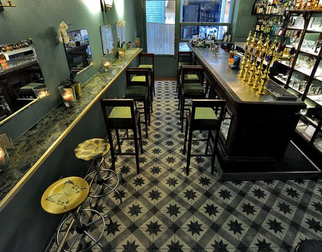 Eine exzentrische Cocktailbar im Herzen von Bologna, ein Ort zum Entspannen und Bewundern der bezaubernden Serie Terra: Die Wände in Salbeigrün und die Theken in Alchimistenmanier werden mit dem Motiv 20x20 Stella kombiniert und schaffen eine vielseitige und raffinierte Atmosphäre. Die Fliesen in Zementoptik 1741 in Grautönen verwandeln sich so in einen eleganten und trendigen Dekorteppich.