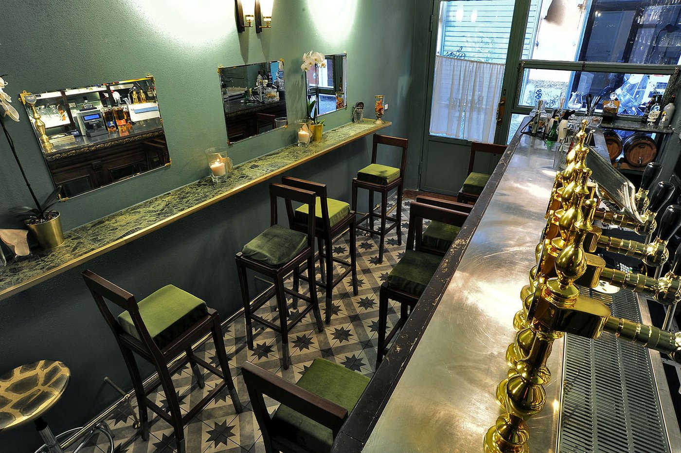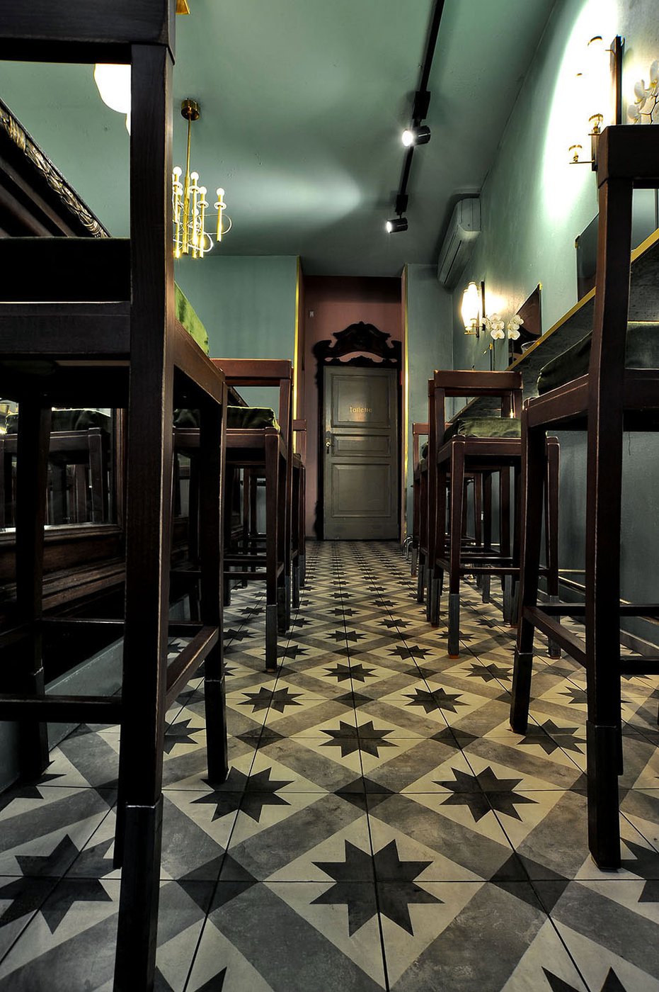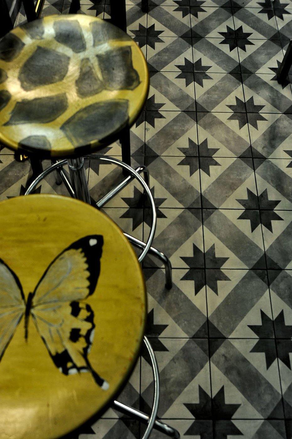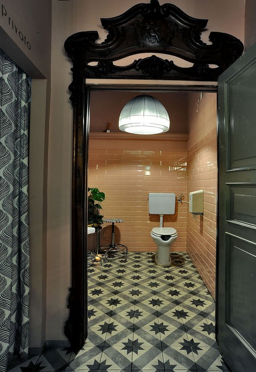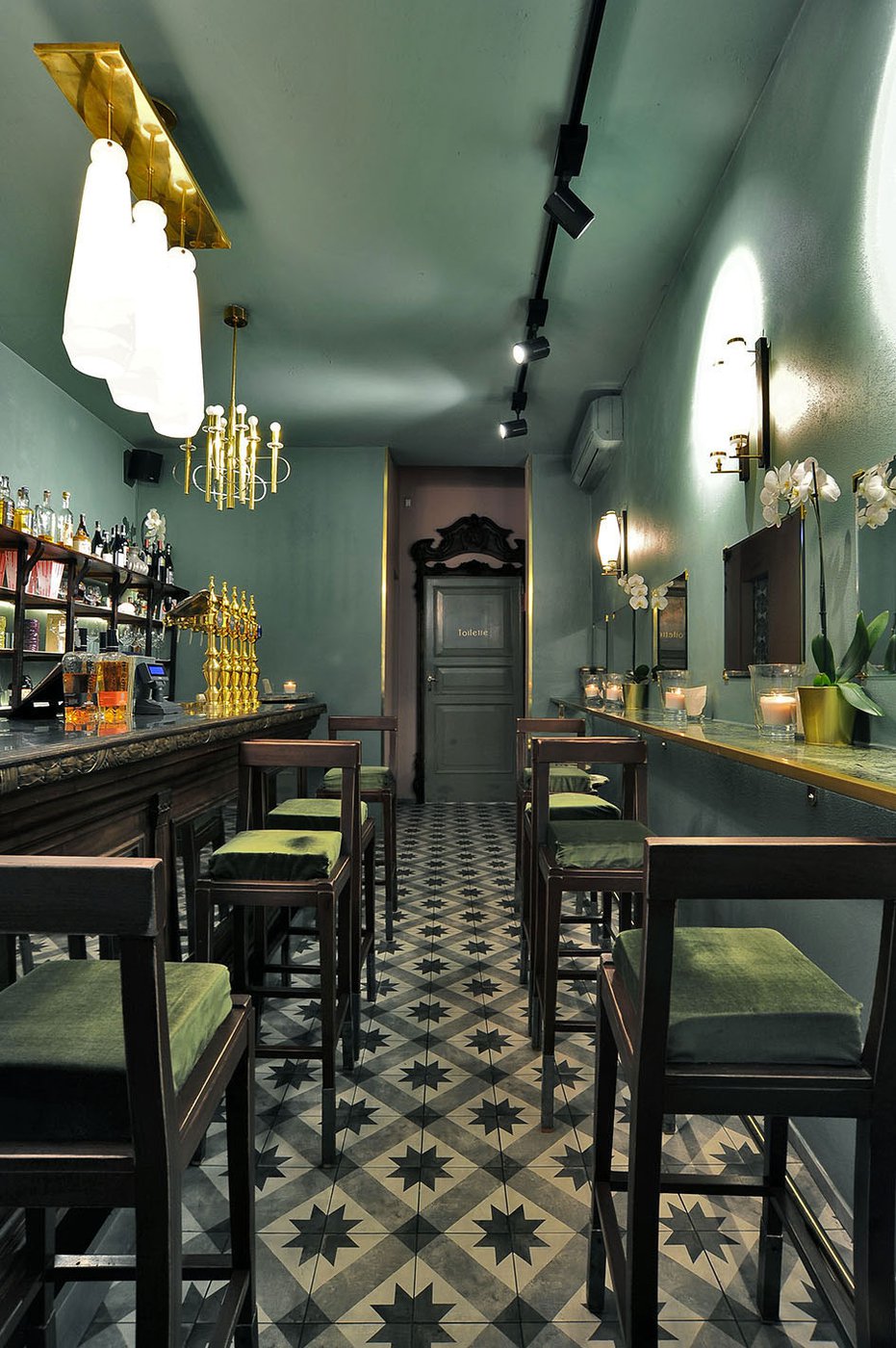 Eine exzentrische Cocktailbar im Herzen von Bologna, ein Ort zum Entspannen und Bewundern der bezaubernden Serie Terra: Die Wände in Salbeigrün und die Theken in Alchimistenmanier werden mit dem Motiv 20x20 Stella kombiniert und schaffen eine vielseitige und raffinierte Atmosphäre. Die Fliesen in Zementoptik 1741 in Grautönen verwandeln sich so in einen eleganten und trendigen Dekorteppich.