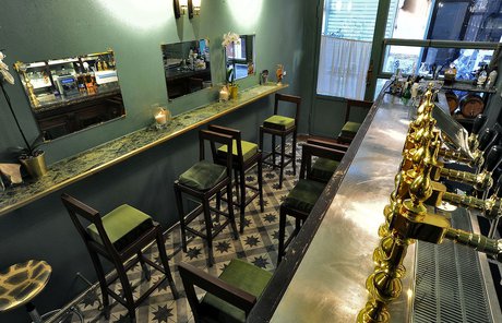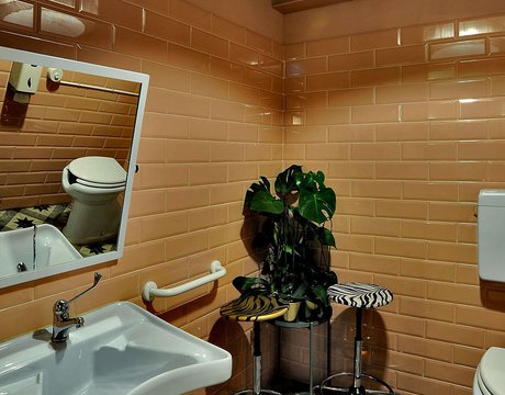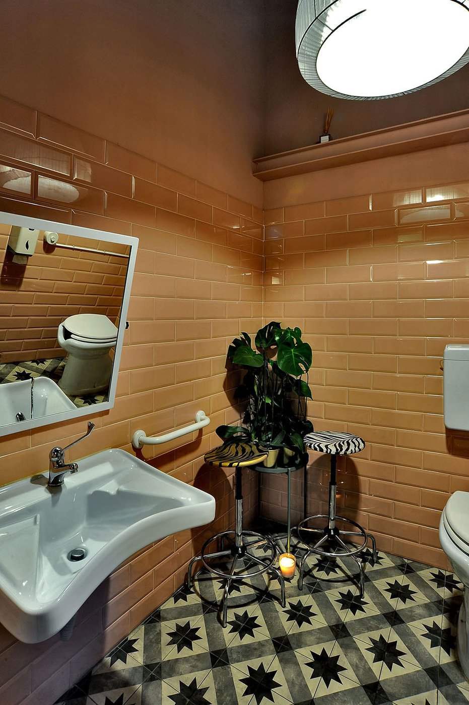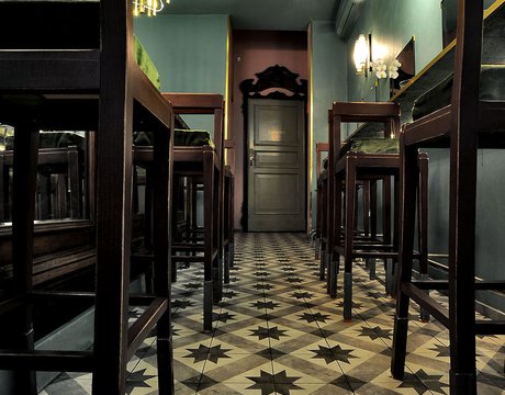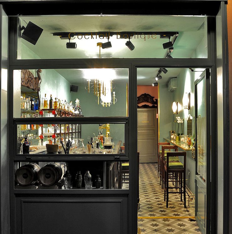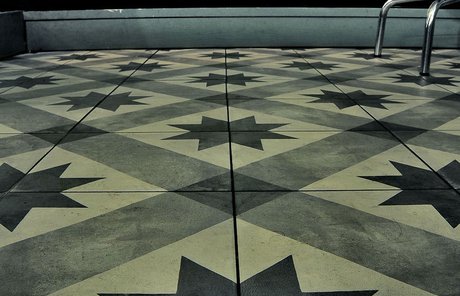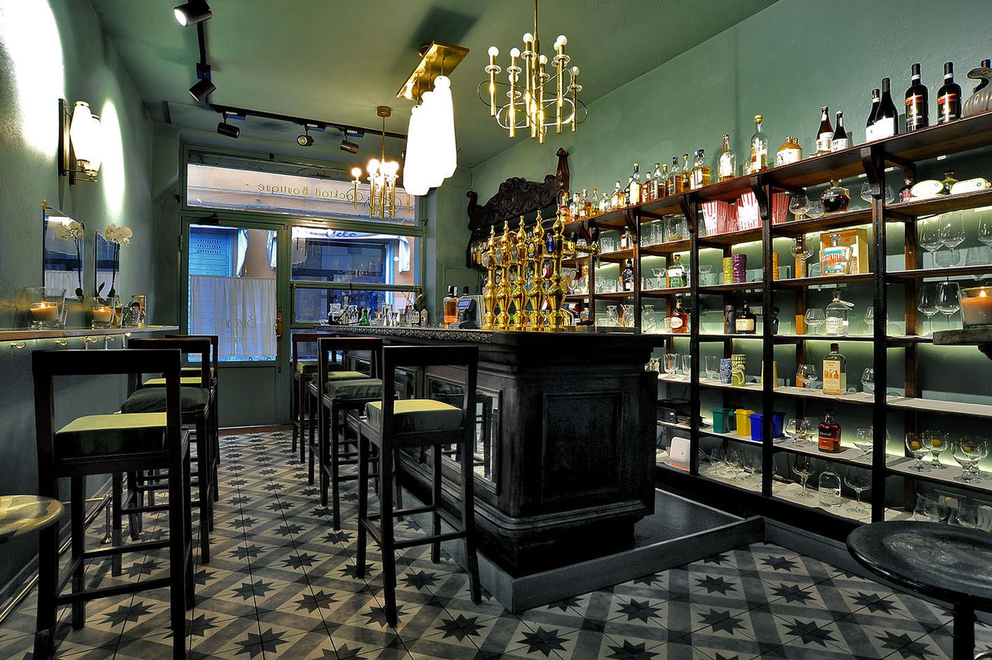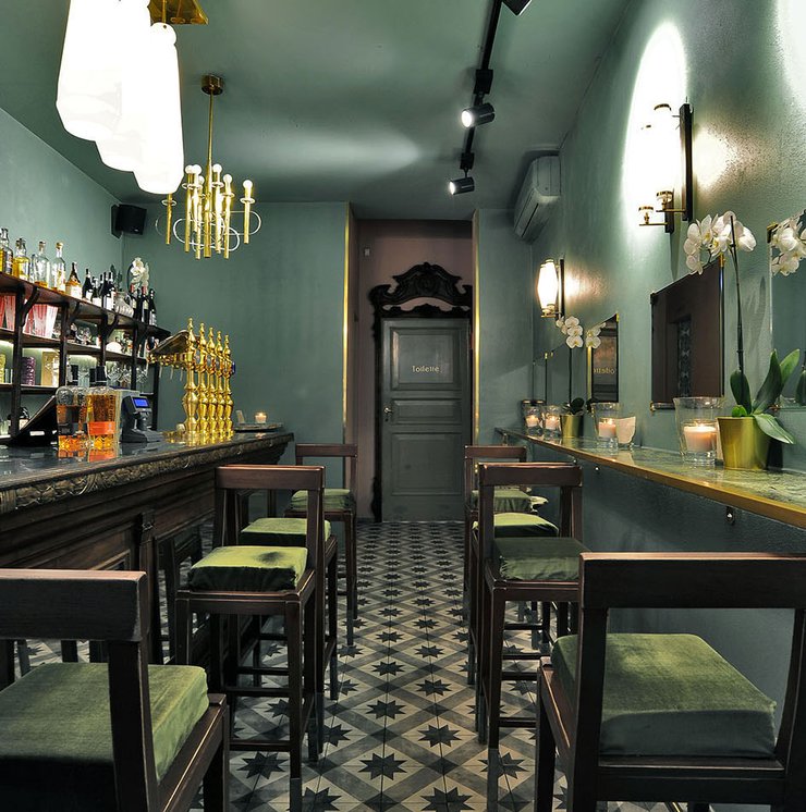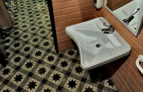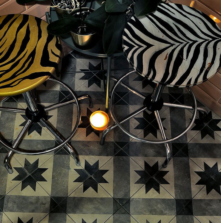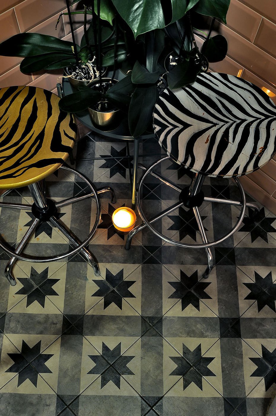 Eine exzentrische Cocktailbar im Herzen von Bologna, ein Ort zum Entspannen und Bewundern der bezaubernden Serie Terra: Die Wände in Salbeigrün und die Theken in Alchimistenmanier werden mit dem Motiv 20x20 Stella kombiniert und schaffen eine vielseitige und raffinierte Atmosphäre. Die Fliesen in Zementoptik 1741 in Grautönen verwandeln sich so in einen eleganten und trendigen Dekorteppich.