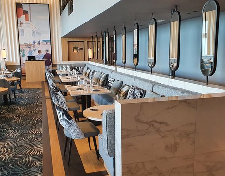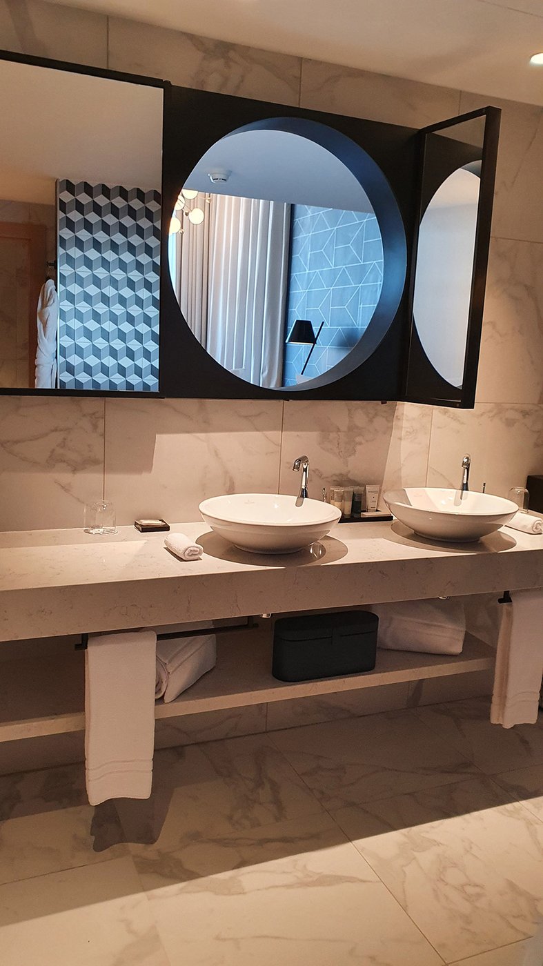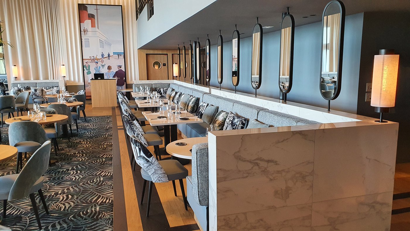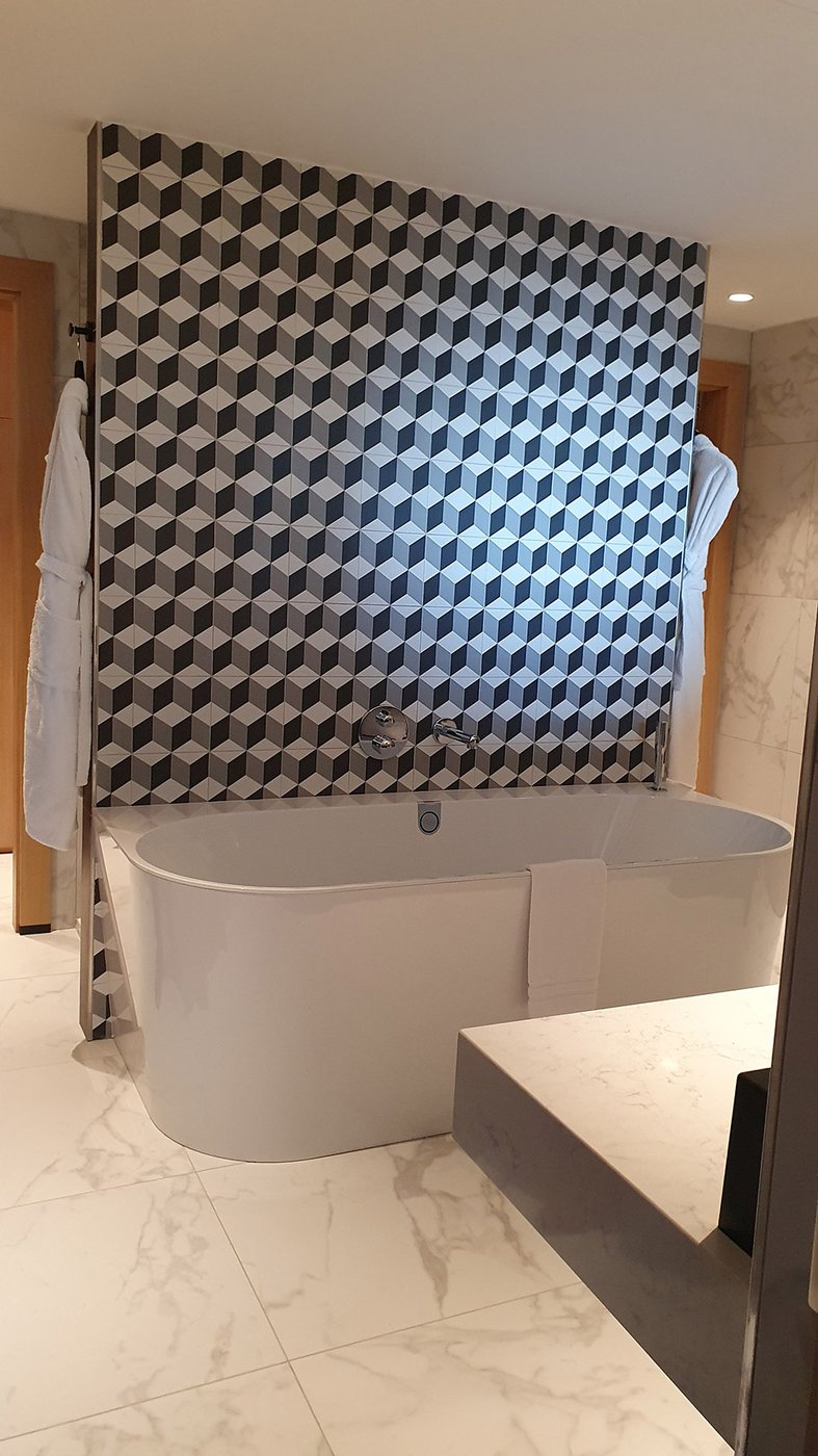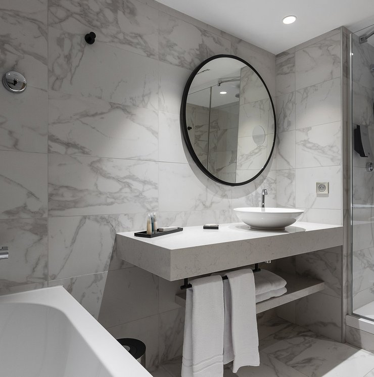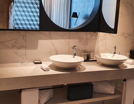 Um den Räumen Glanz und einen Hauch von Glamour zu verleihen, wurden die Feinsteinzeugserie Deluxe, eine Hommage an den luxuriösesten und eklektischsten Marmor, und Motif Extra, eine erhabene Neuinterpretation des Calacatta-Marmors, ausgewählt. Beide Kollektionen wurden an den Wänden und auf den Böden der Zimmer, im exklusiven Restaurant und in den Massagekabinen des Thalasso-Spa verlegt, wobei originelle Strukturteppiche und echte Design-Ecken entstanden sind: eine auffällige und zugleich unglaublich wirksame Lösung, die jede stilistische Entscheidung unterstreicht und die Wahrnehmung von Licht und Raum vervielfacht, ohne dabei die glamouröse und opulente Ausstrahlung zu verlieren.