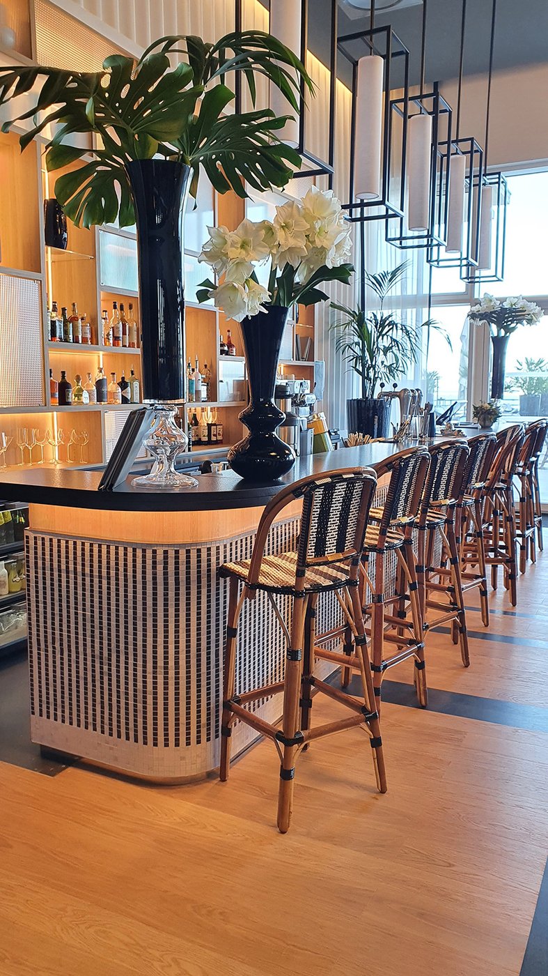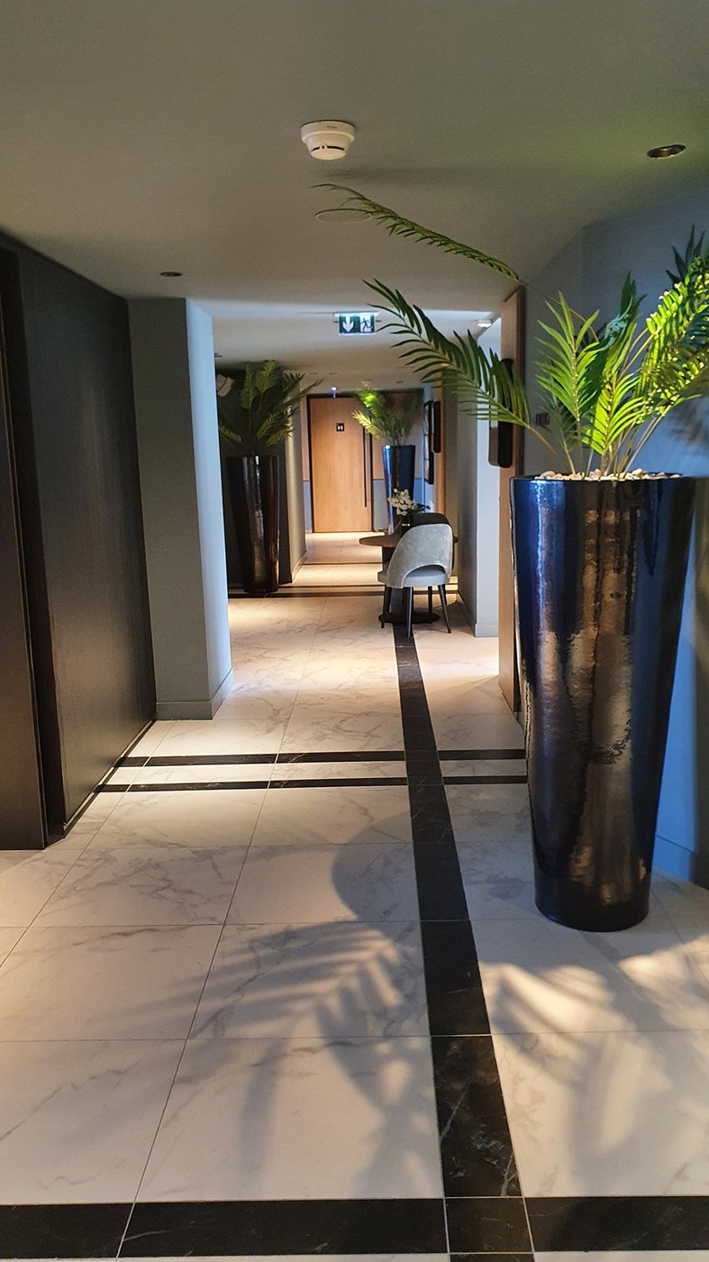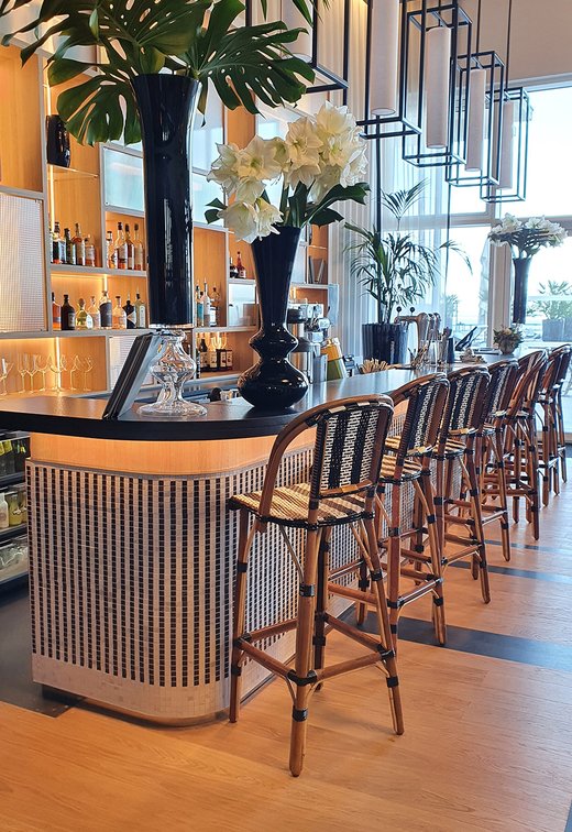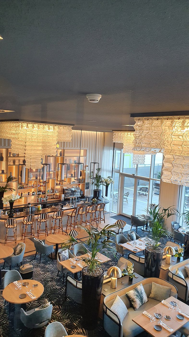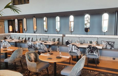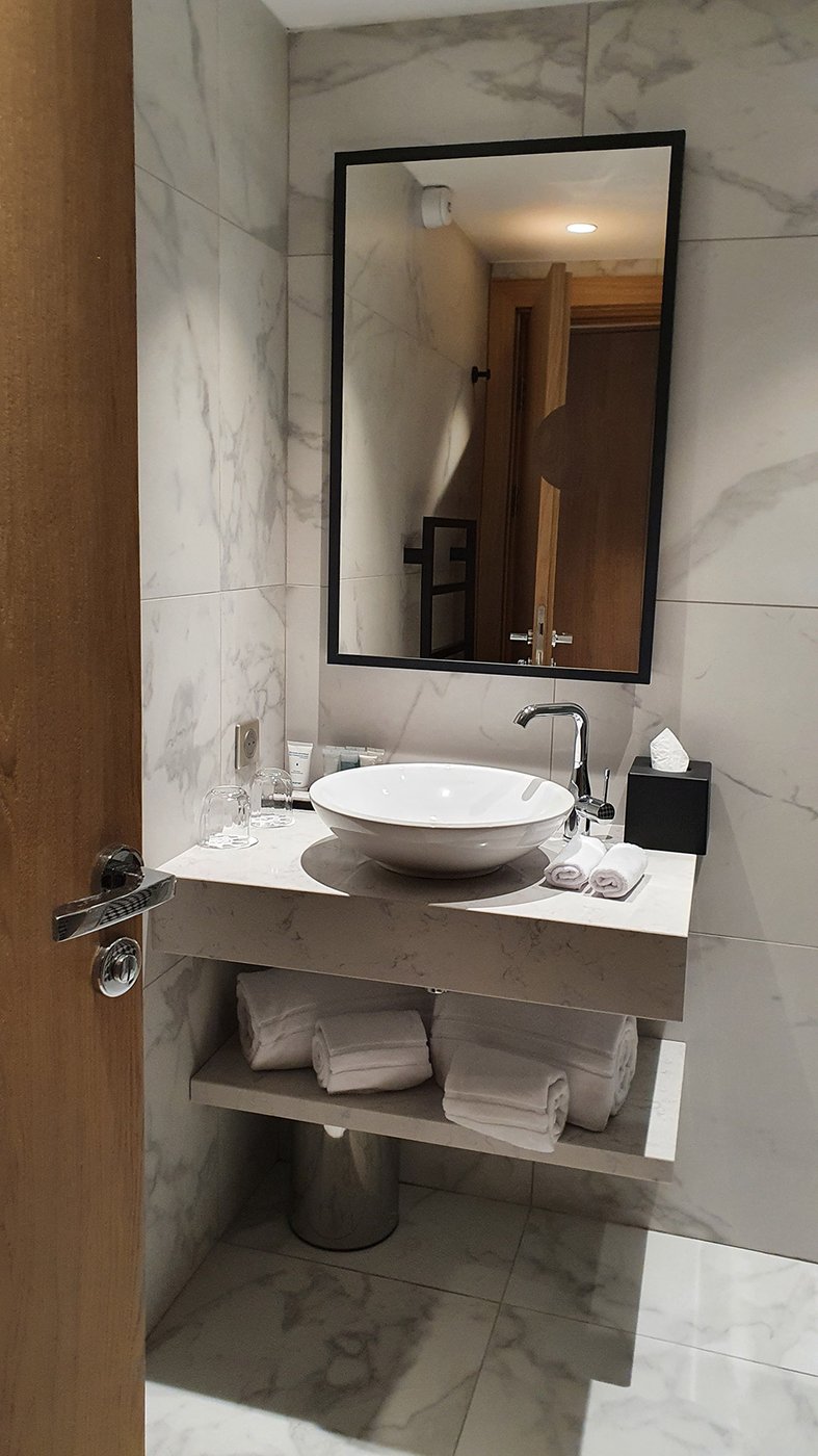 Um den Räumen Glanz und einen Hauch von Glamour zu verleihen, wurden die Feinsteinzeugserie Deluxe, eine Hommage an den luxuriösesten und eklektischsten Marmor, und Motif Extra, eine erhabene Neuinterpretation des Calacatta-Marmors, ausgewählt. Beide Kollektionen wurden an den Wänden und auf den Böden der Zimmer, im exklusiven Restaurant und in den Massagekabinen des Thalasso-Spa verlegt, wobei originelle Strukturteppiche und echte Design-Ecken entstanden sind: eine auffällige und zugleich unglaublich wirksame Lösung, die jede stilistische Entscheidung unterstreicht und die Wahrnehmung von Licht und Raum vervielfacht, ohne dabei die glamouröse und opulente Ausstrahlung zu verlieren.