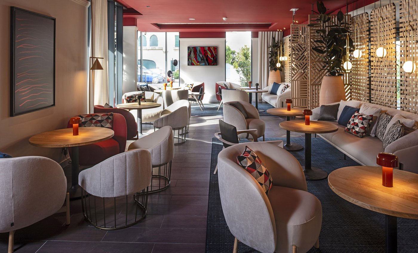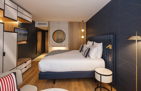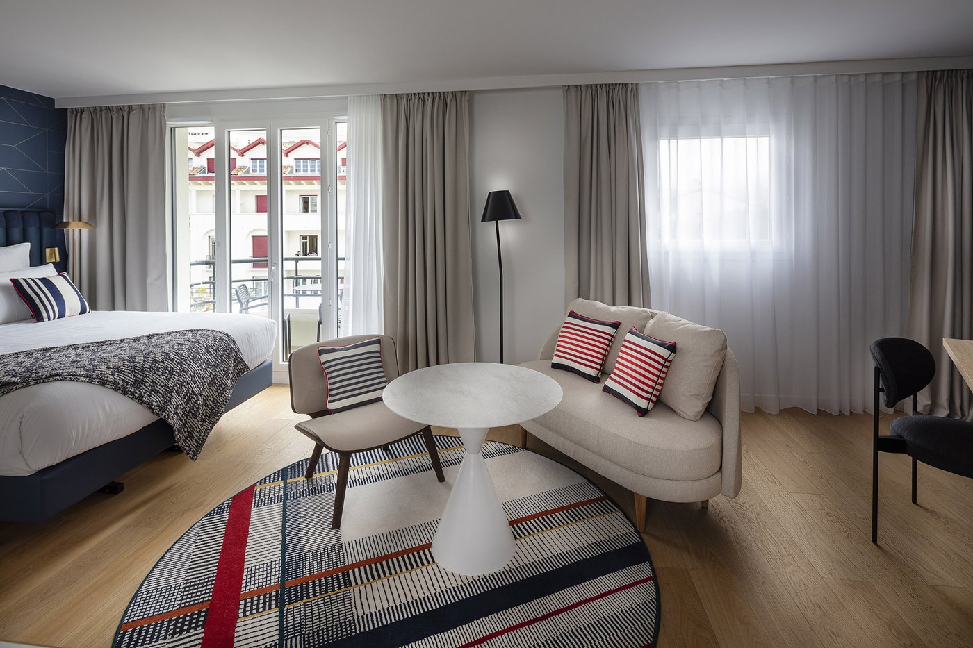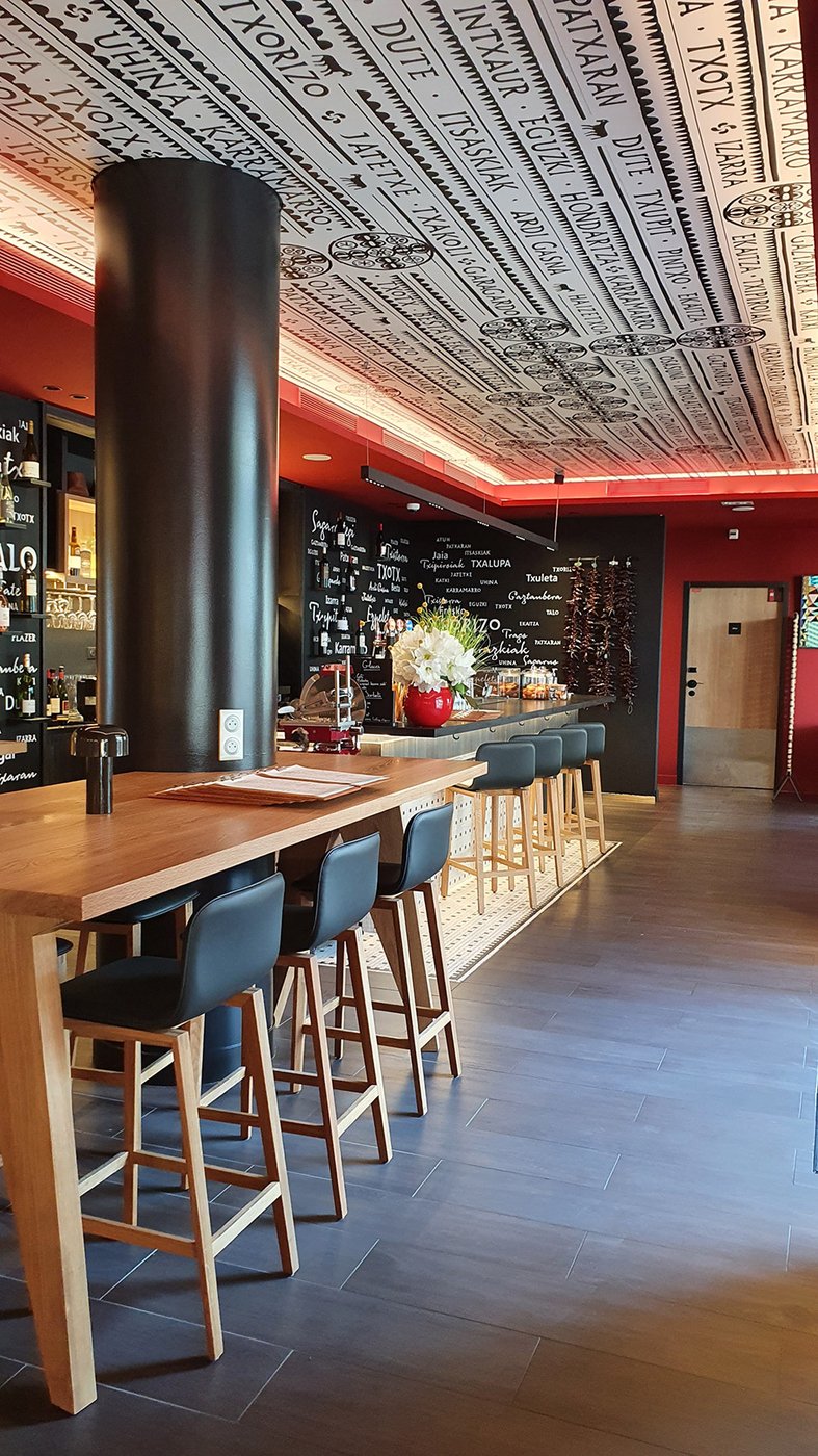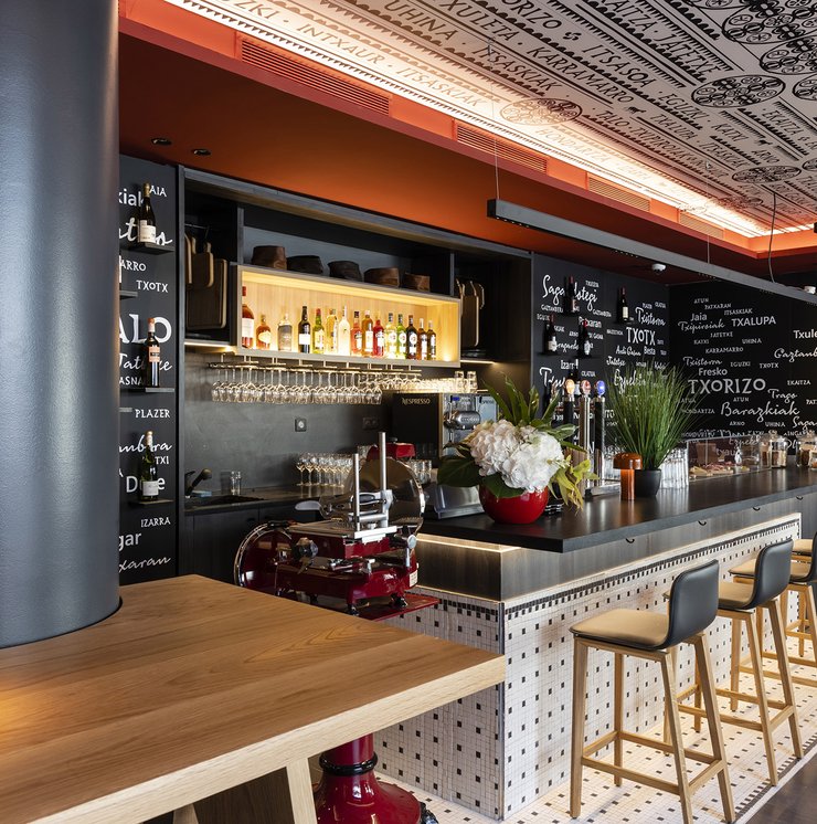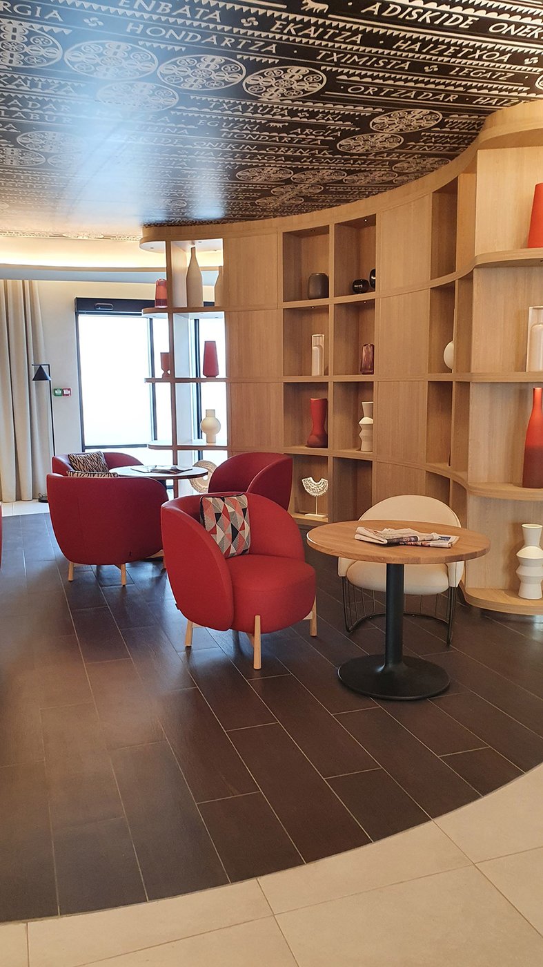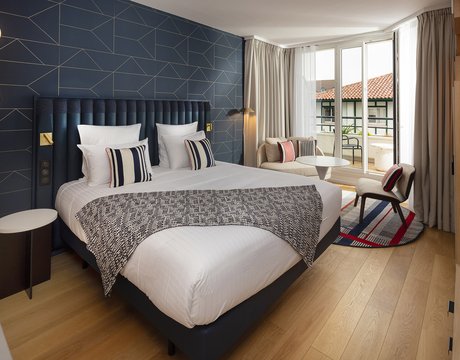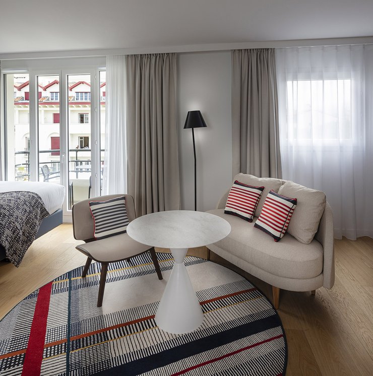 Die Wette wurde sozusagen gewonnen, um es vorsichtig auszudrücken! Die baskische Identität und die Art-Déco-Kontaminationen des Gebäudes werden in den Gemeinschaftsbereichen und den 106 Zimmern des Hotels durch die Wahl von emblematischen Elementen wie die Farben der Region (rot und blau) und der Präsenz von Gegenständen und Dekorationen aus dem lokalen Kunsthandwerk respektiert und aufgewertet. Eklektische, designorientierte Möbel wurden mit Oberflächen und Verarbeitungen von zeitloser Eleganz und Exklusivität kombiniert, die mit natürlichen, von der Umwelt inspirierten Materialien kombiniert wurden.