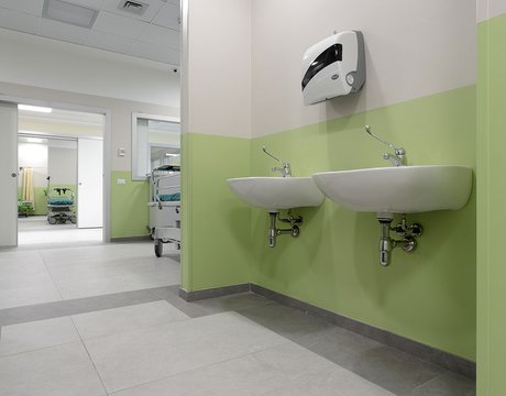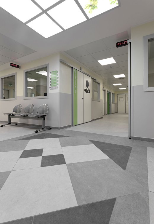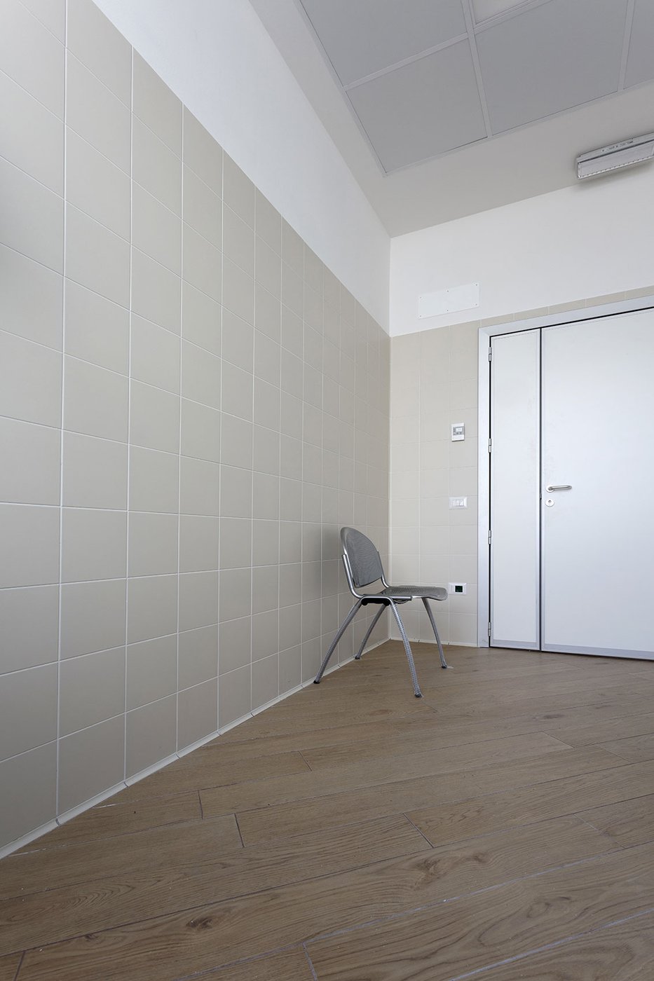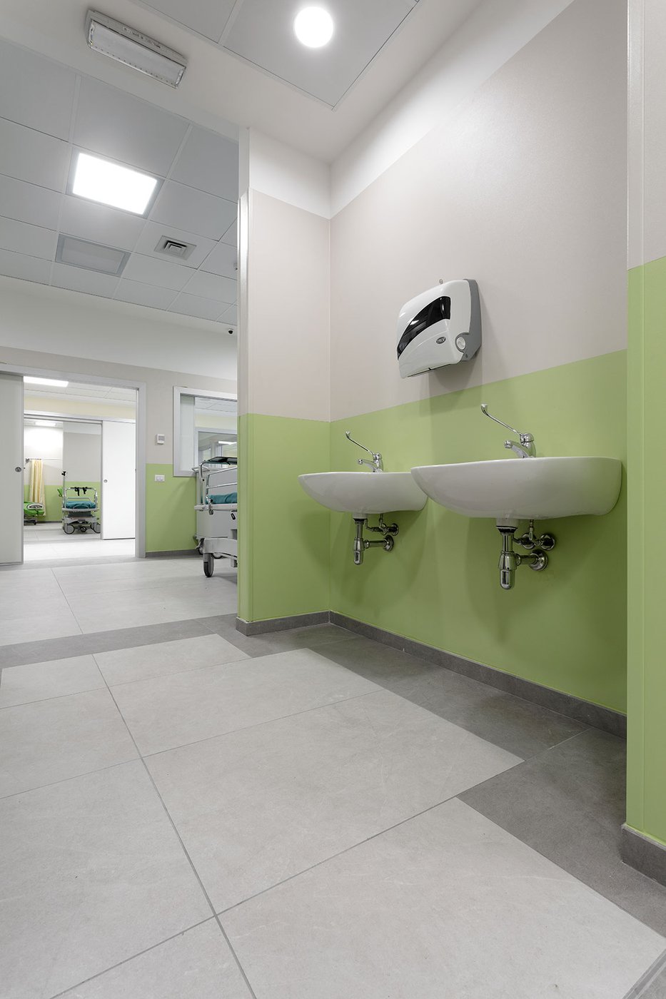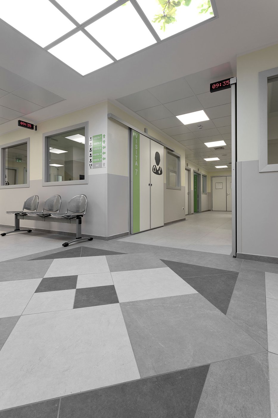 Die 3 gewählten Kollektionen von Marca Corona sind in allen Räumen der neuen Notfallabteilung zu finden. Die Fußböden mit Steinoptik von Arkistone sorgen im Empfangsbereich, den Gängen, Wartesälen und allen Behandlungsräumen der Patienten für ein angenehmes Spiel mit den Geometrien und der Farbe. In den für das Personal gedachten Räumen wie den Büros und der Küche hingegen wurden die Fußböden mit Holzoptik Lagom und die Verkleidungen Color Mix verlegt, die in warmen, neutralen Farbtönen gewählt wurden, um ein Gefühl der Intimität und Unbeschwertheit zu vermitteln. Die Toiletten zeichnen sich hingegen durch die in originellen Farbkombinationen vorgeschlagenen Fußböden und Verkleidungen Color Mix aus.