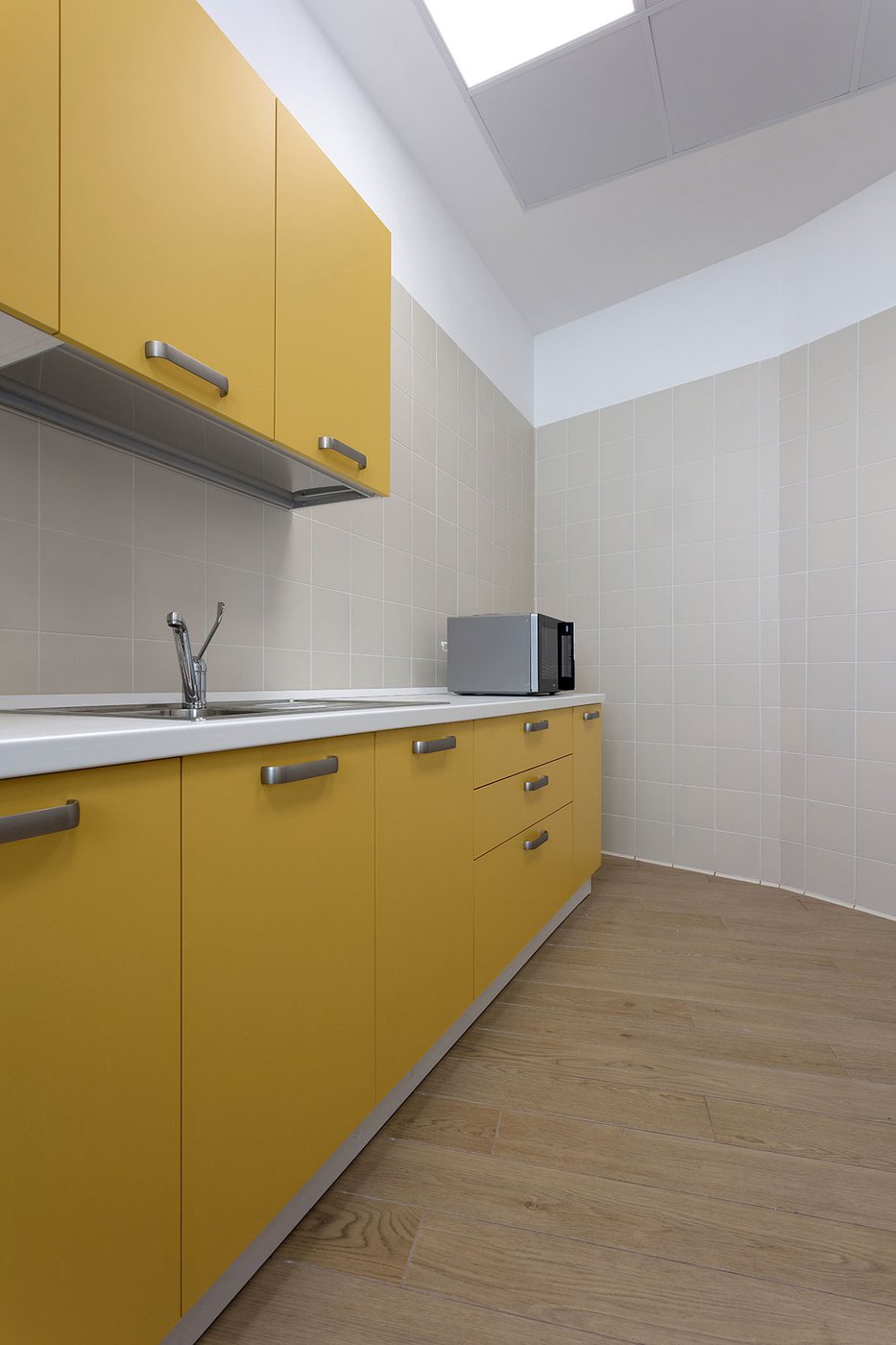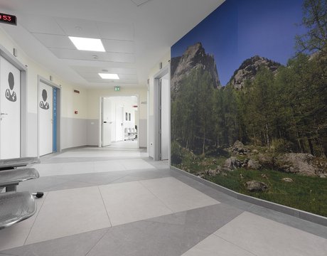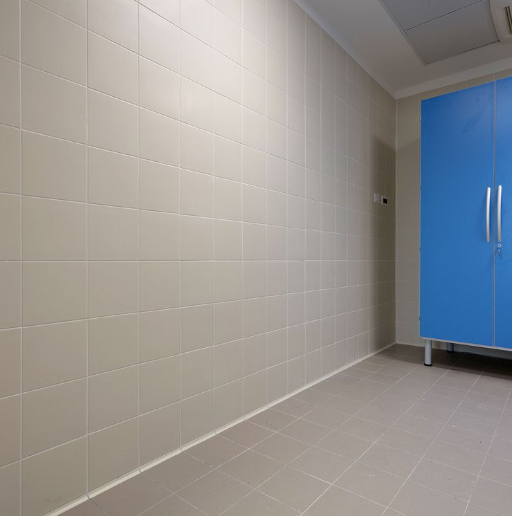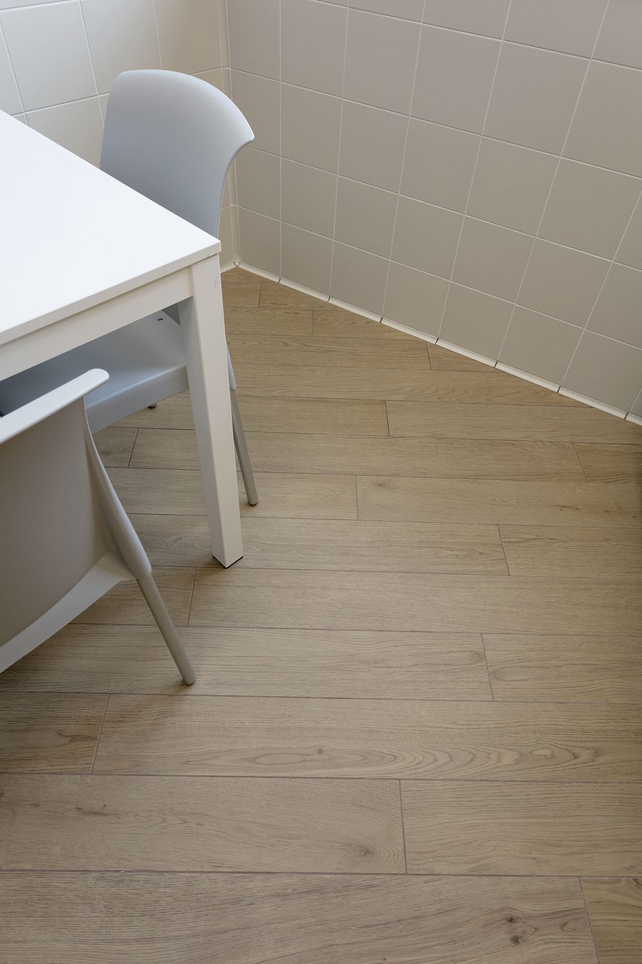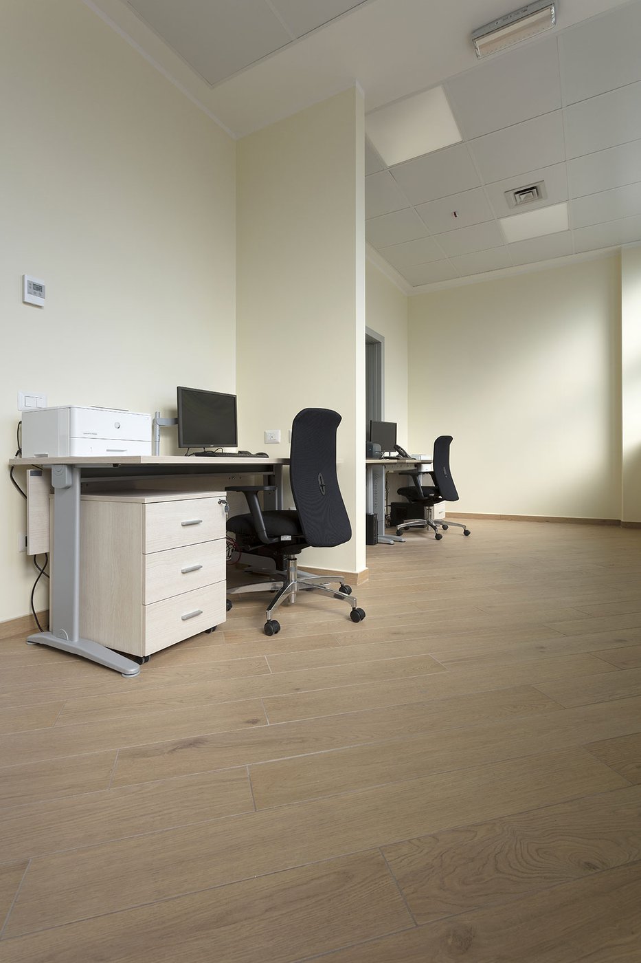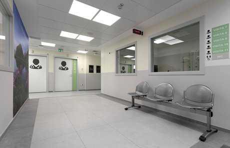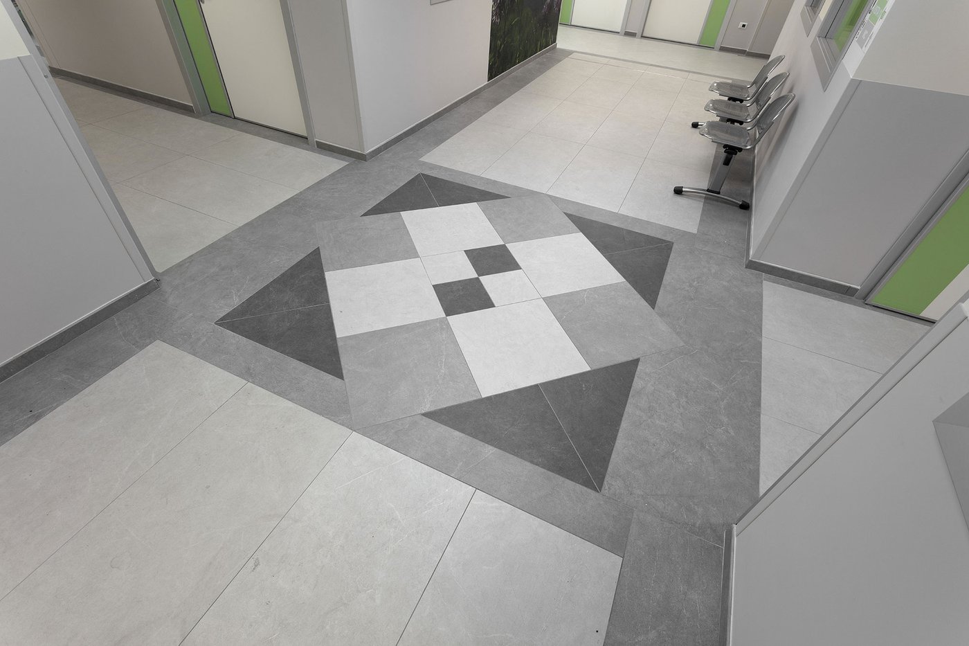 Die 3 gewählten Kollektionen von Marca Corona sind in allen Räumen der neuen Notfallabteilung zu finden. Die Fußböden mit Steinoptik von Arkistone sorgen im Empfangsbereich, den Gängen, Wartesälen und allen Behandlungsräumen der Patienten für ein angenehmes Spiel mit den Geometrien und der Farbe. In den für das Personal gedachten Räumen wie den Büros und der Küche hingegen wurden die Fußböden mit Holzoptik Lagom und die Verkleidungen Color Mix verlegt, die in warmen, neutralen Farbtönen gewählt wurden, um ein Gefühl der Intimität und Unbeschwertheit zu vermitteln. Die Toiletten zeichnen sich hingegen durch die in originellen Farbkombinationen vorgeschlagenen Fußböden und Verkleidungen Color Mix aus.