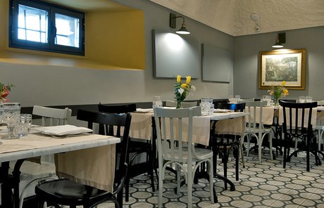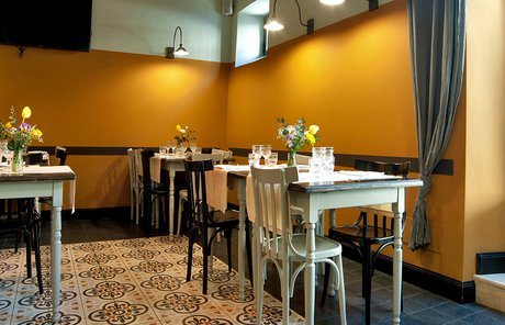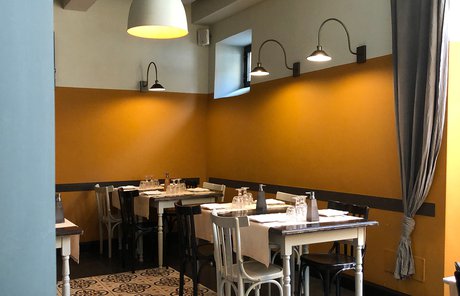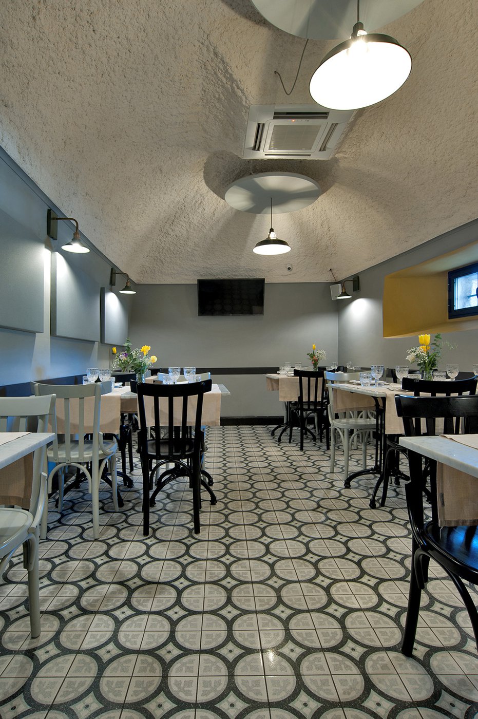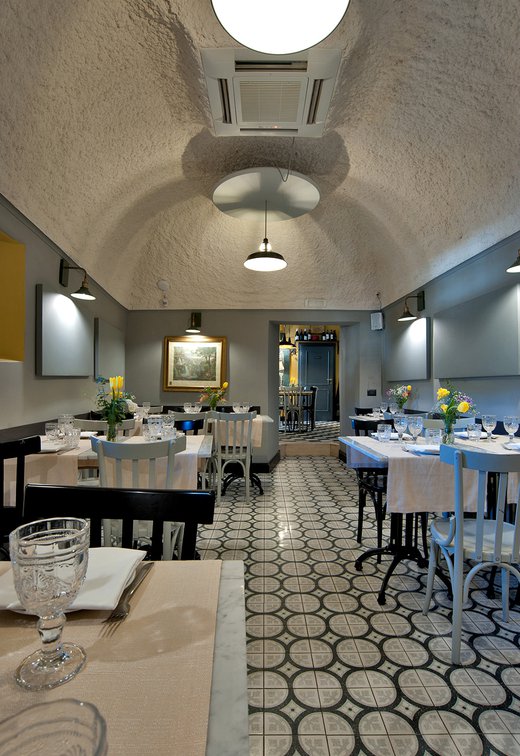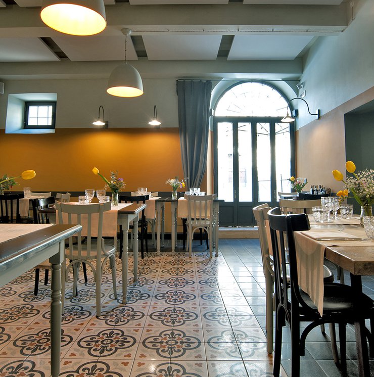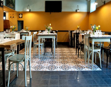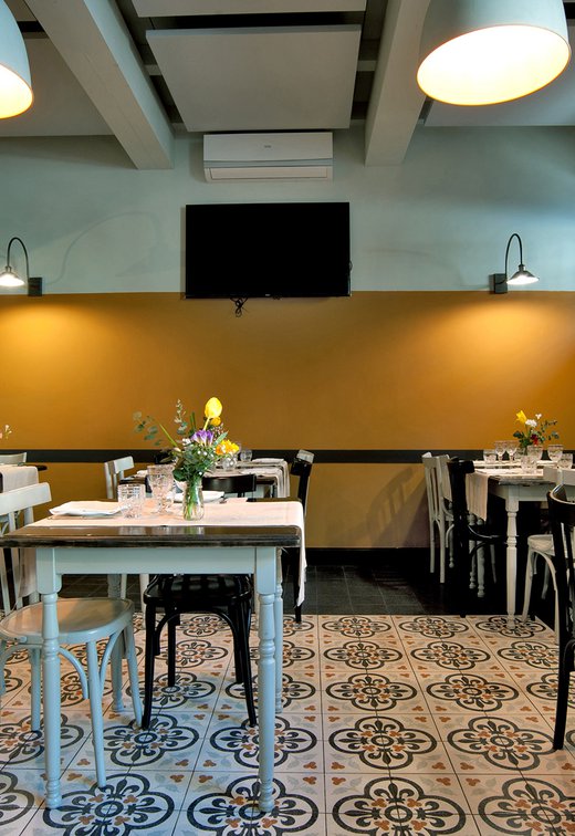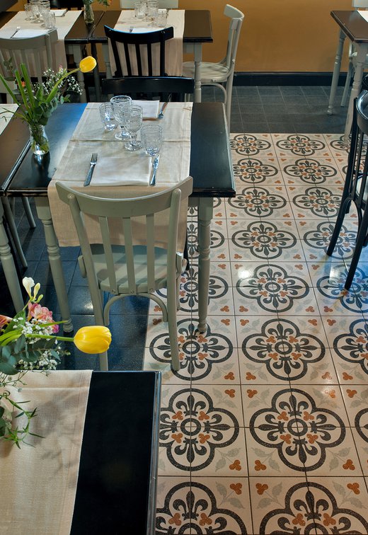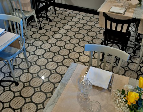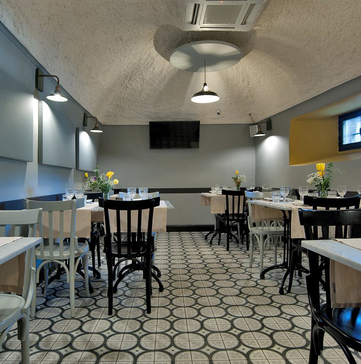 Um dieses Restaurant im Zentrum von Tivoli mit einem intimen Retrocharakter zu prägen, wurden die Zementfliesen mit Terrazzo-Optik von Forme gewählt. Die Fußböden und Verkleidungen aus Feinsteinzeug von Marca Corona geben zweifellos den Ton in diesem raffinierten Lokal an: Sie empfangen die Gäste bereits beim Eingang und begleiten sie in die verschiedenen Säle, in den Tresen- und Ofenbereich bis hin zu den Toiletten.