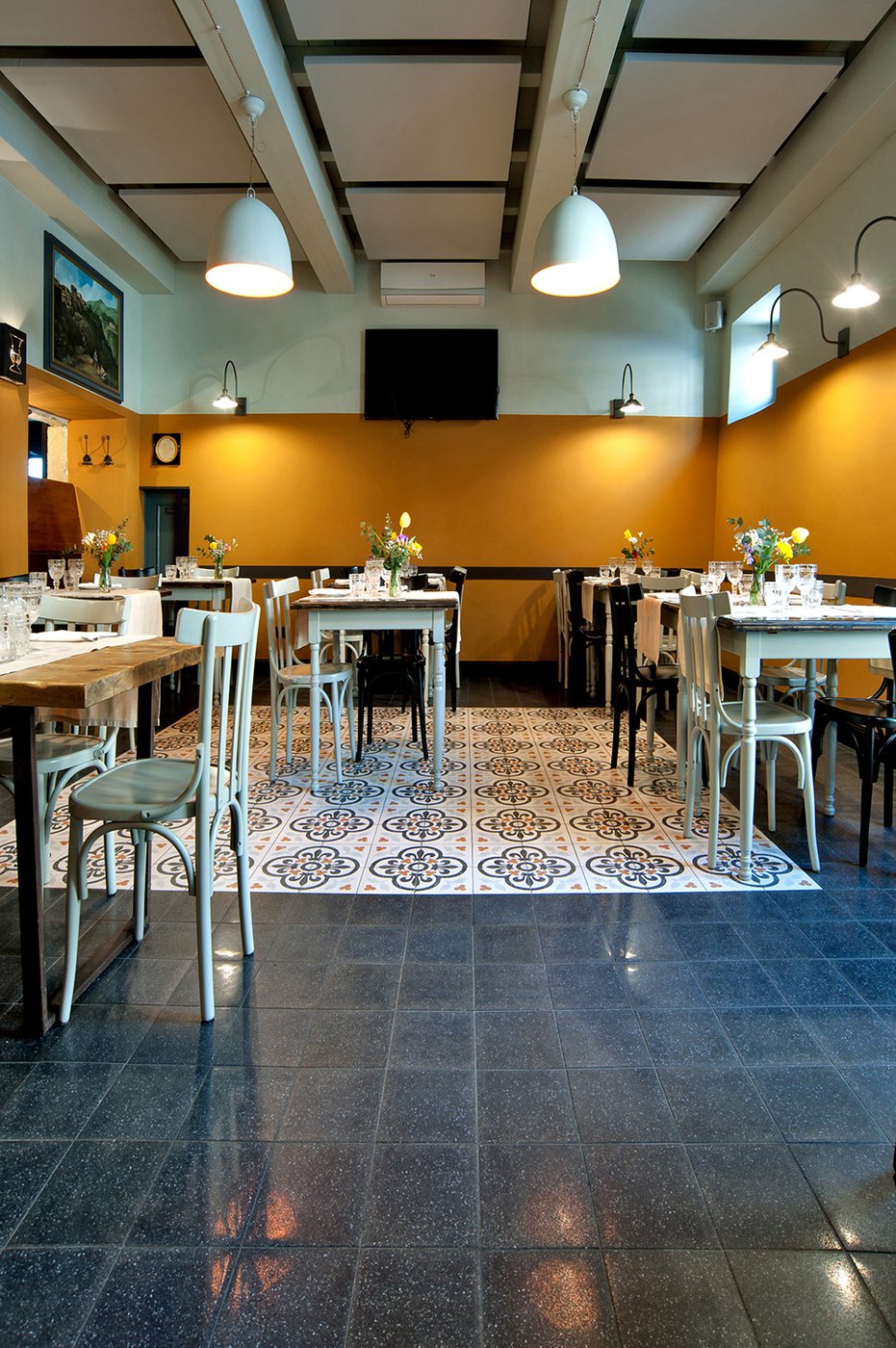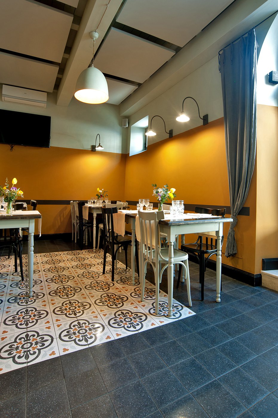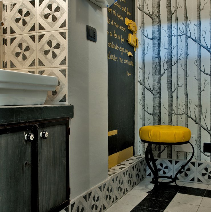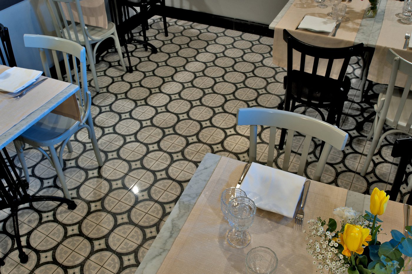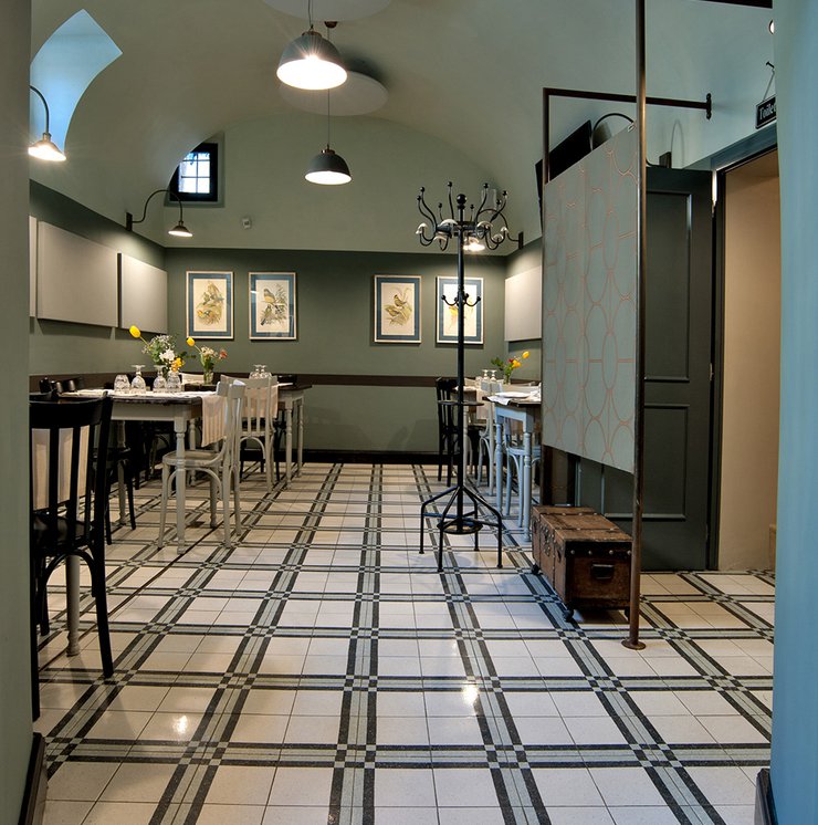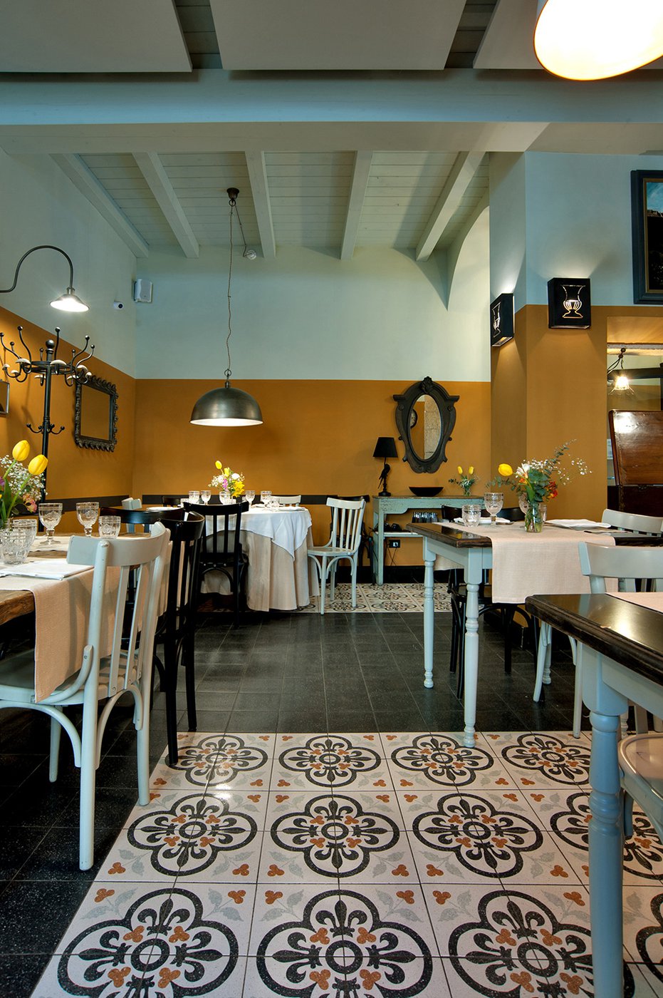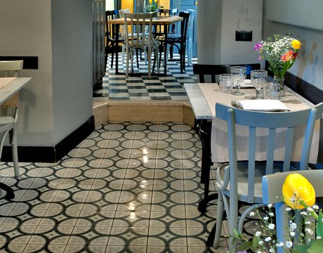 Das raffinierte Design und die exzentrischen Details des Lokals werden durch diese kleinen Formate mit Vintage-Chic-Persönlichkeit zur Geltung gebracht: Die einzelnen Räume sind durch jeweils unterschiedliche geometrische Muster und Blumenmuster geprägt, bei deren Auswahl mit ansprechenden aufeinander abgestimmten oder kontrastierenden Farbakzenten gespielt wurde.
