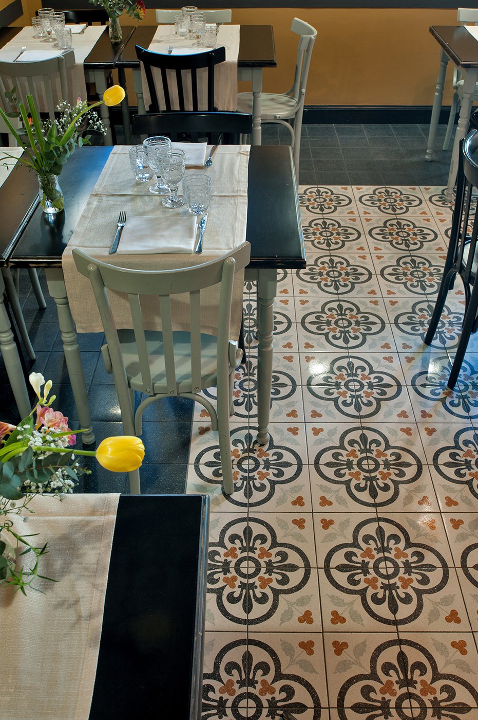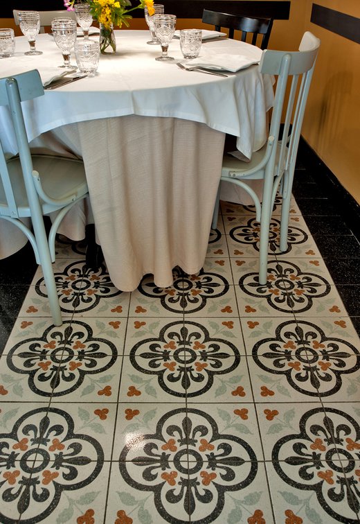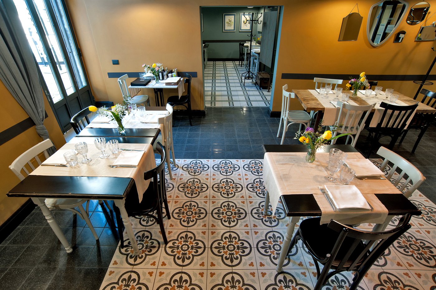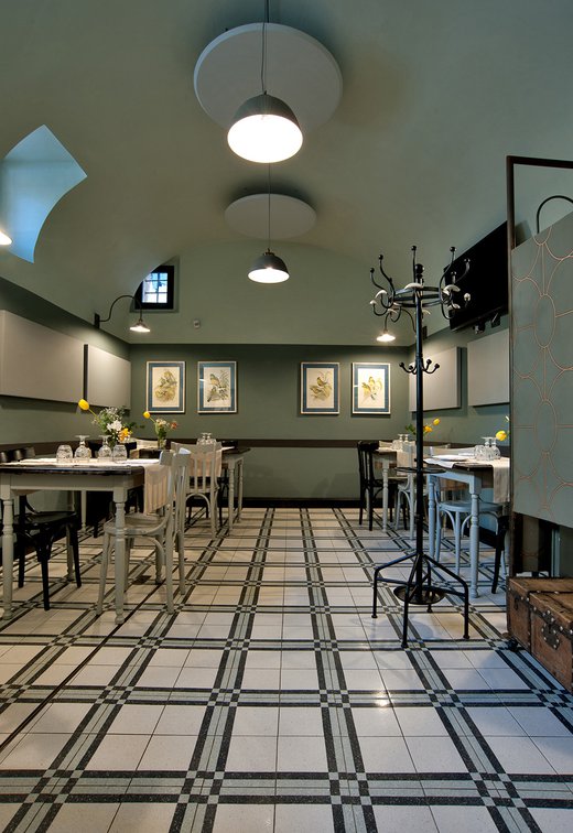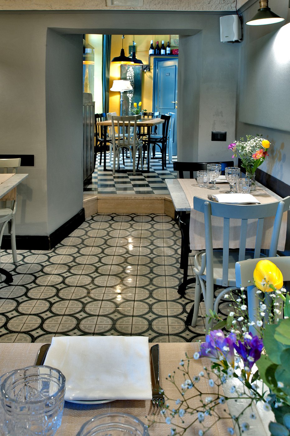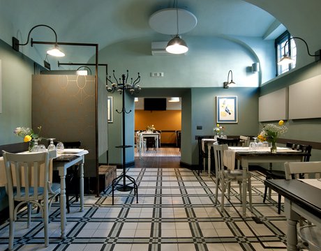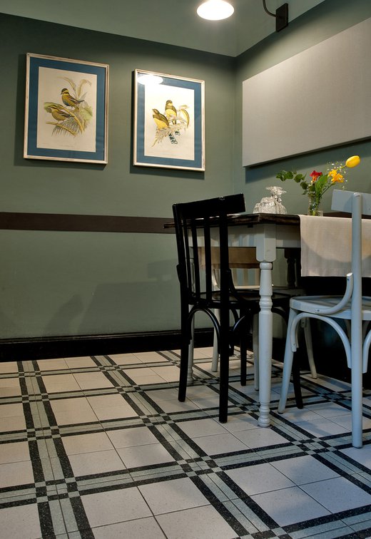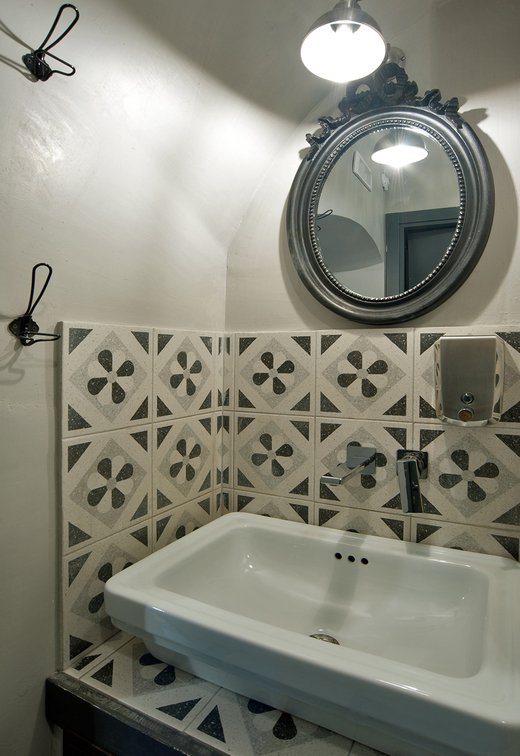 Das raffinierte Design und die exzentrischen Details des Lokals werden durch diese kleinen Formate mit Vintage-Chic-Persönlichkeit zur Geltung gebracht: Die einzelnen Räume sind durch jeweils unterschiedliche geometrische Muster und Blumenmuster geprägt, bei deren Auswahl mit ansprechenden aufeinander abgestimmten oder kontrastierenden Farbakzenten gespielt wurde.