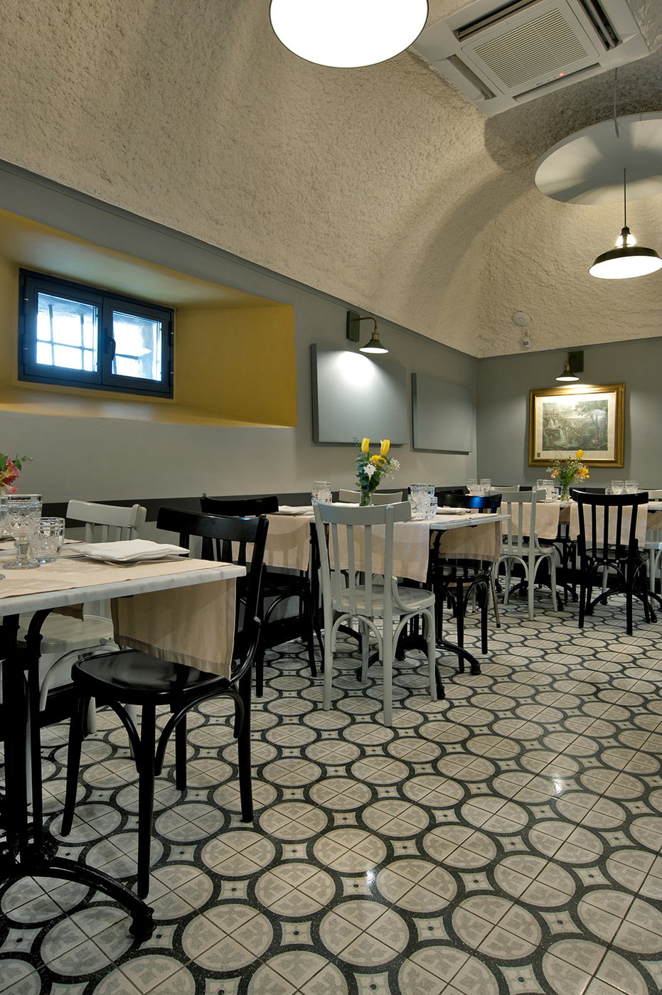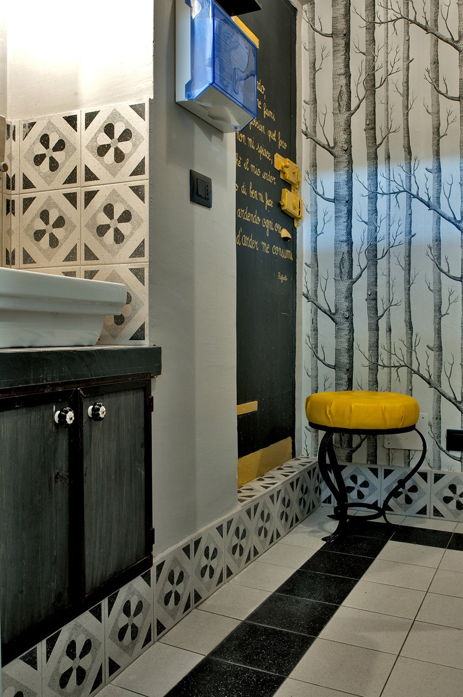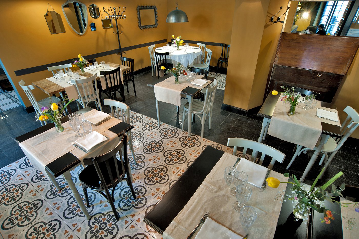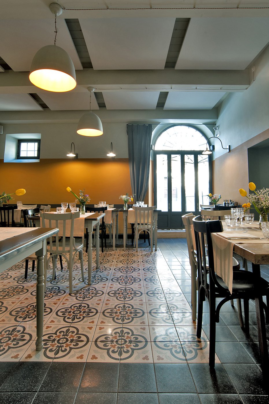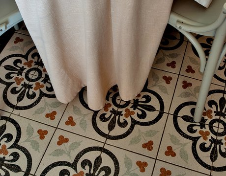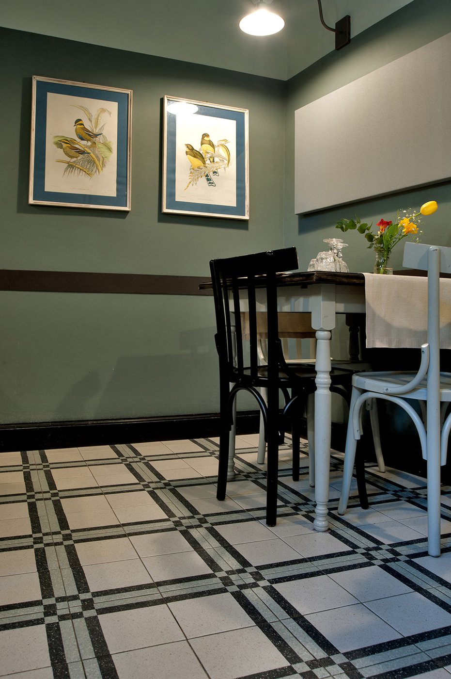 Das raffinierte Design und die exzentrischen Details des Lokals werden durch diese kleinen Formate mit Vintage-Chic-Persönlichkeit zur Geltung gebracht: Die einzelnen Räume sind durch jeweils unterschiedliche geometrische Muster und Blumenmuster geprägt, bei deren Auswahl mit ansprechenden aufeinander abgestimmten oder kontrastierenden Farbakzenten gespielt wurde.