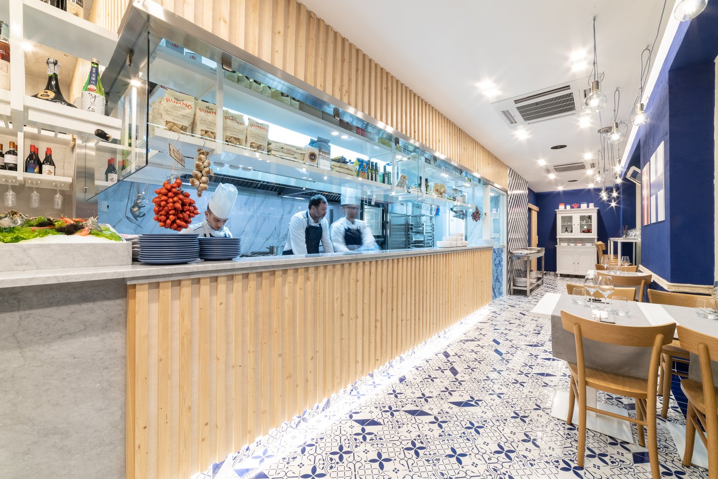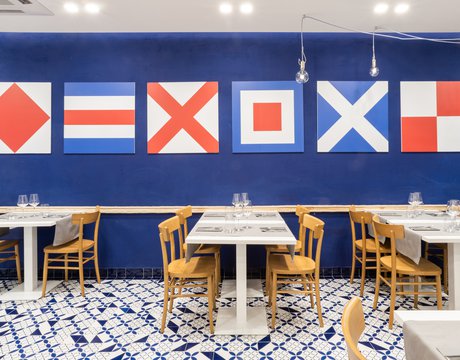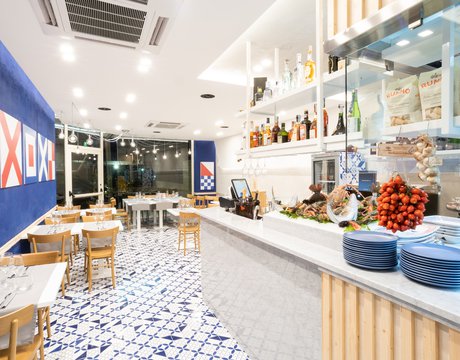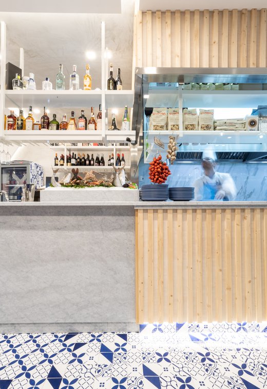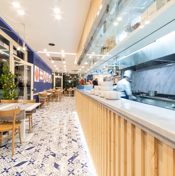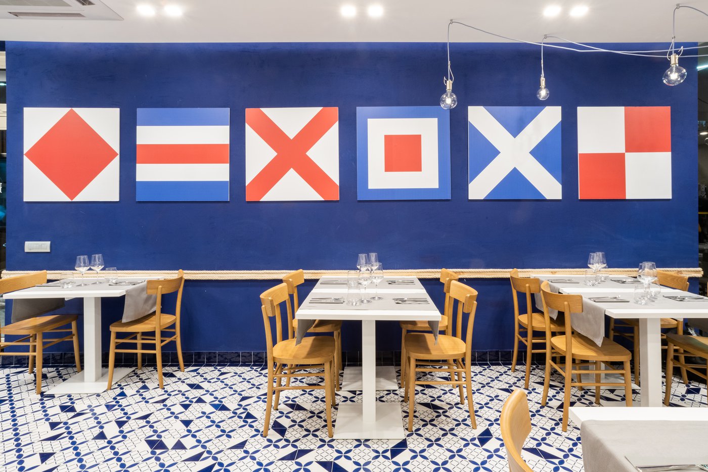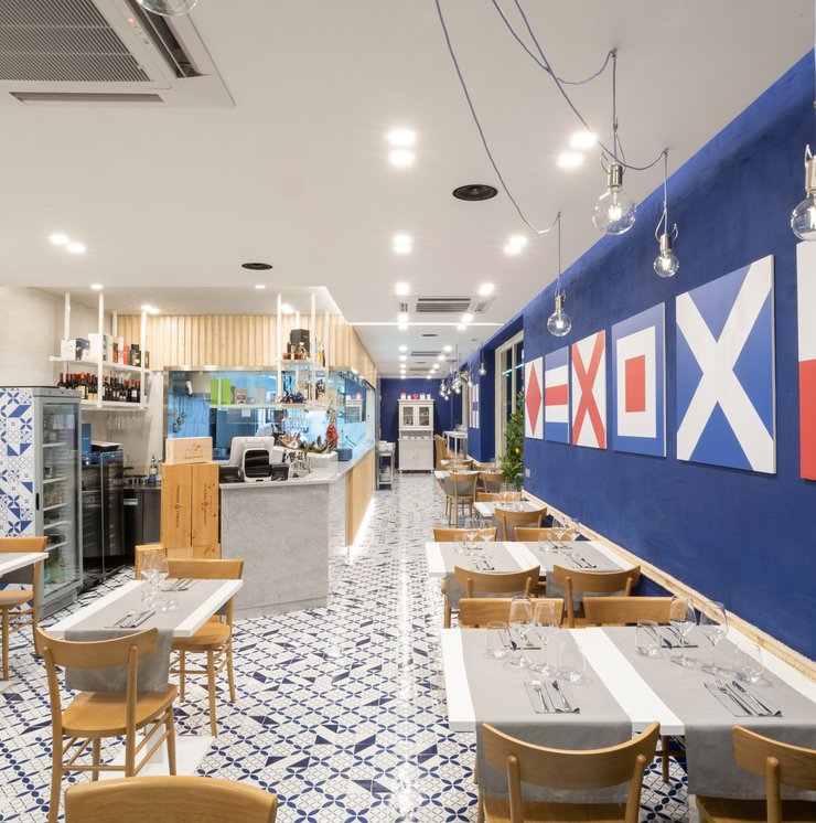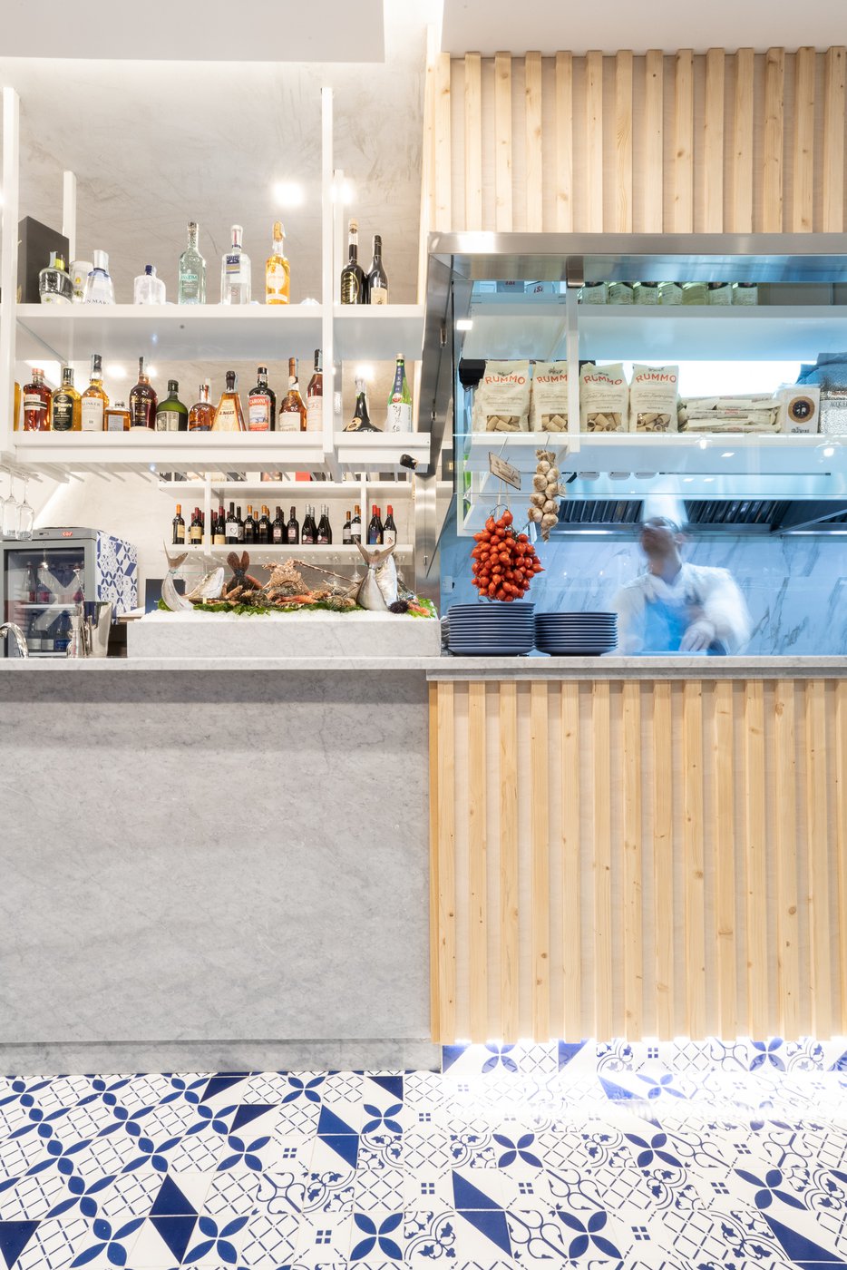 Ein Meeresspezialitätenrestaurant in der Nähe von Caserta mit jungem, unbeschwertem Design. Den Ton geben hier die Farbe blau und die Lebendigkeit der Kollektion Maiolica an: Das kleine Format 10x10 verleiht dem ganzen Lokal einen eindeutig frischen und exzentrischen Akzent. Der originelle Dekor-Mix wird in eine Tischplatte verwandelt und von den blauen Grundfliesen eingerahmt auf dem Fußboden des großen Restaurantsaals verwendet. Das Motiv Triangolo hingegen sorgt für amüsante Geometrien auf der Wand neben der offenen Küche aus hellem Holz.