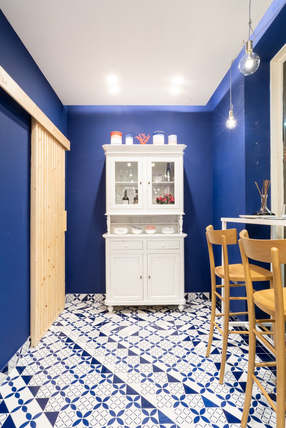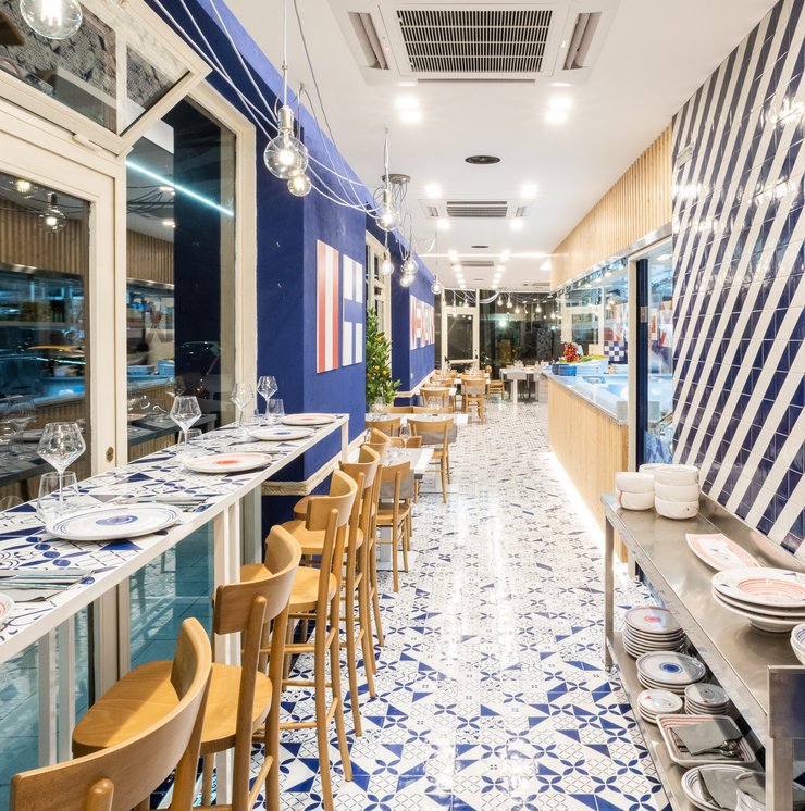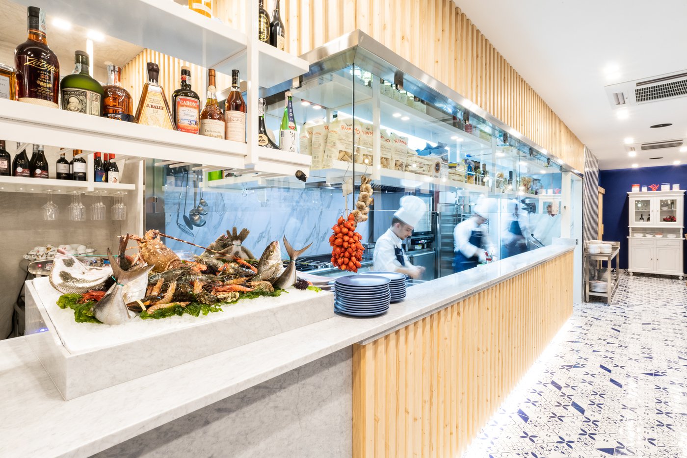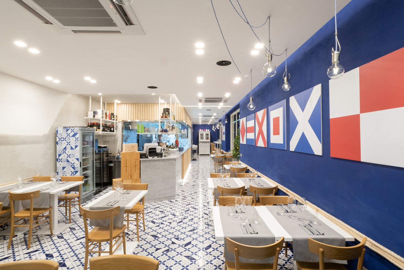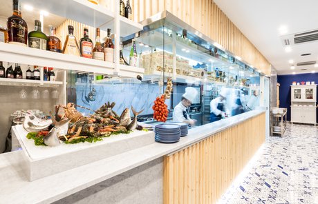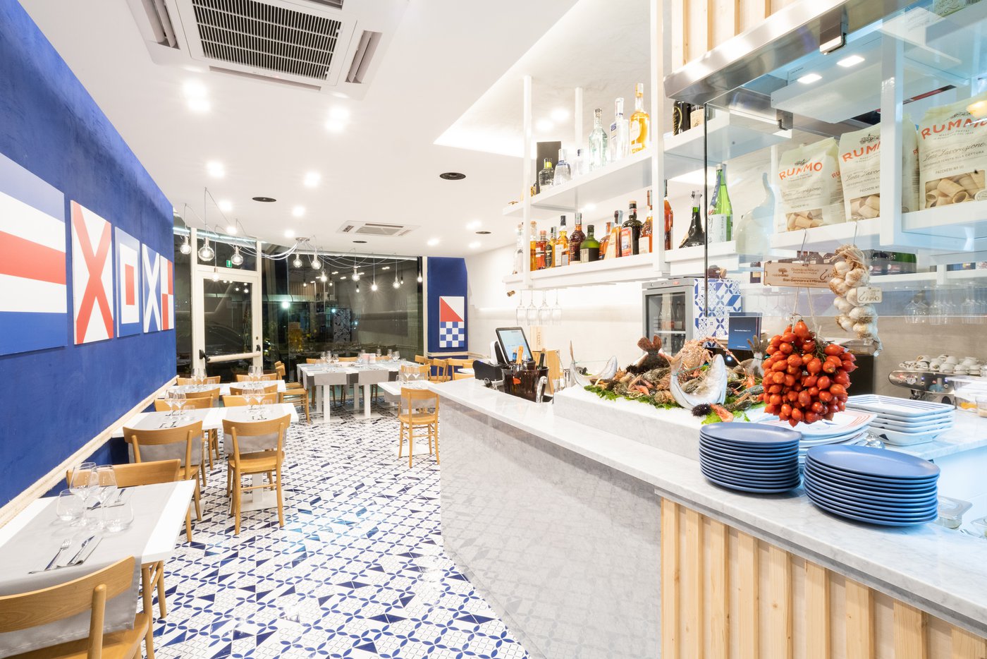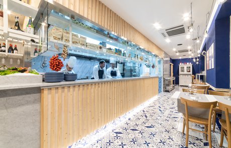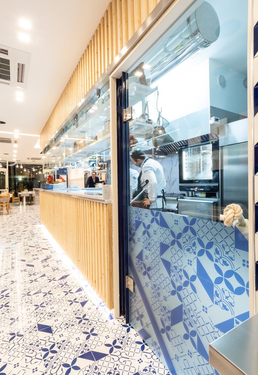 Ein Meeresspezialitätenrestaurant in der Nähe von Caserta mit jungem, unbeschwertem Design. Den Ton geben hier die Farbe blau und die Lebendigkeit der Kollektion Maiolica an: Das kleine Format 10x10 verleiht dem ganzen Lokal einen eindeutig frischen und exzentrischen Akzent. Der originelle Dekor-Mix wird in eine Tischplatte verwandelt und von den blauen Grundfliesen eingerahmt auf dem Fußboden des großen Restaurantsaals verwendet. Das Motiv Triangolo hingegen sorgt für amüsante Geometrien auf der Wand neben der offenen Küche aus hellem Holz.