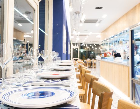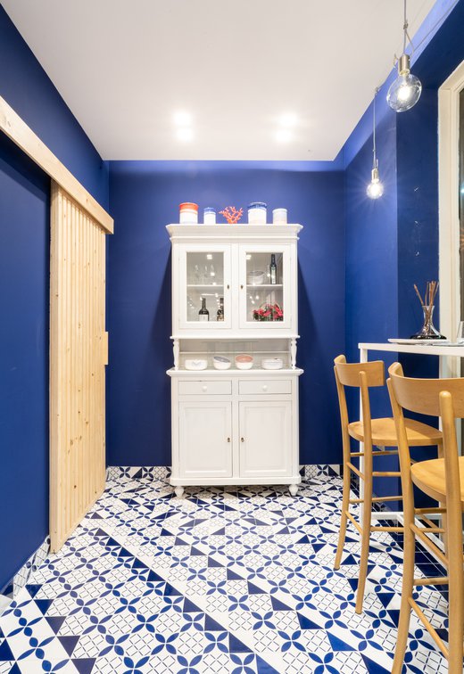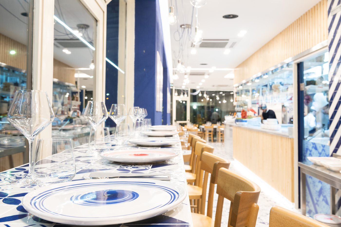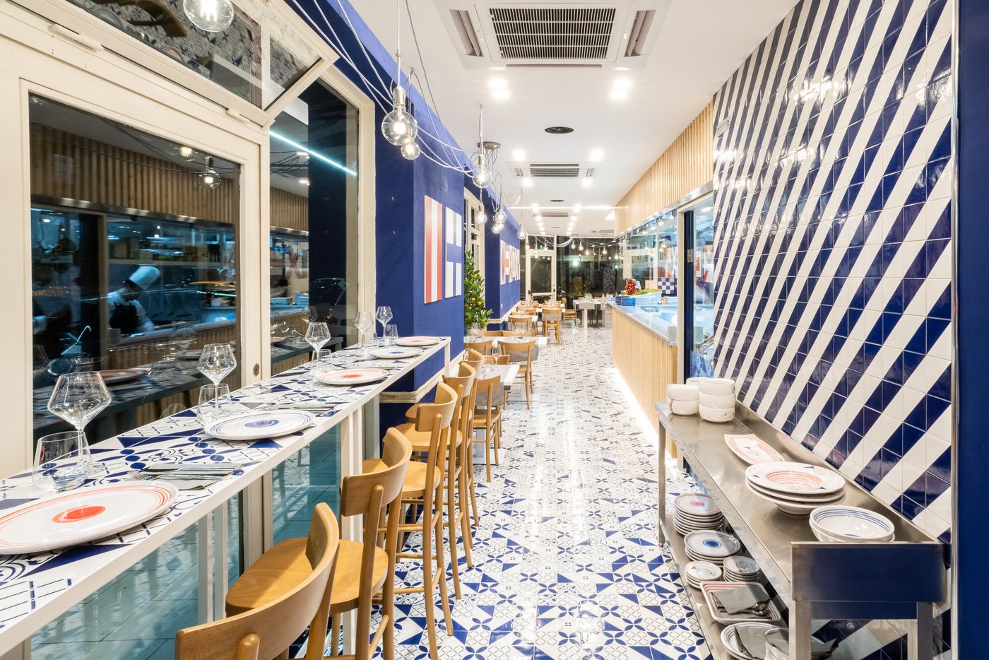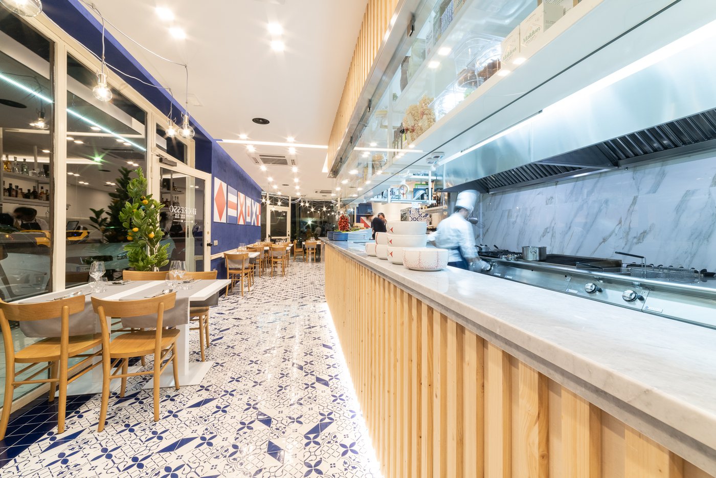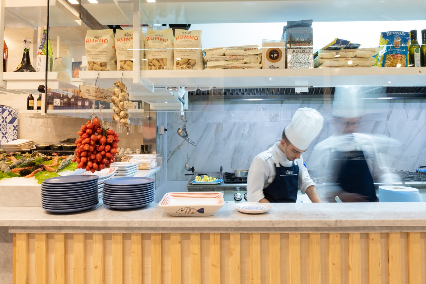 Ein Meeresspezialitätenrestaurant in der Nähe von Caserta mit jungem, unbeschwertem Design. Den Ton geben hier die Farbe blau und die Lebendigkeit der Kollektion Maiolica an: Das kleine Format 10x10 verleiht dem ganzen Lokal einen eindeutig frischen und exzentrischen Akzent. Der originelle Dekor-Mix wird in eine Tischplatte verwandelt und von den blauen Grundfliesen eingerahmt auf dem Fußboden des großen Restaurantsaals verwendet. Das Motiv Triangolo hingegen sorgt für amüsante Geometrien auf der Wand neben der offenen Küche aus hellem Holz.