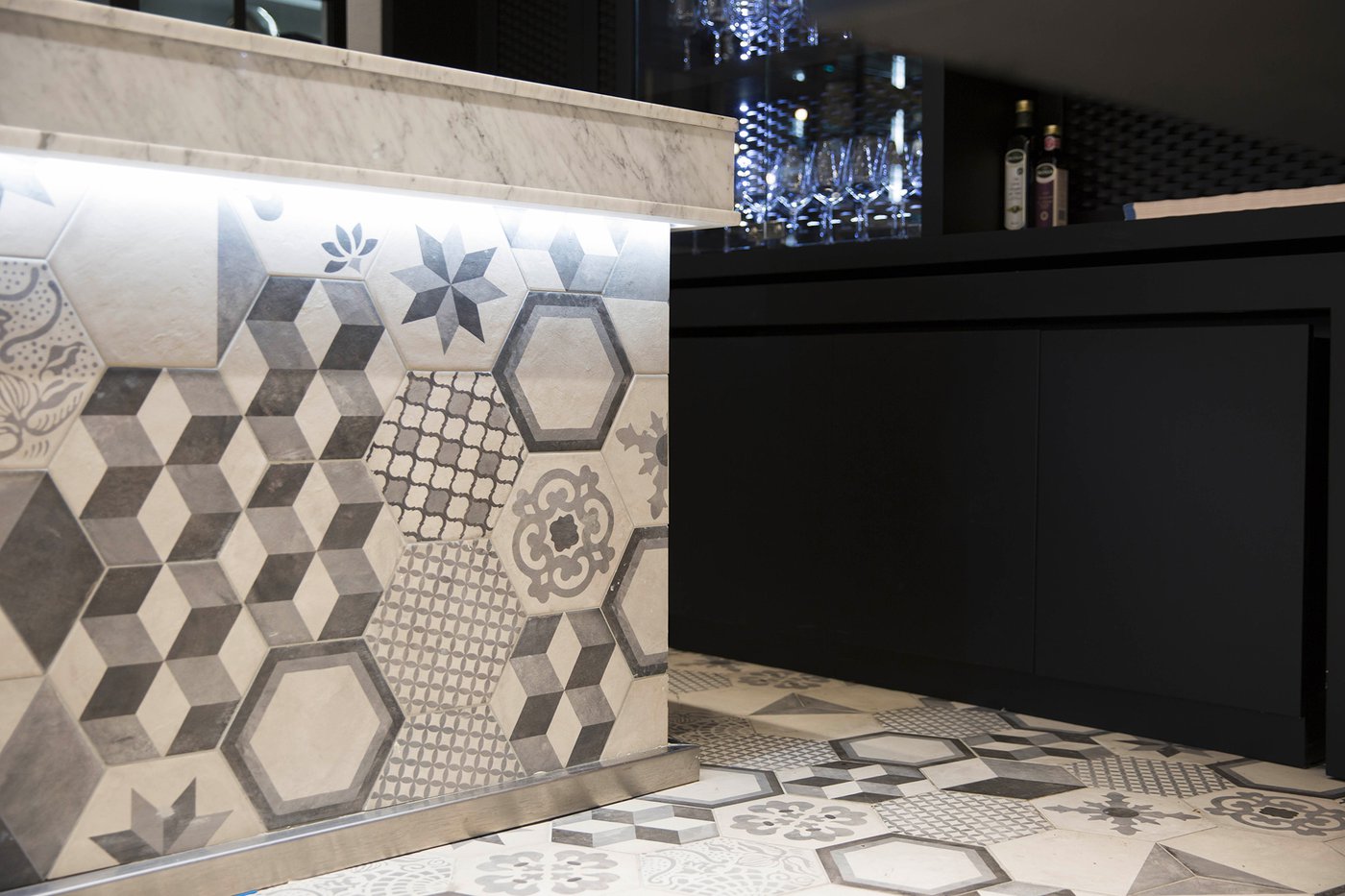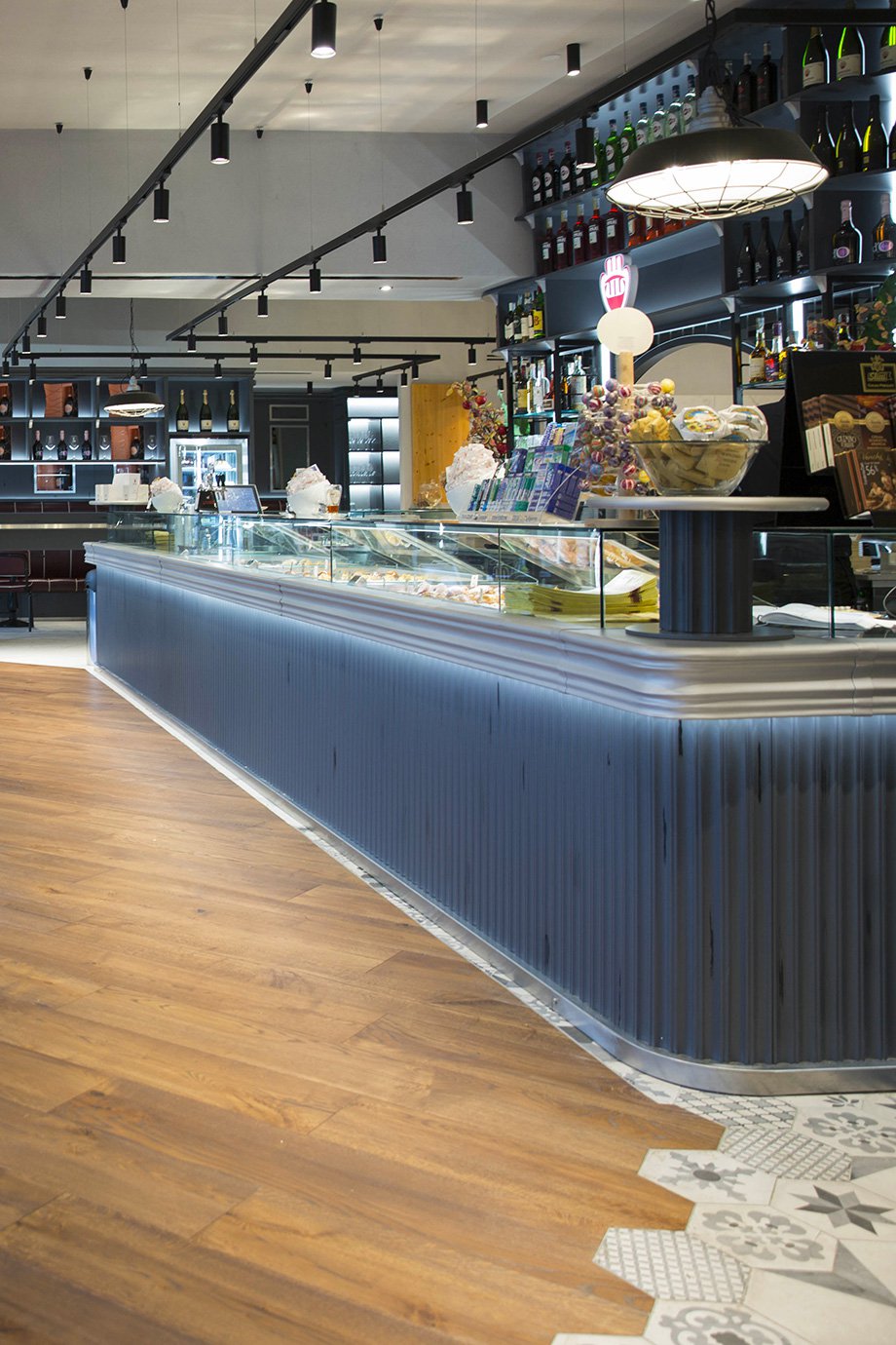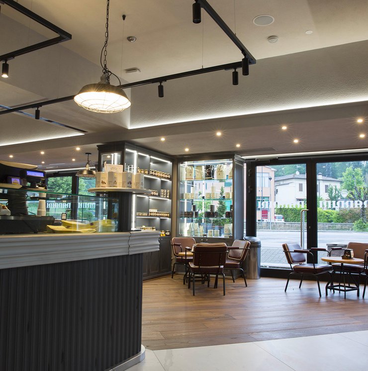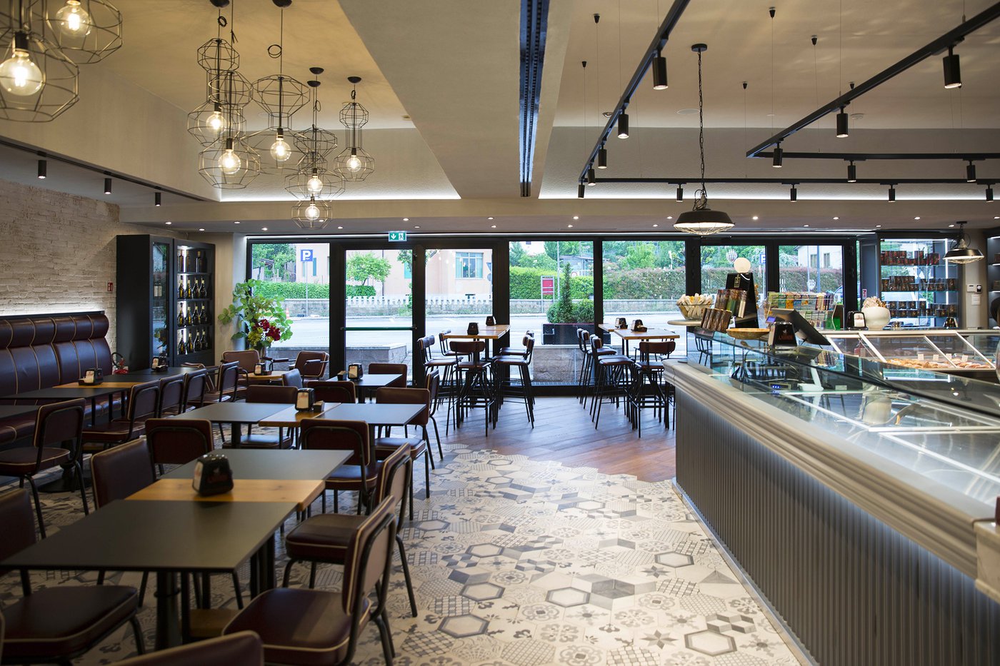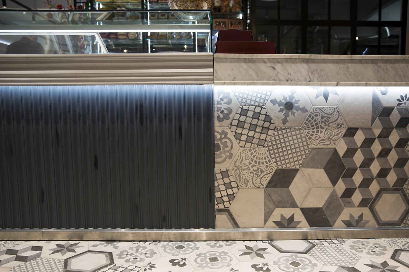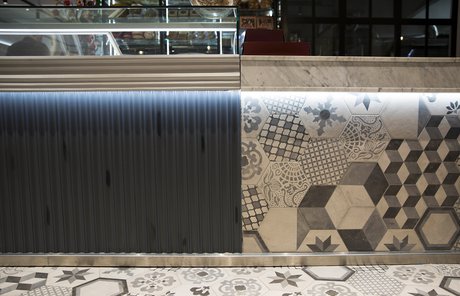 Die Geschichte, die die Barkette Nannini an die Stadt Siena bindet, ist hundert Jahre alt und begann mit einer revolutionären Dampfkaffeemaschine zu Beginn des vergangenen Jahrhunderts. Seither haben sich die Räumlichkeiten mehrmals gewandelt und zur meisterhaften italienischen Kunst der Kaffeerösterei sind die der Konditorei und der Likörproduktion gekommen. Außerhalb der Stadtmauern befindet sich eines dieser Lokale, Massetana, das mit seinen Innenausstattungen und -einrichtungen von diesen 100 Jahren voll Tradition, Genie und Qualität erzählen möchte. Einen Kontrast zum warmen, linearen Parkett und den kostbaren Äderungen des hellen Marmors bildet die Eleganz der Zementfliesen Terra, die beliebtesten kleinen Formate aus Feinsteinzeug von Marca Corona. Das Mix Decori im sechseckigen Format mit seinen eleganten grauen Nuancen, anthrazit und schwarz, und die originellen geometrischen Motiven und Blumenmotiven erinnern an Begeisterung des historischen Gründers, Guido Nannini, und sorgen für ein eindeutig einladendes und luftiges Ambiente.