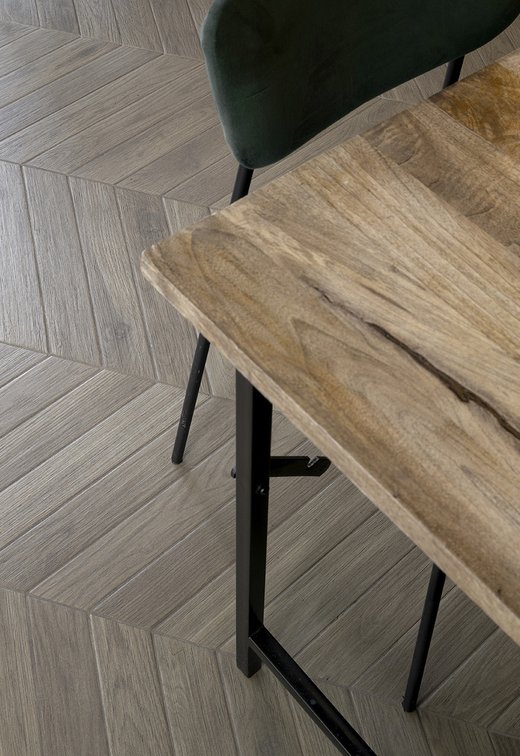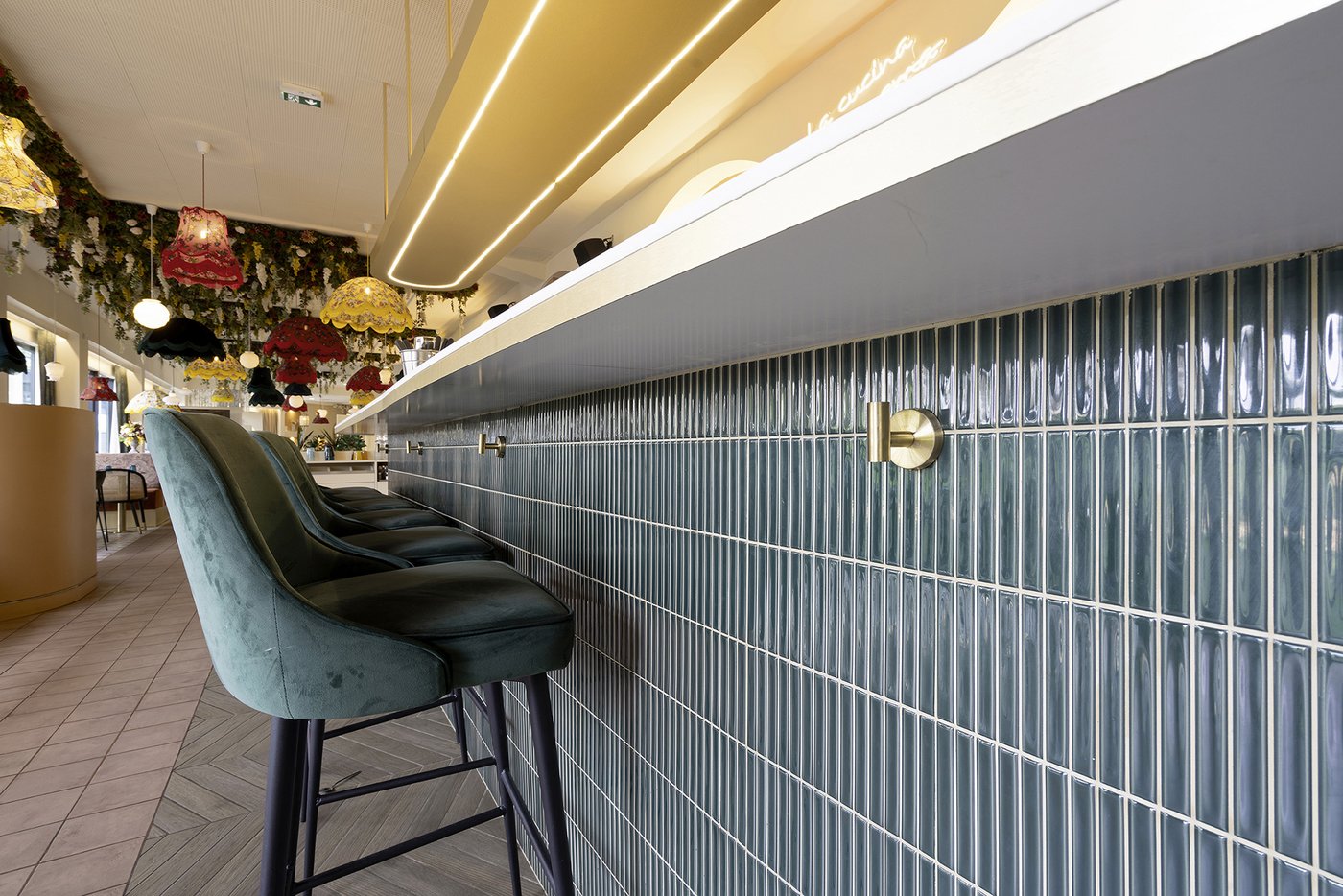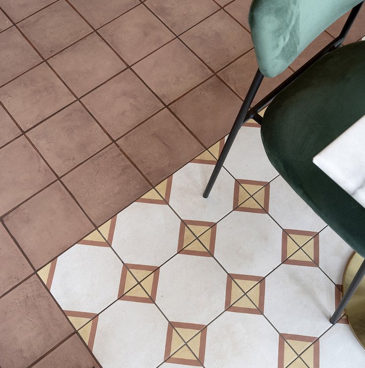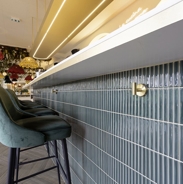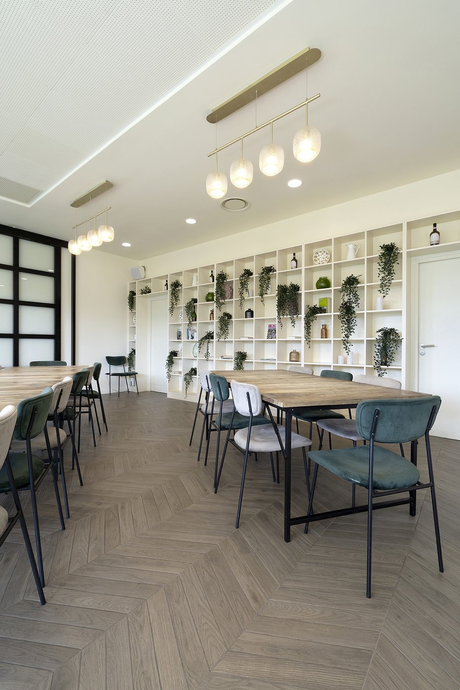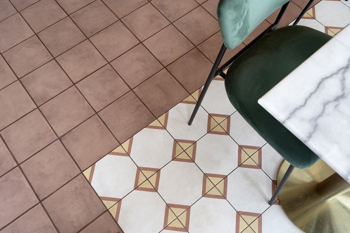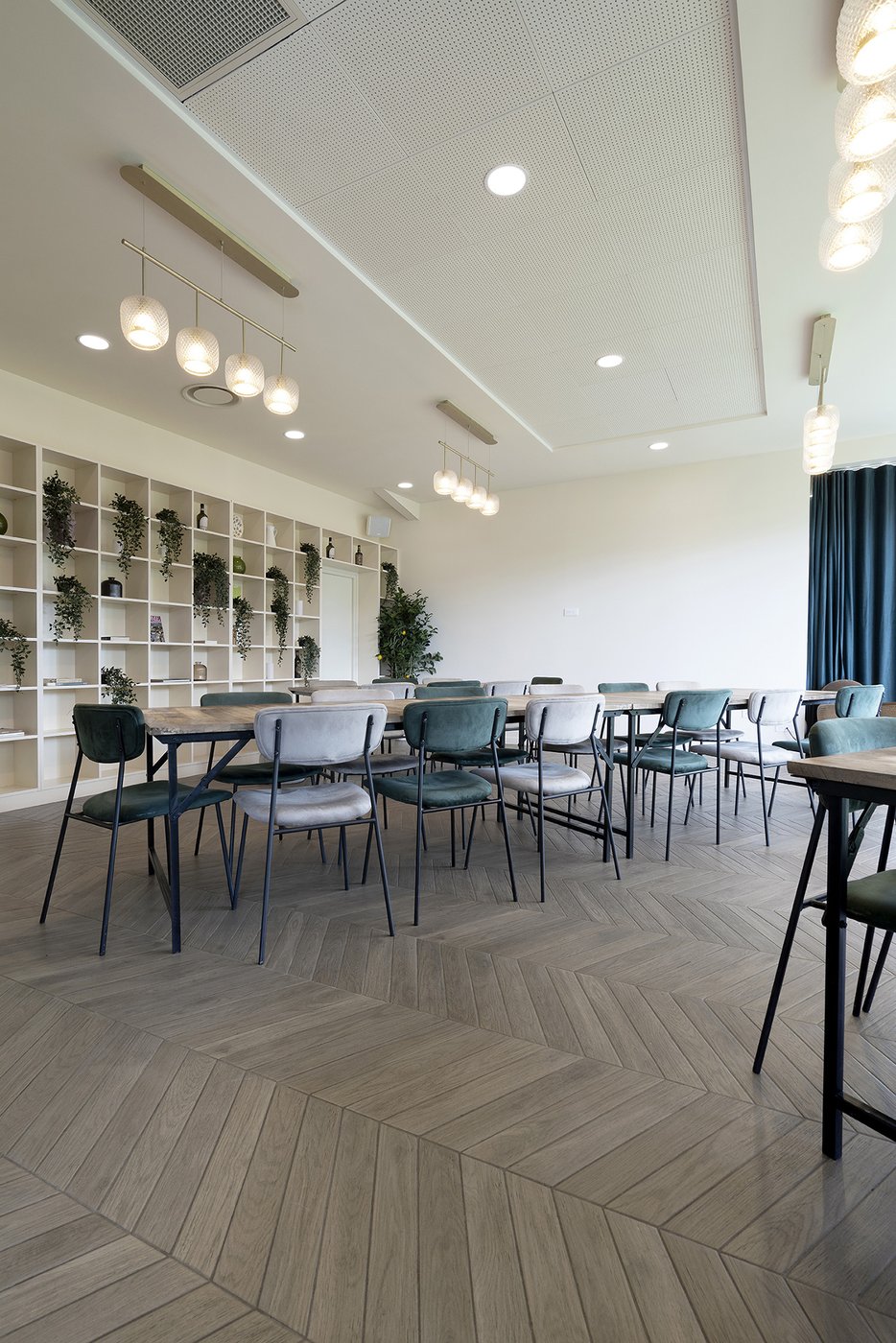 Die Auswahl der Fliesen aus der Kollektion Terracreta verleiht dem Lokal eine spürbare Eleganz, dank der naturgetreuen Nachahmung raffinierter Dekore aus Naturton, die eine warme, gemütliche Atmosphäre erzeugen. Terra.Art mit seinen charakteristischen Mustern und frischen, ausdrucksstarken Farben verleiht den lebendig und edel wirkenden Räumen einen Hauch Persönlichkeit und Stil. Durch den Bodenbelag im Fischgrätmuster aus der Kollektion Elisir Royal in Holzoptik mit vielen Astlöchern und Maserungen erhält das Lokal durch die gekonnte Kombination aus Moderne und Tradition eine einzigartige Faszination.