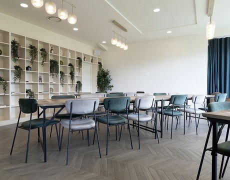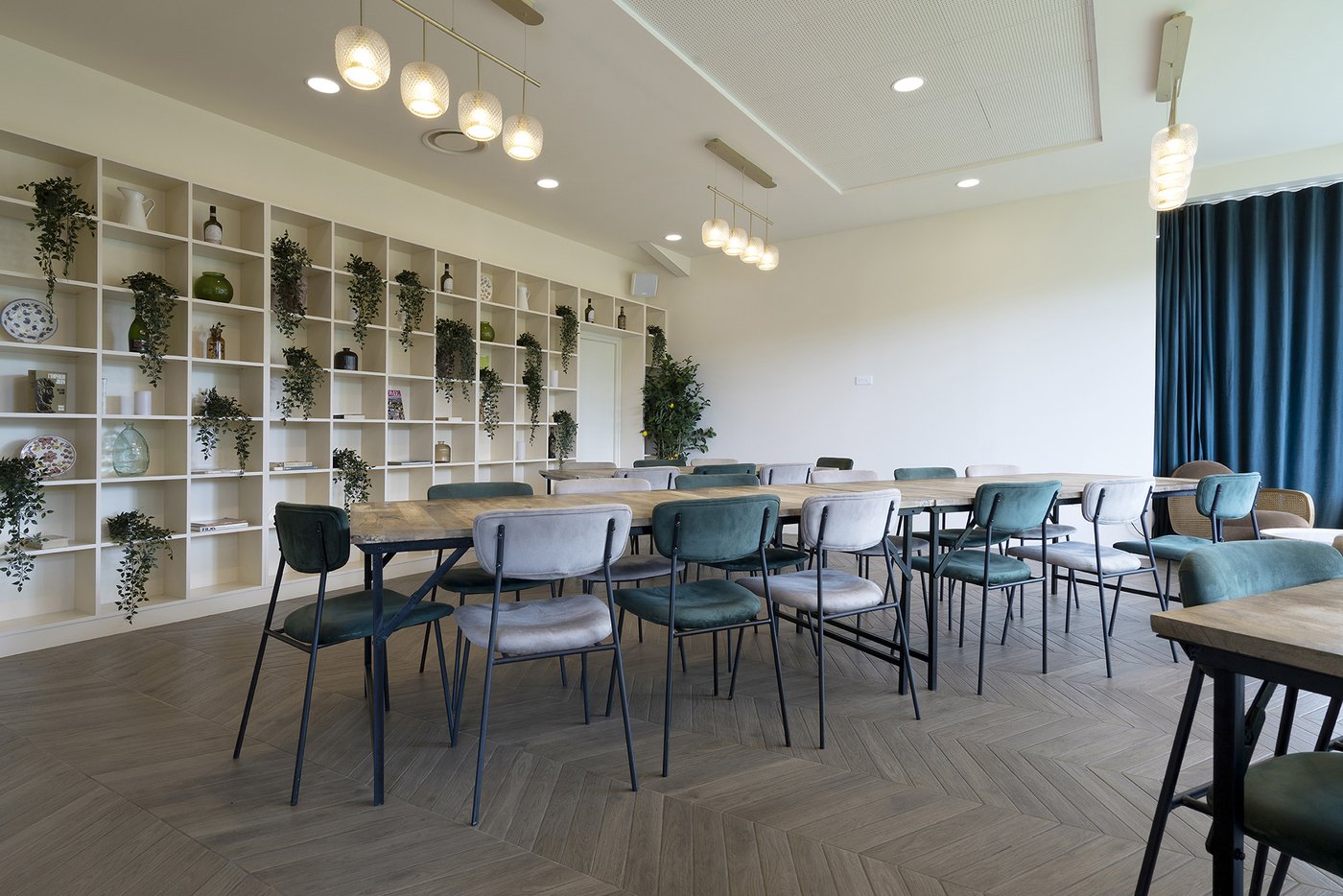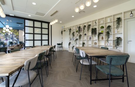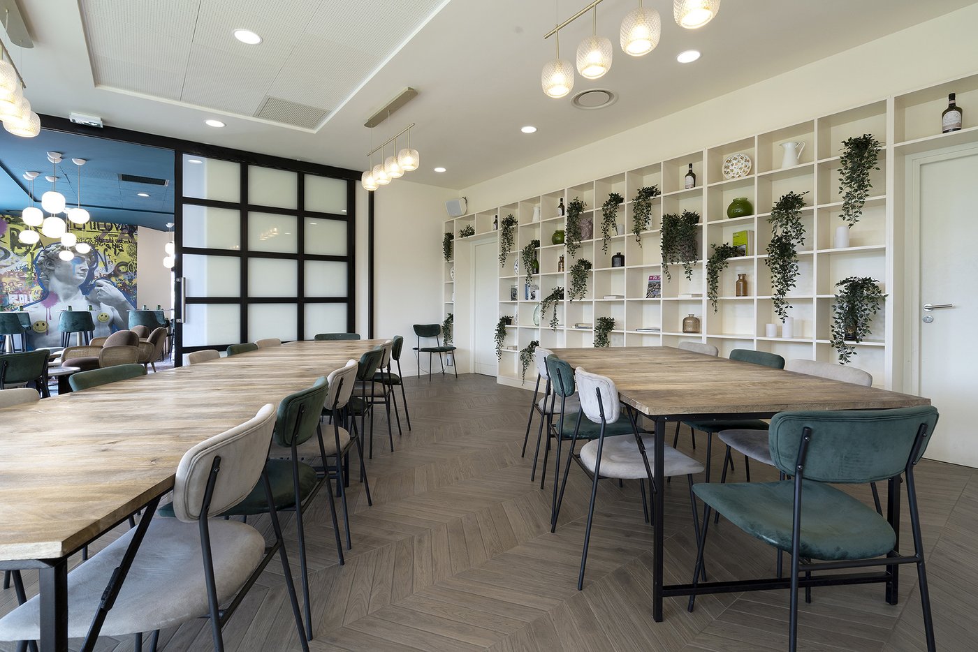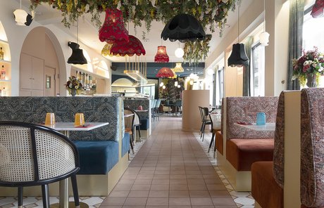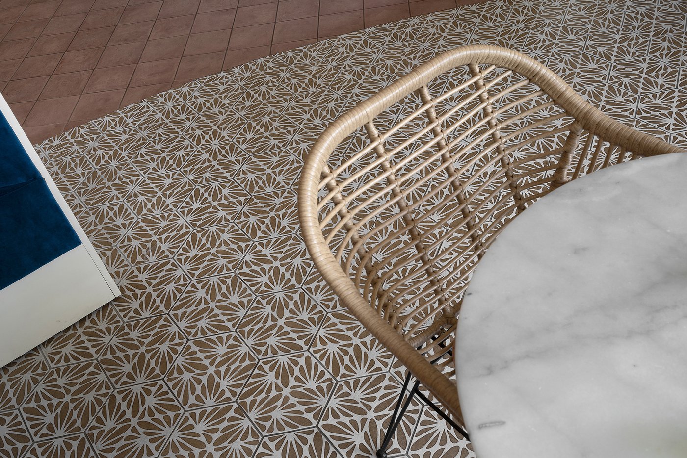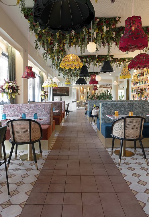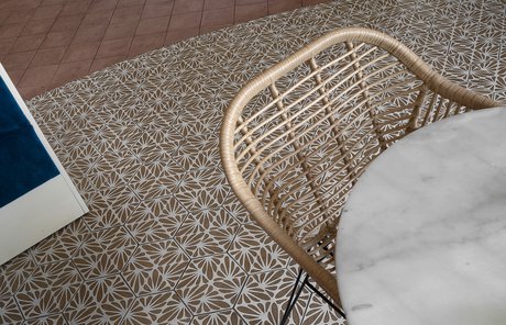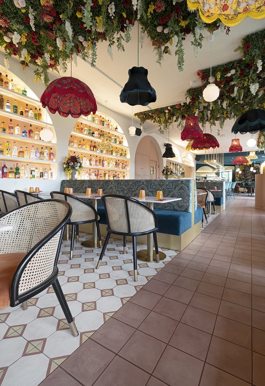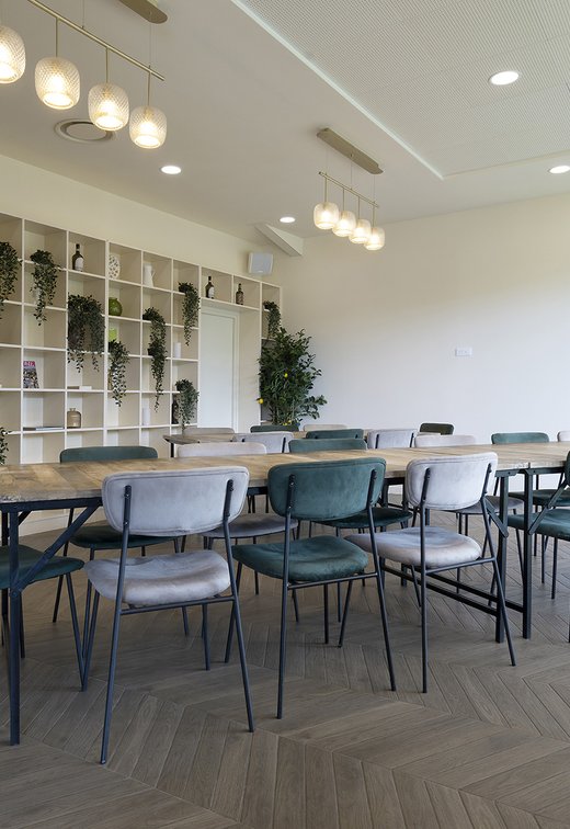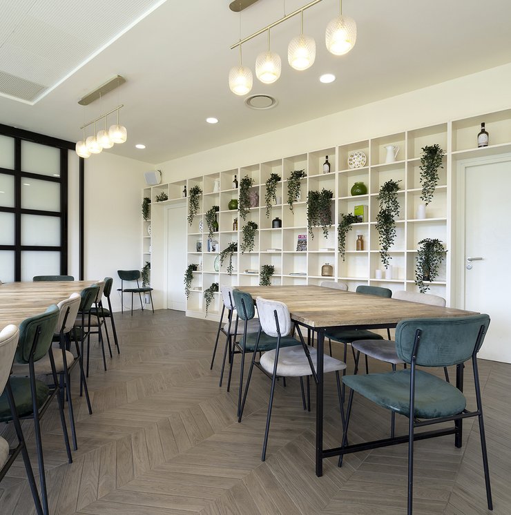 Die Auswahl der Fliesen aus der Kollektion Terracreta verleiht dem Lokal eine spürbare Eleganz, dank der naturgetreuen Nachahmung raffinierter Dekore aus Naturton, die eine warme, gemütliche Atmosphäre erzeugen. Terra.Art mit seinen charakteristischen Mustern und frischen, ausdrucksstarken Farben verleiht den lebendig und edel wirkenden Räumen einen Hauch Persönlichkeit und Stil. Durch den Bodenbelag im Fischgrätmuster aus der Kollektion Elisir Royal in Holzoptik mit vielen Astlöchern und Maserungen erhält das Lokal durch die gekonnte Kombination aus Moderne und Tradition eine einzigartige Faszination.