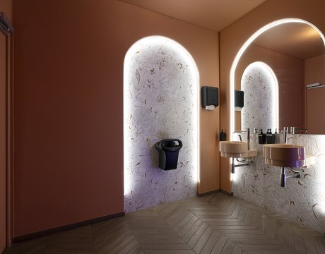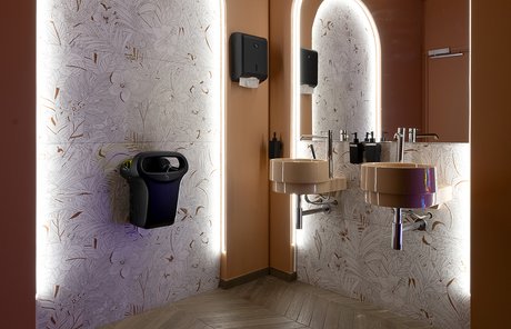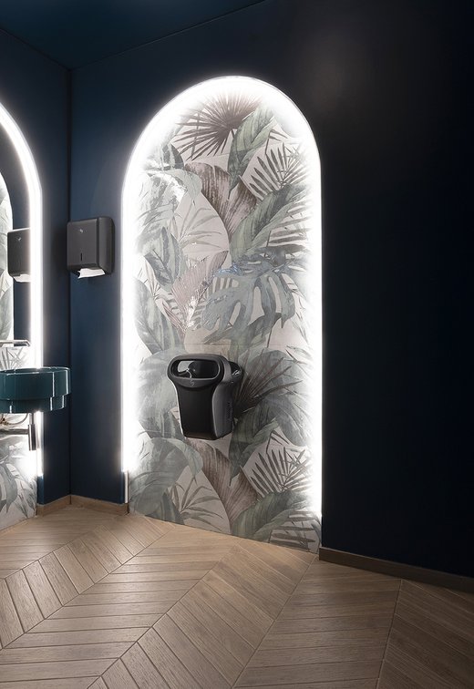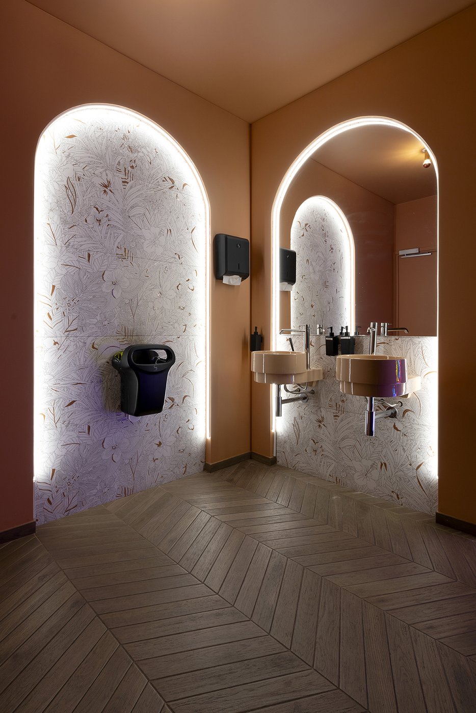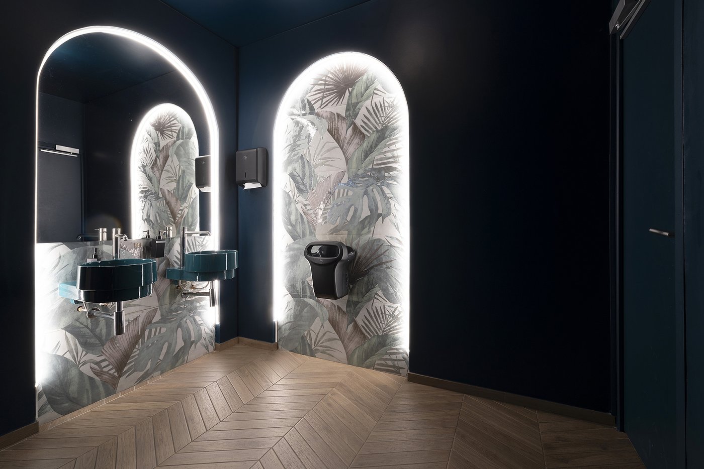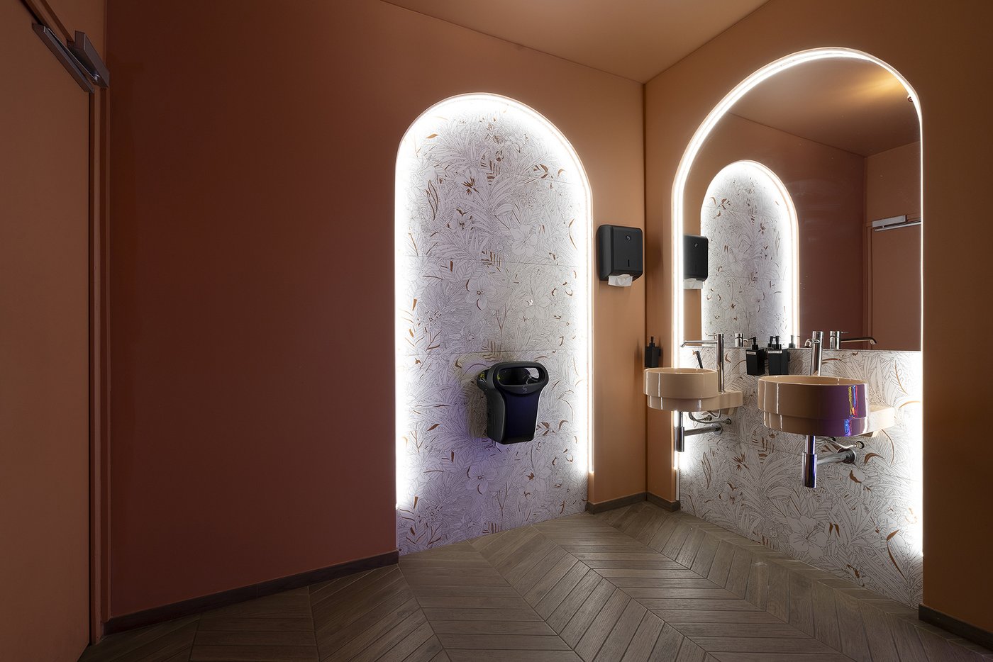 Zur Gestaltung der Toiletten wurde die Kollektion Mirabilia in den Ausführungen FOLIAGE und JUNGLE gewählt, um die Wandnischen zu gestalten: Eine Einladung zu einer visuellen Erkundung der Welt der Pflanzen mit wertvollen Details und einer expressiven Kraft, die diese Räume in wahre Orte kreativer Eleganz verwandelt.