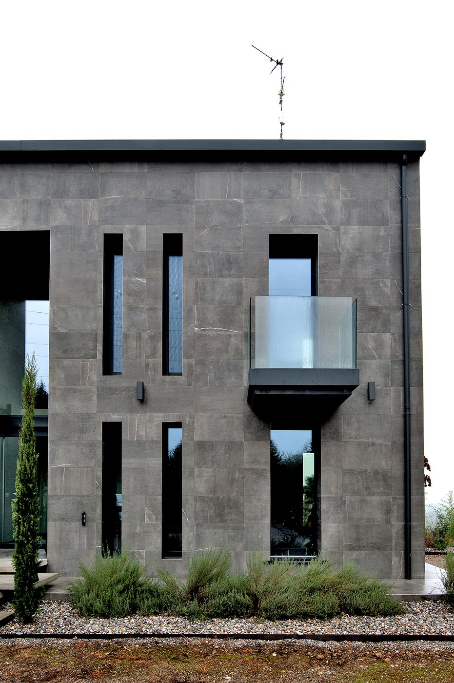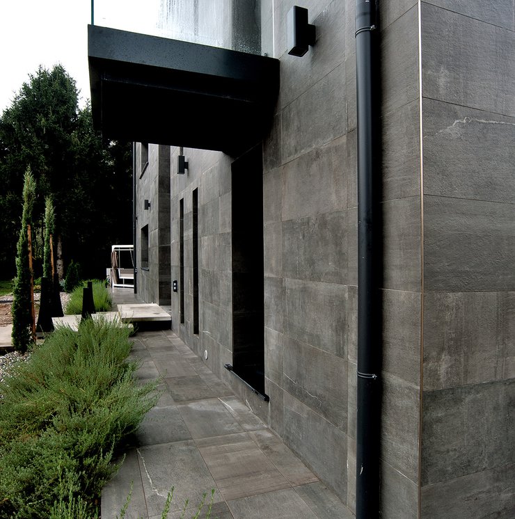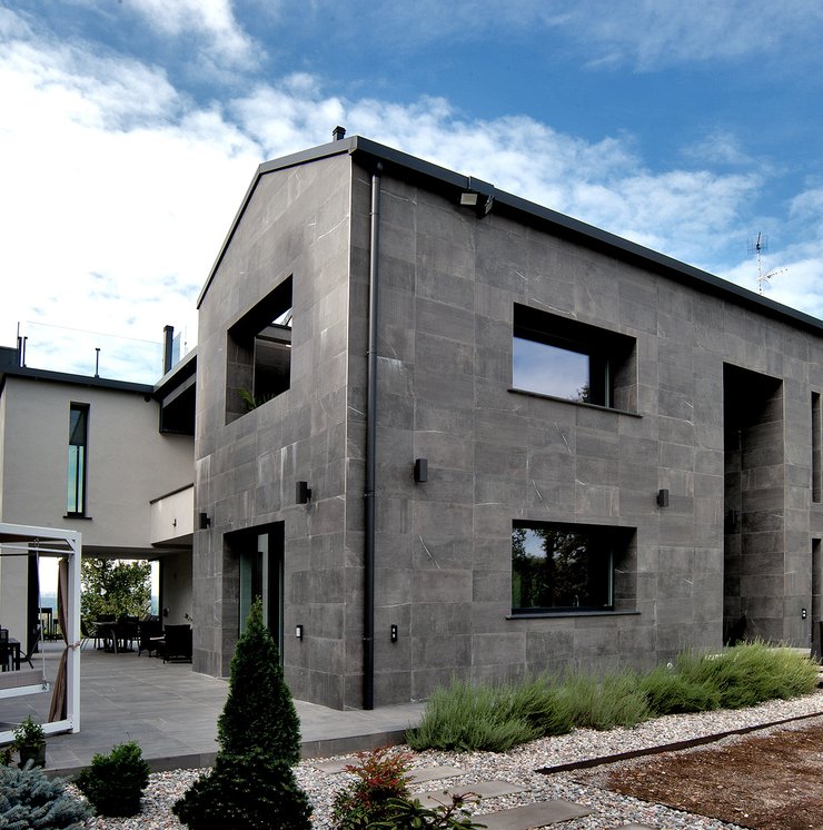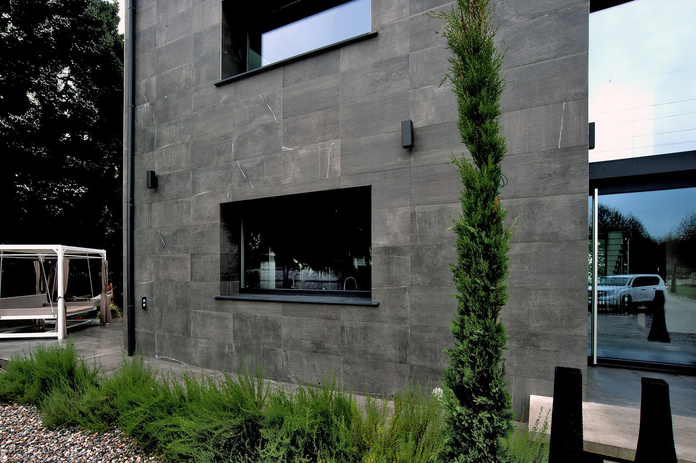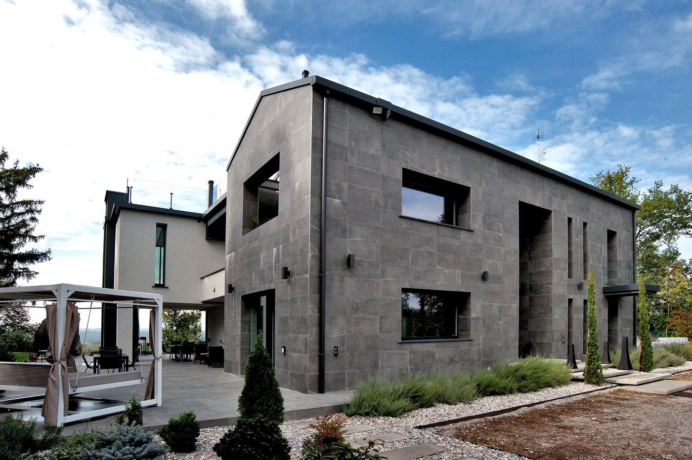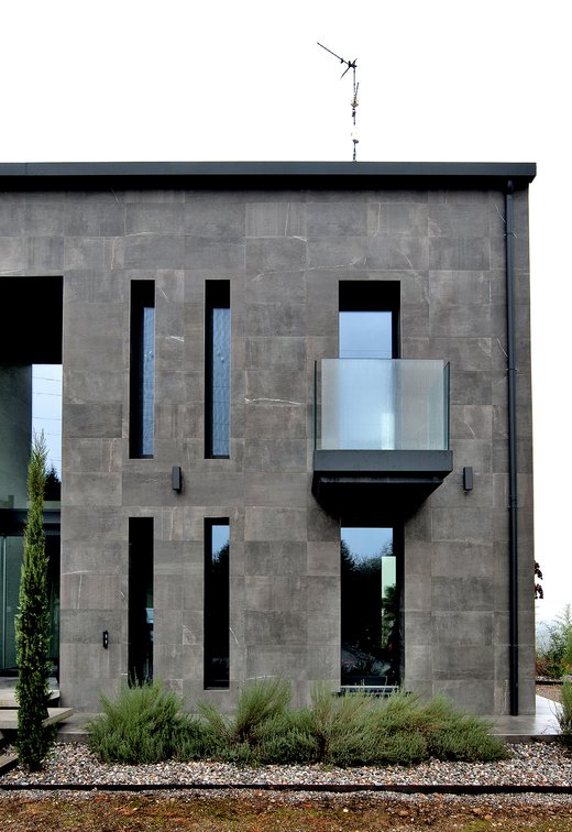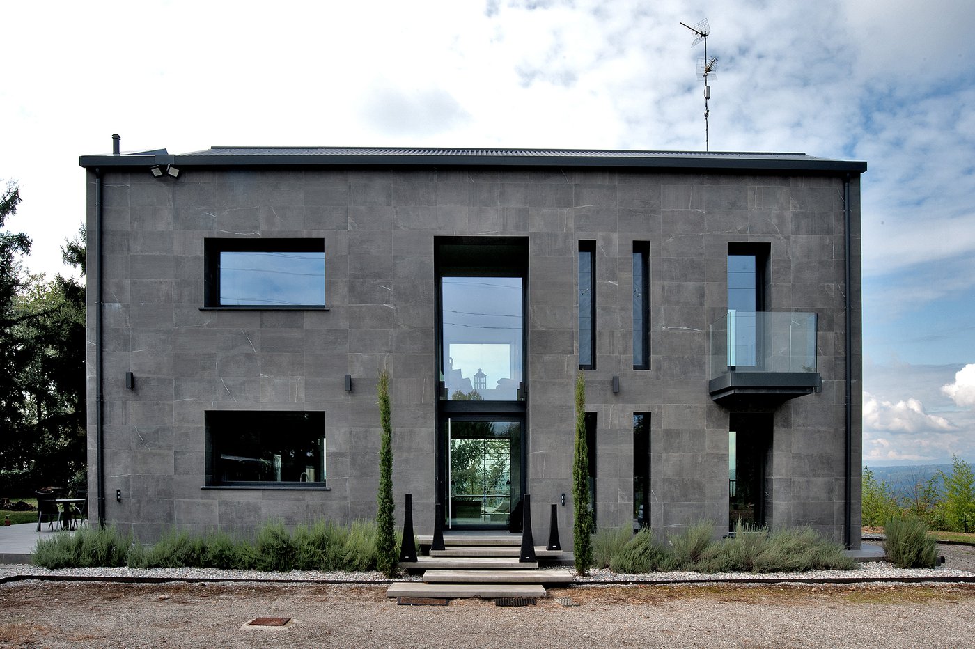 Eine Villa im Industrial-Stil in der grünen Landschaft der Lombardei, ein einfach einzigartiger Anblick dank der imposanten Struktur und dem Spiel von vollen und leeren Räumen, die von Architekt Achini entworfen wurden. Die Fassaden der Residenz, die sich durch die dunkle und intensive Farbe der Keramik mit StoneOne-Steineffekt auszeichnen, wechseln sich mit großen Fenstern ab, die das Licht eindringen lassen und den Blick ins Innere freigeben.