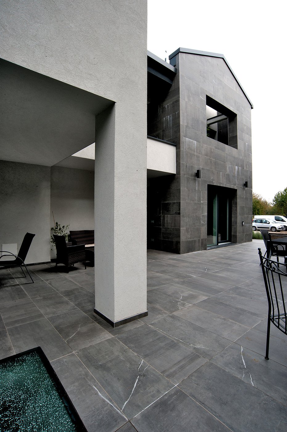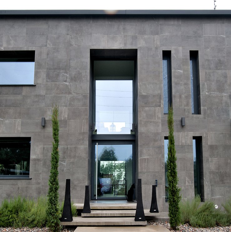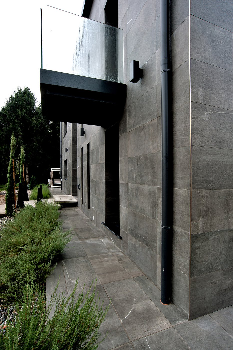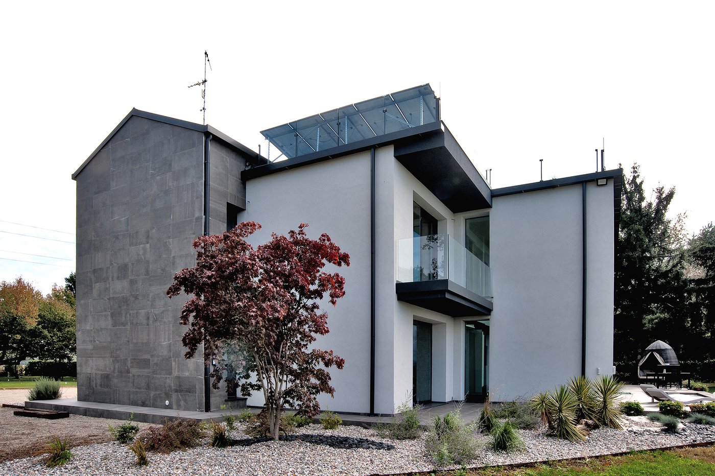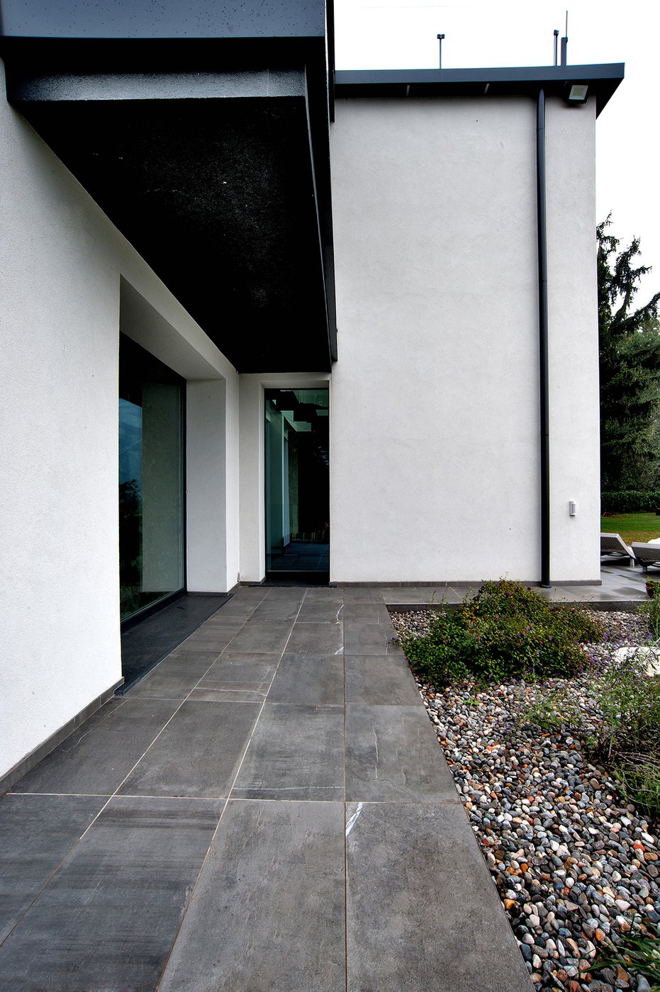 Eine Villa im Industrial-Stil in der grünen Landschaft der Lombardei, ein einfach einzigartiger Anblick dank der imposanten Struktur und dem Spiel von vollen und leeren Räumen, die von Architekt Achini entworfen wurden. Die Fassaden der Residenz, die sich durch die dunkle und intensive Farbe der Keramik mit StoneOne-Steineffekt auszeichnen, wechseln sich mit großen Fenstern ab, die das Licht eindringen lassen und den Blick ins Innere freigeben.