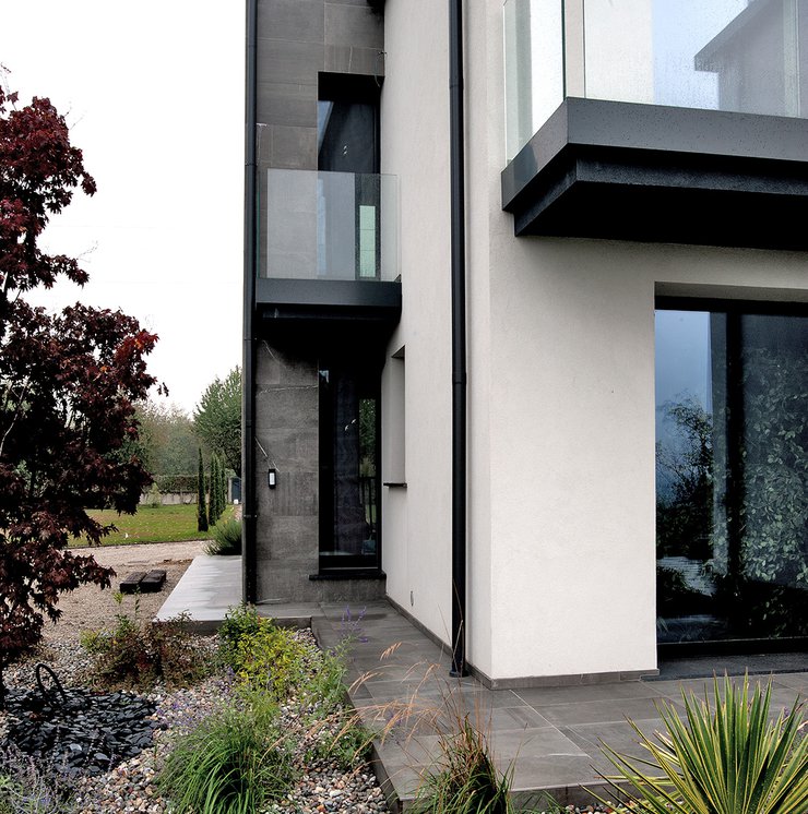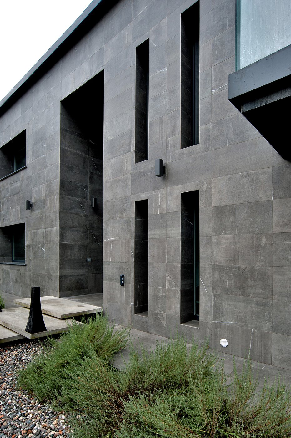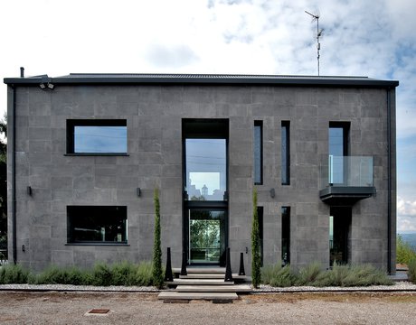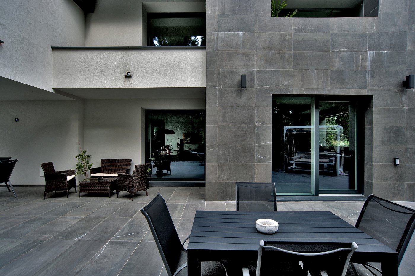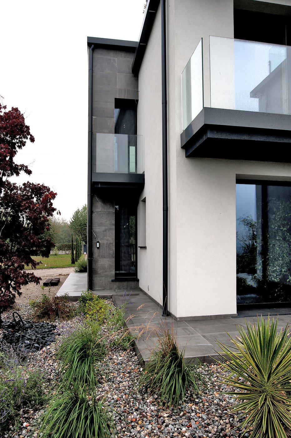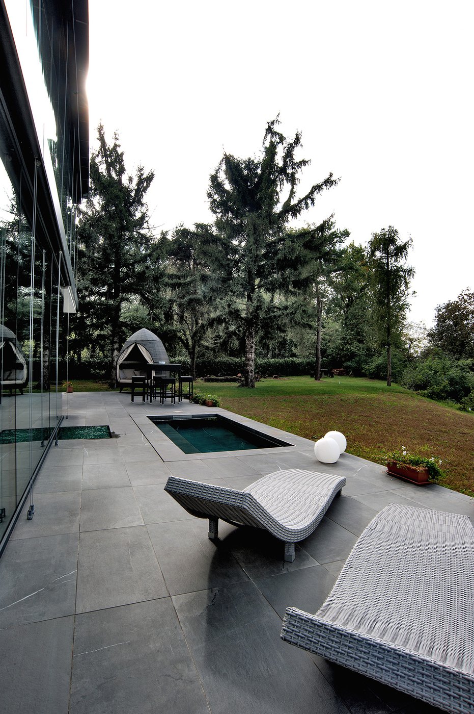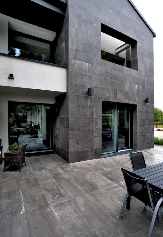 Eine Villa im Industrial-Stil in der grünen Landschaft der Lombardei, ein einfach einzigartiger Anblick dank der imposanten Struktur und dem Spiel von vollen und leeren Räumen, die von Architekt Achini entworfen wurden. Die Fassaden der Residenz, die sich durch die dunkle und intensive Farbe der Keramik mit StoneOne-Steineffekt auszeichnen, wechseln sich mit großen Fenstern ab, die das Licht eindringen lassen und den Blick ins Innere freigeben.