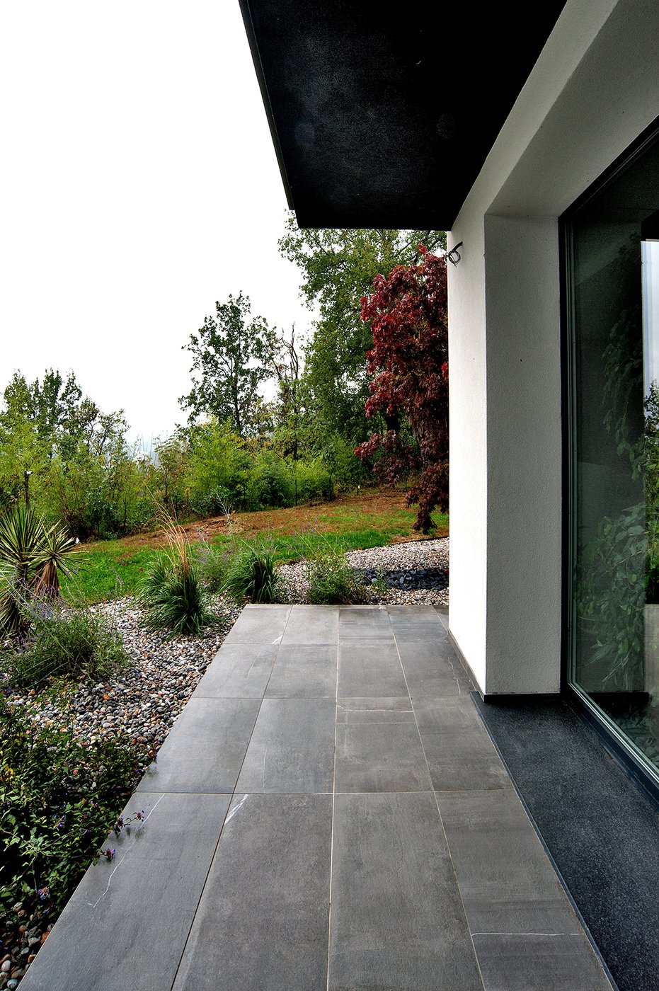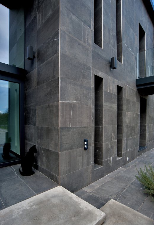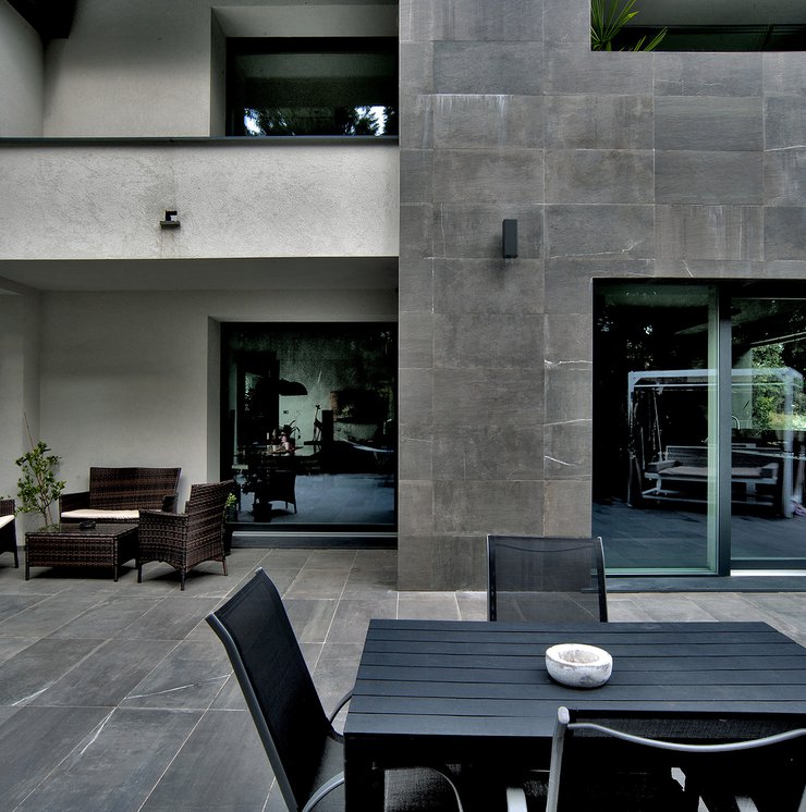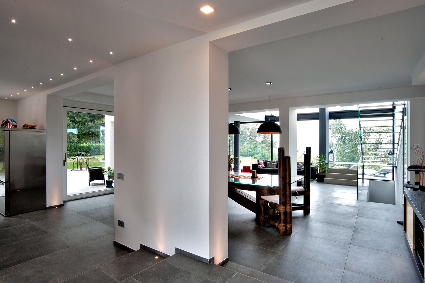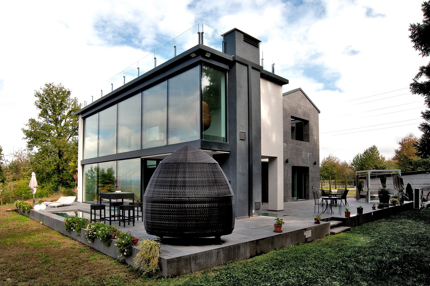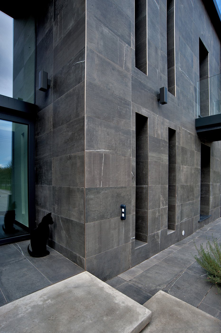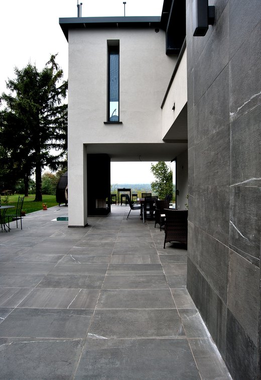 Eine Villa im Industrial-Stil in der grünen Landschaft der Lombardei, ein einfach einzigartiger Anblick dank der imposanten Struktur und dem Spiel von vollen und leeren Räumen, die von Architekt Achini entworfen wurden. Die Fassaden der Residenz, die sich durch die dunkle und intensive Farbe der Keramik mit StoneOne-Steineffekt auszeichnen, wechseln sich mit großen Fenstern ab, die das Licht eindringen lassen und den Blick ins Innere freigeben.