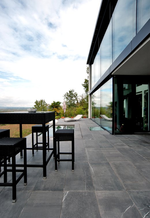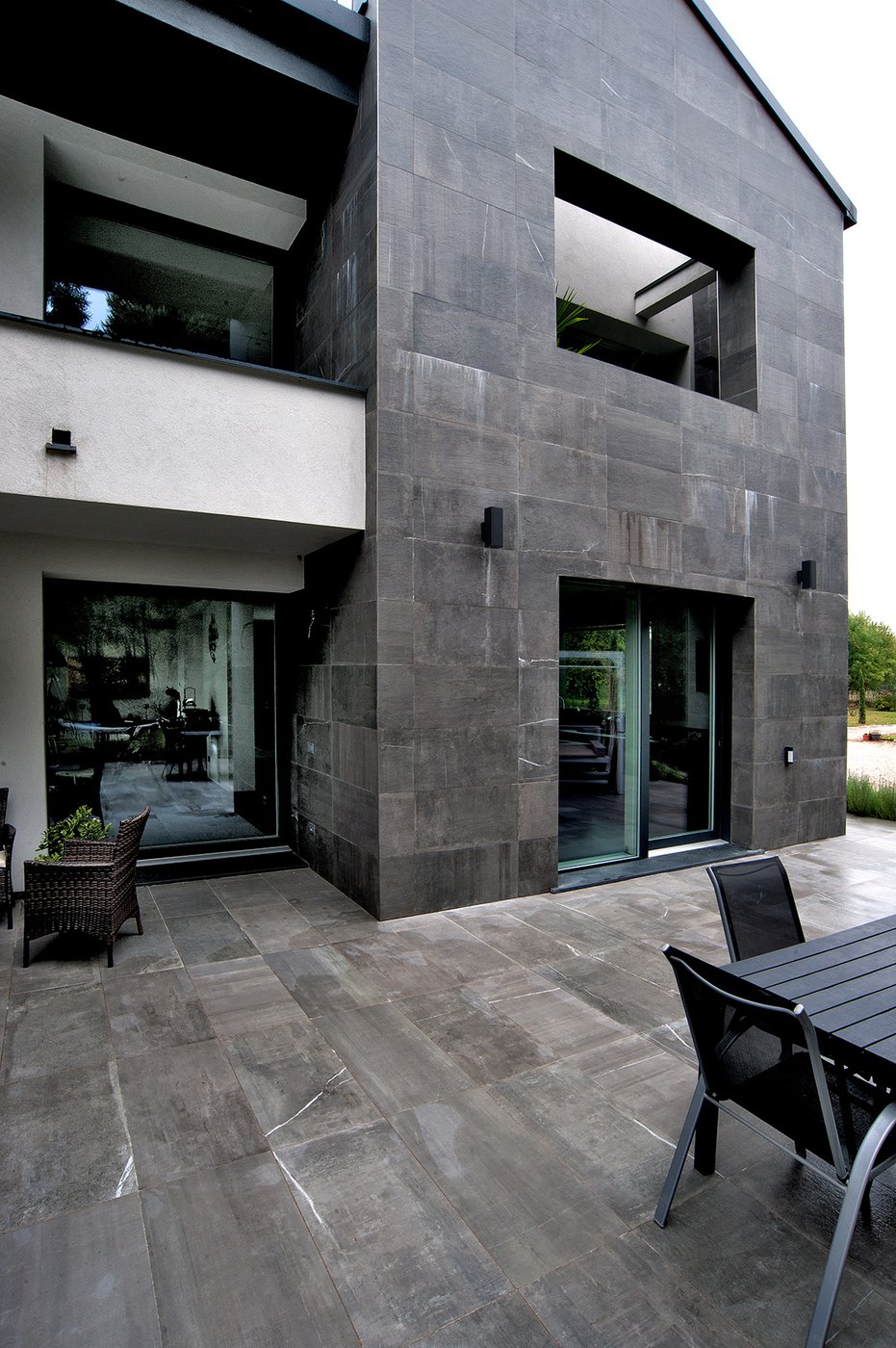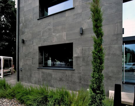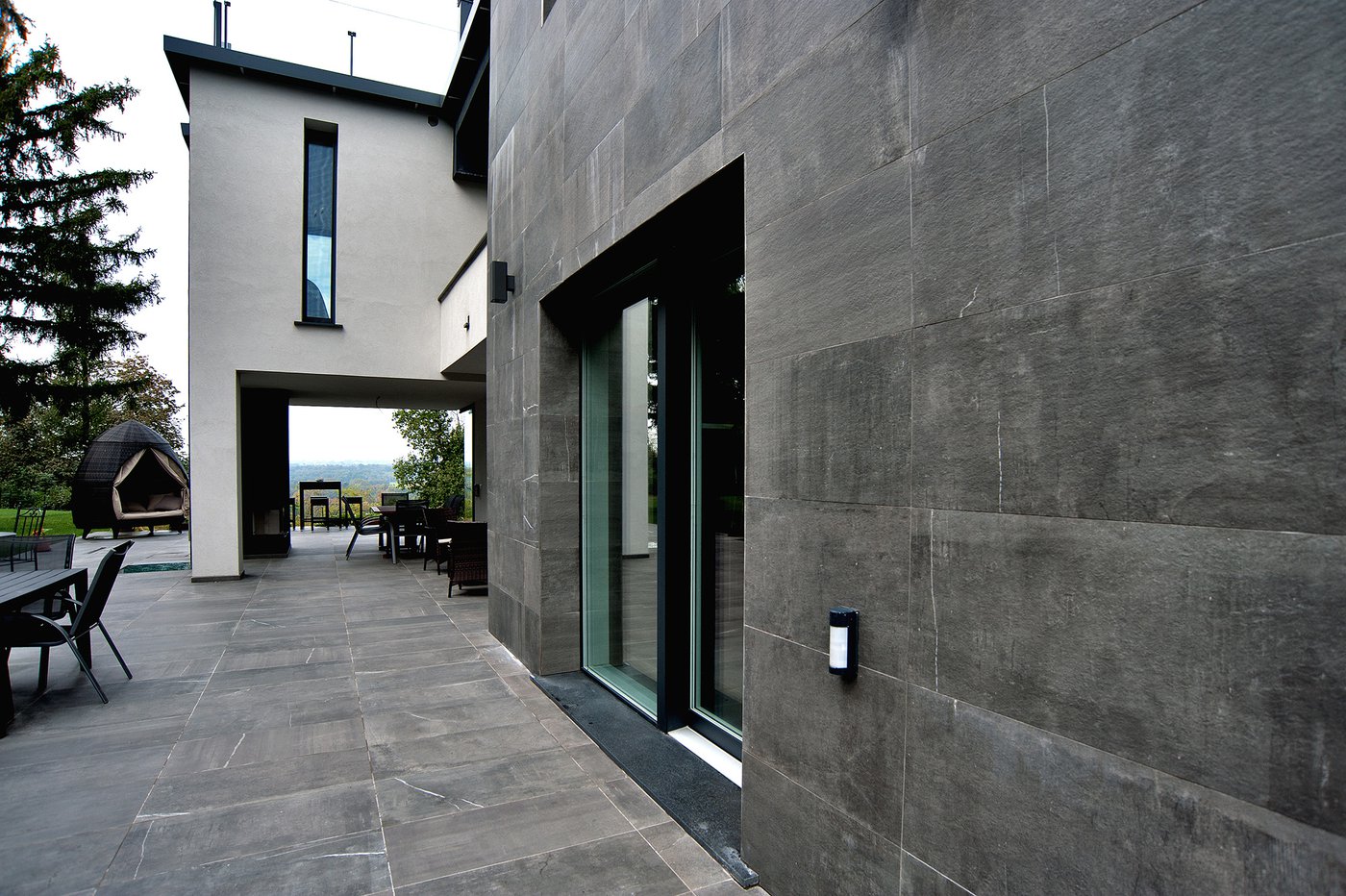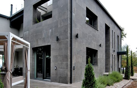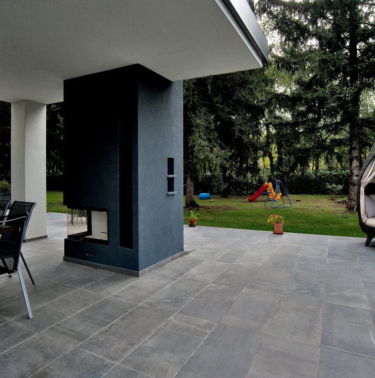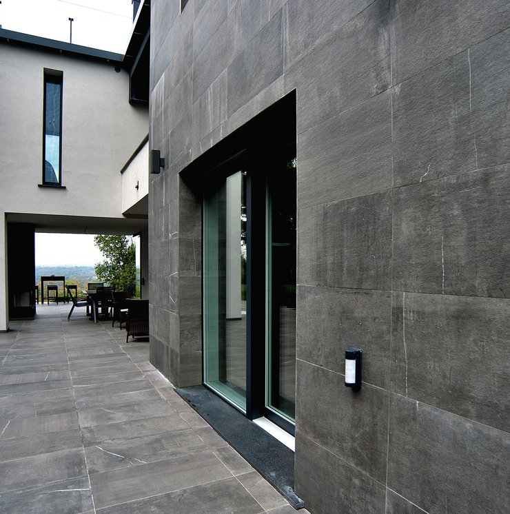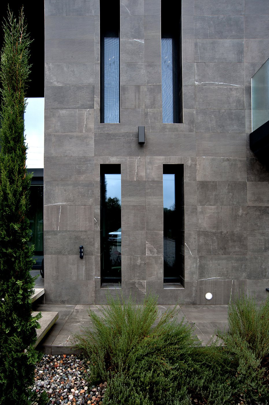 Eine Villa im Industrial-Stil in der grünen Landschaft der Lombardei, ein einfach einzigartiger Anblick dank der imposanten Struktur und dem Spiel von vollen und leeren Räumen, die von Architekt Achini entworfen wurden. Die Fassaden der Residenz, die sich durch die dunkle und intensive Farbe der Keramik mit StoneOne-Steineffekt auszeichnen, wechseln sich mit großen Fenstern ab, die das Licht eindringen lassen und den Blick ins Innere freigeben.