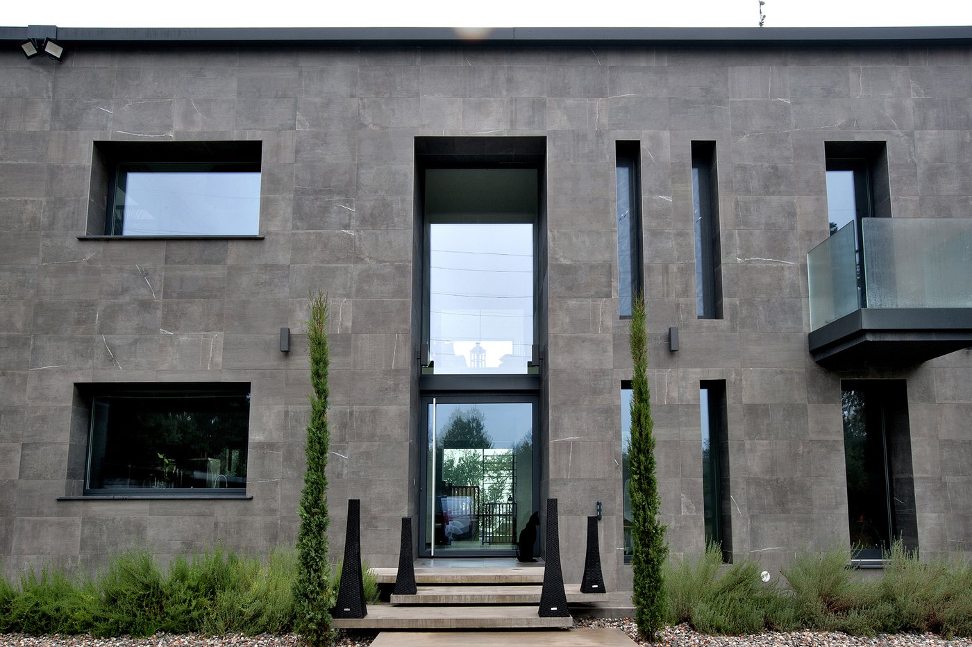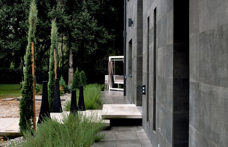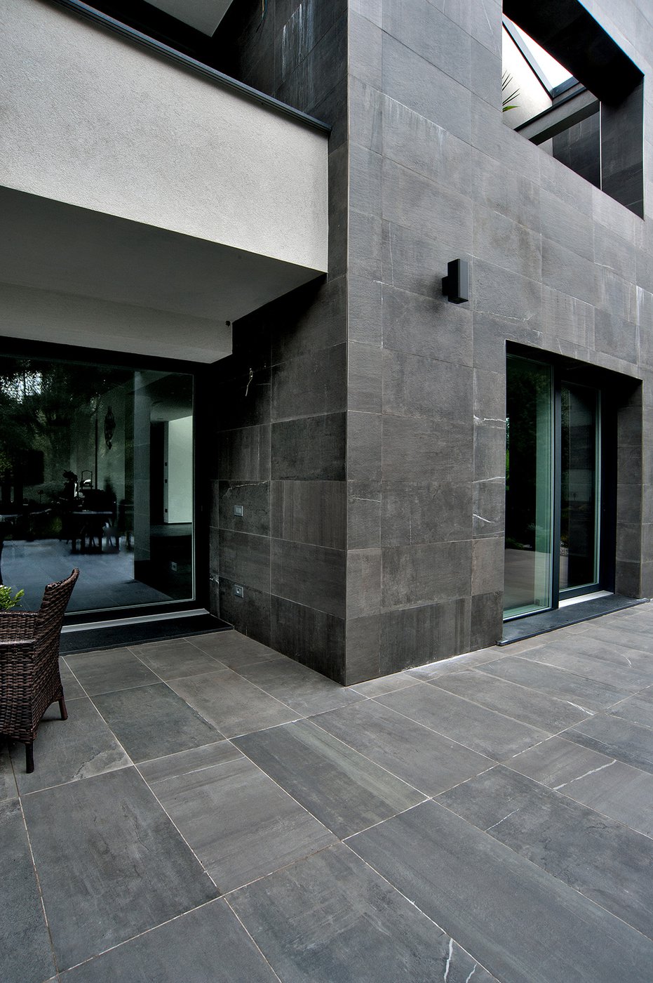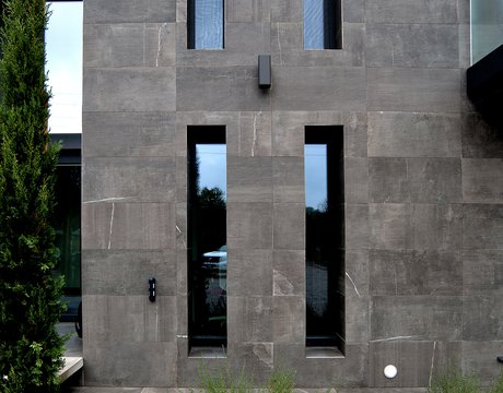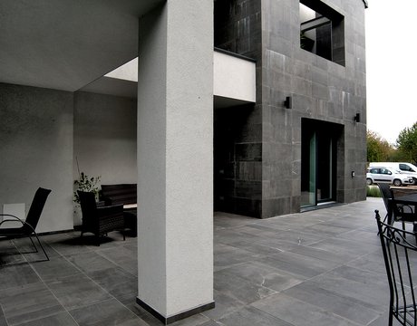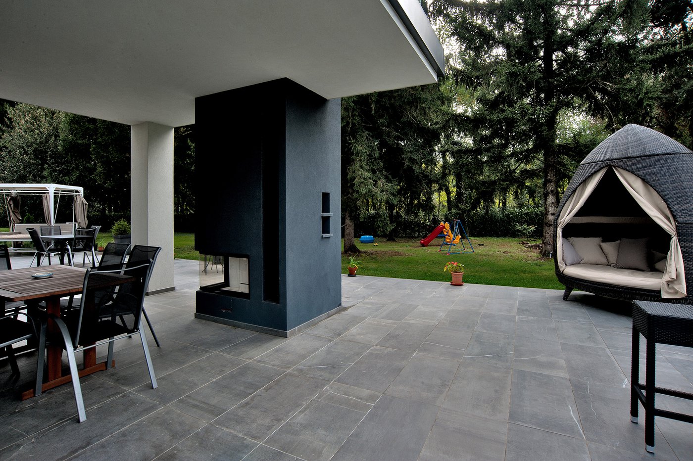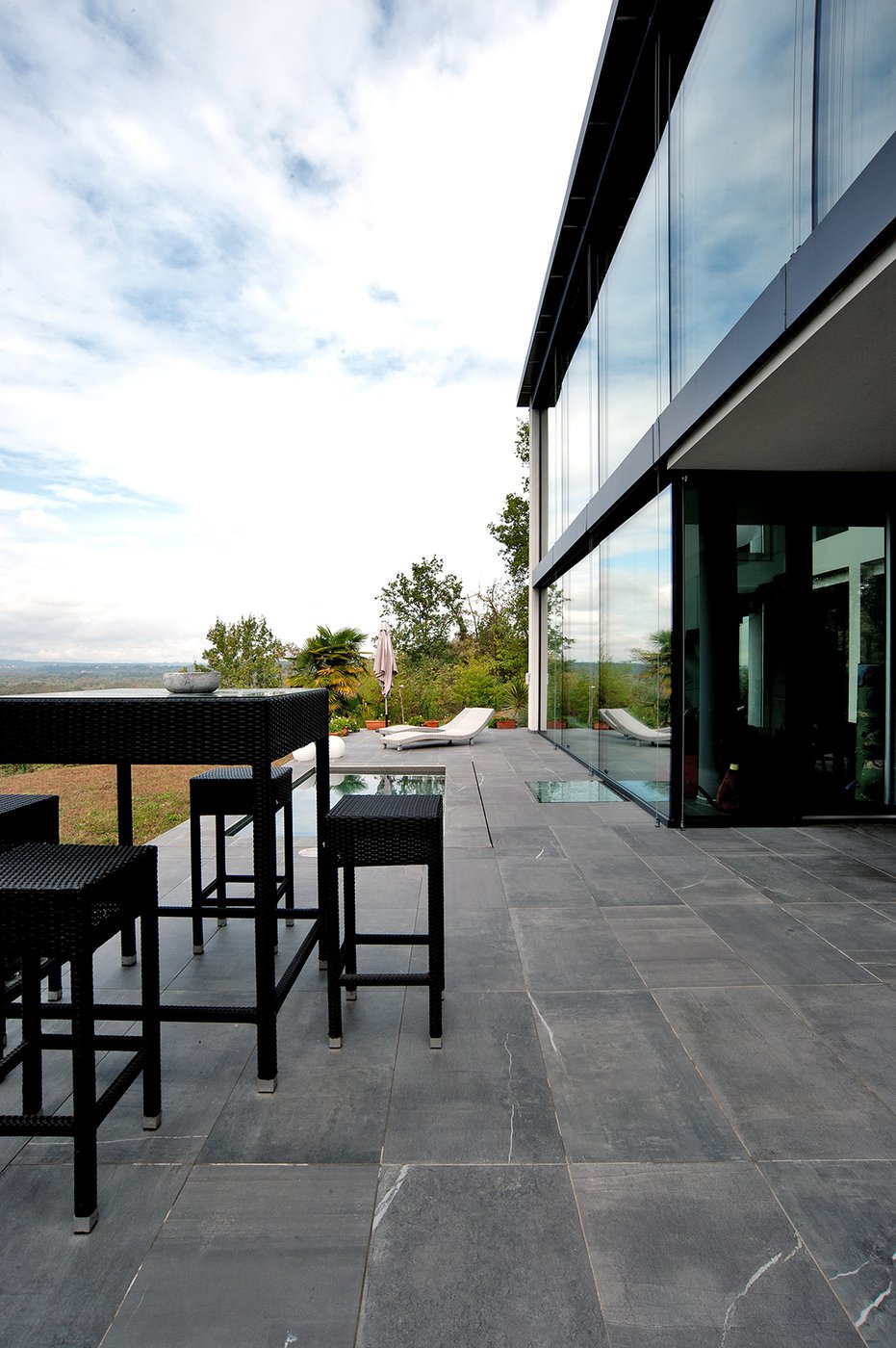 Eine Villa im Industrial-Stil in der grünen Landschaft der Lombardei, ein einfach einzigartiger Anblick dank der imposanten Struktur und dem Spiel von vollen und leeren Räumen, die von Architekt Achini entworfen wurden. Die Fassaden der Residenz, die sich durch die dunkle und intensive Farbe der Keramik mit StoneOne-Steineffekt auszeichnen, wechseln sich mit großen Fenstern ab, die das Licht eindringen lassen und den Blick ins Innere freigeben.