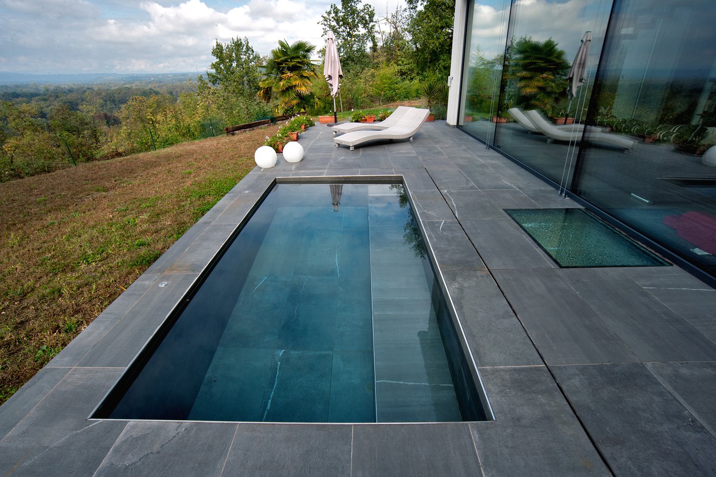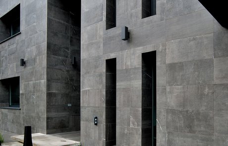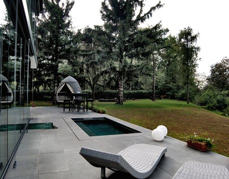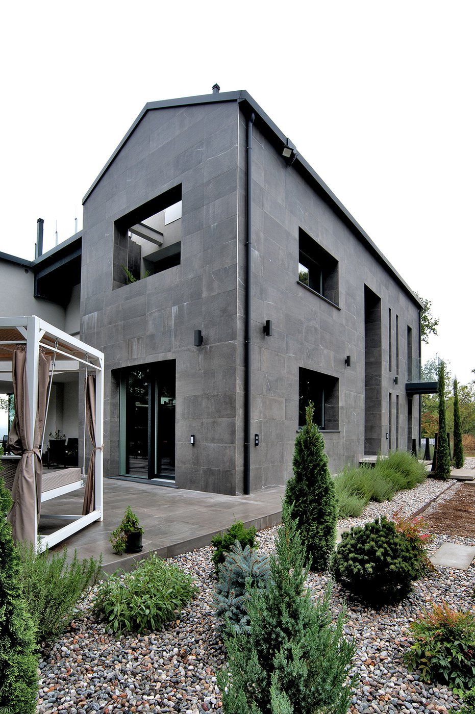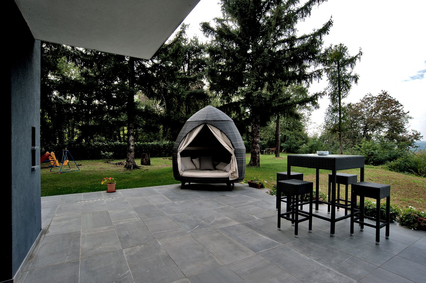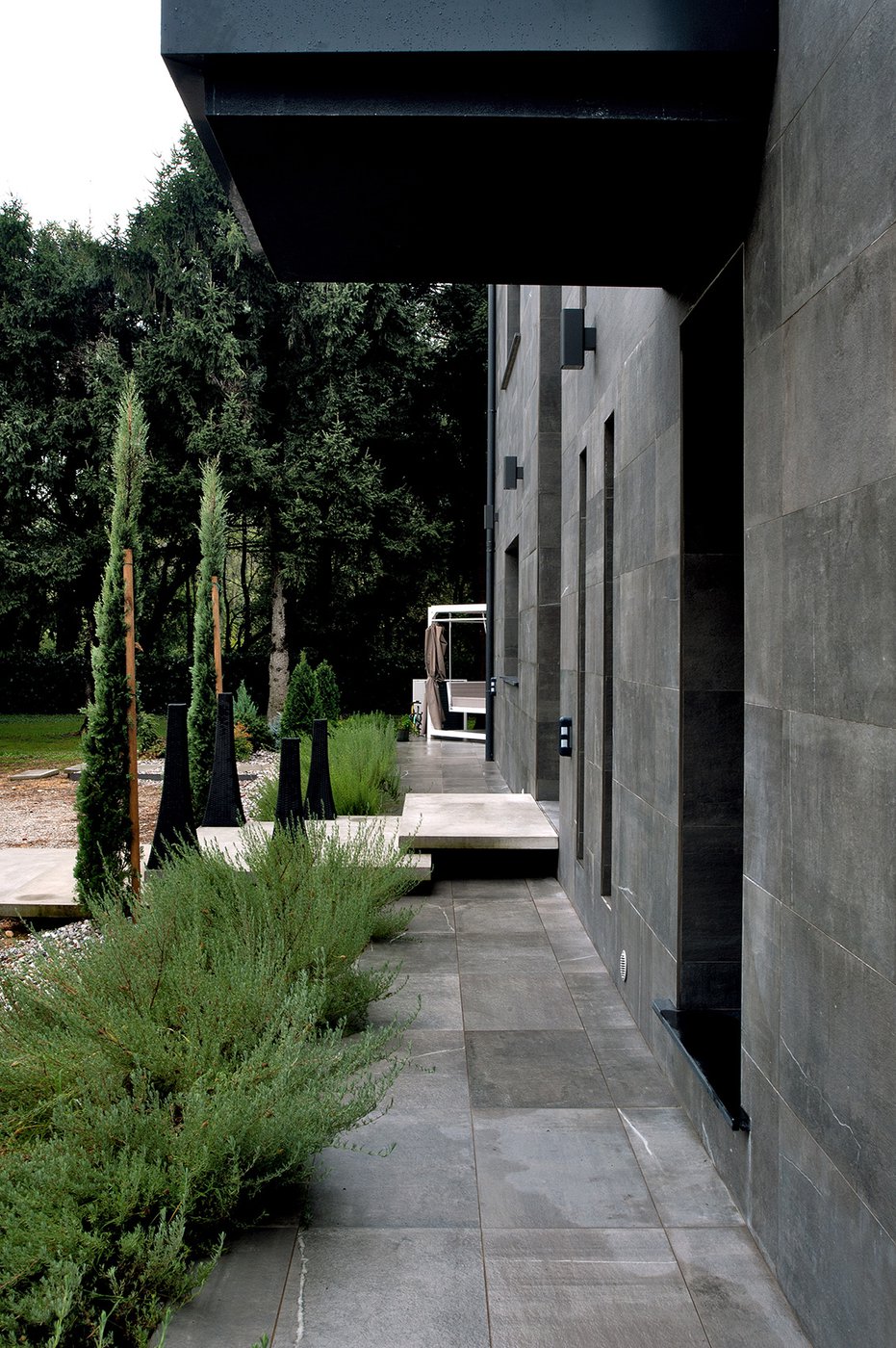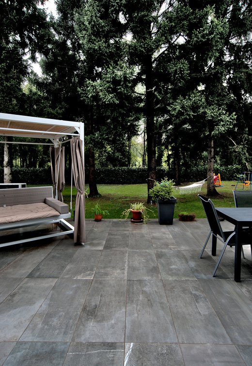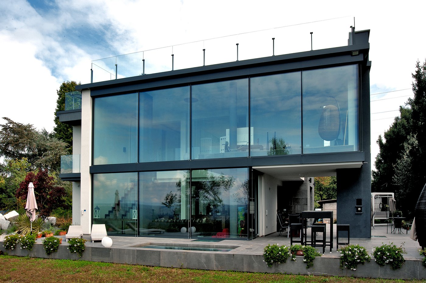 Eine Villa im Industrial-Stil in der grünen Landschaft der Lombardei, ein einfach einzigartiger Anblick dank der imposanten Struktur und dem Spiel von vollen und leeren Räumen, die von Architekt Achini entworfen wurden. Die Fassaden der Residenz, die sich durch die dunkle und intensive Farbe der Keramik mit StoneOne-Steineffekt auszeichnen, wechseln sich mit großen Fenstern ab, die das Licht eindringen lassen und den Blick ins Innere freigeben.