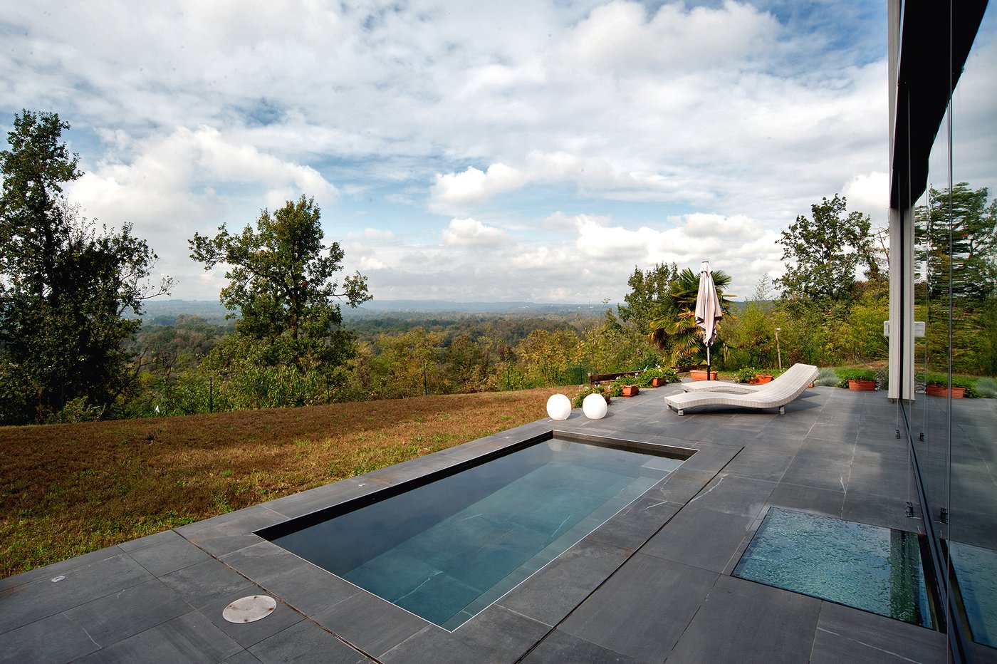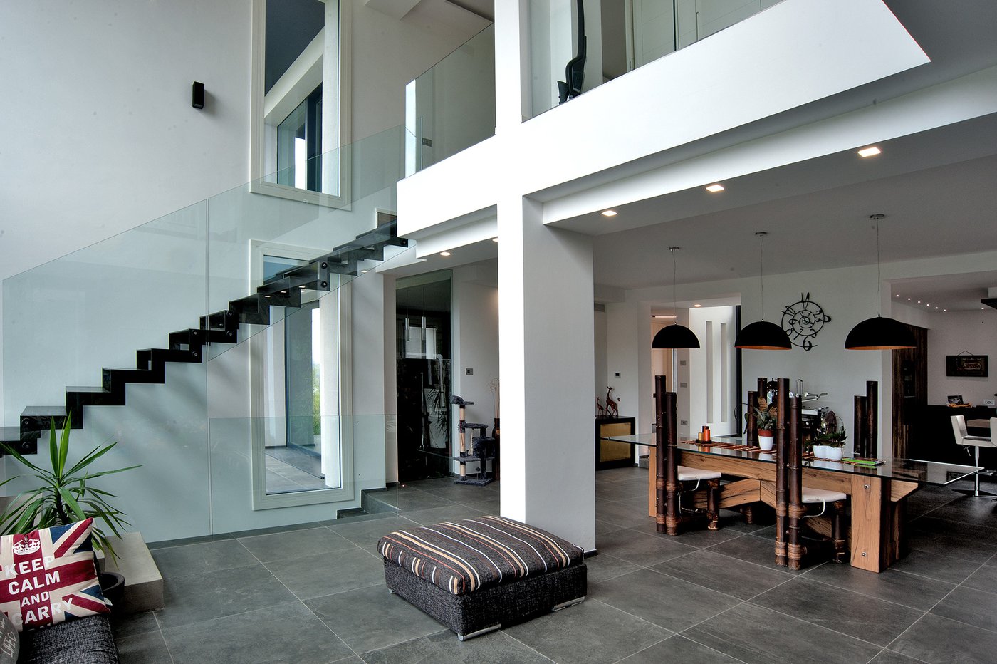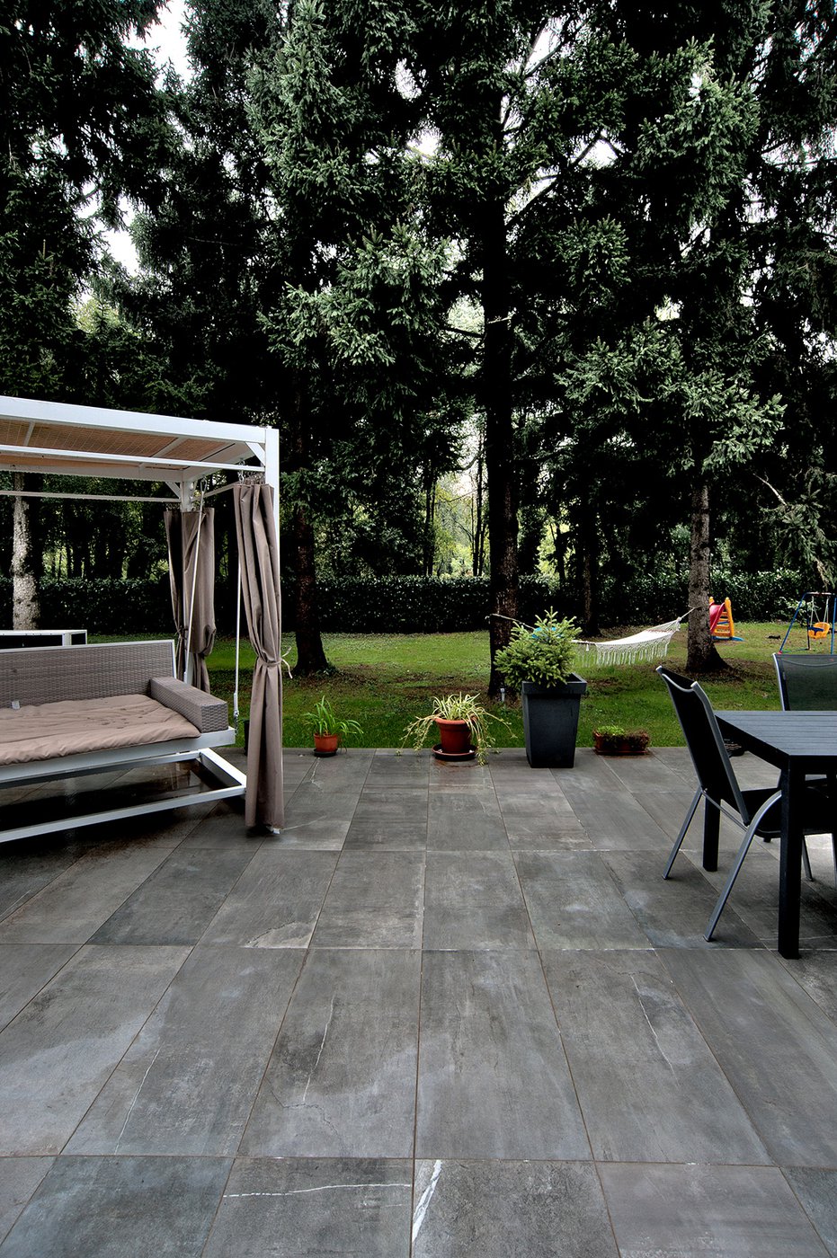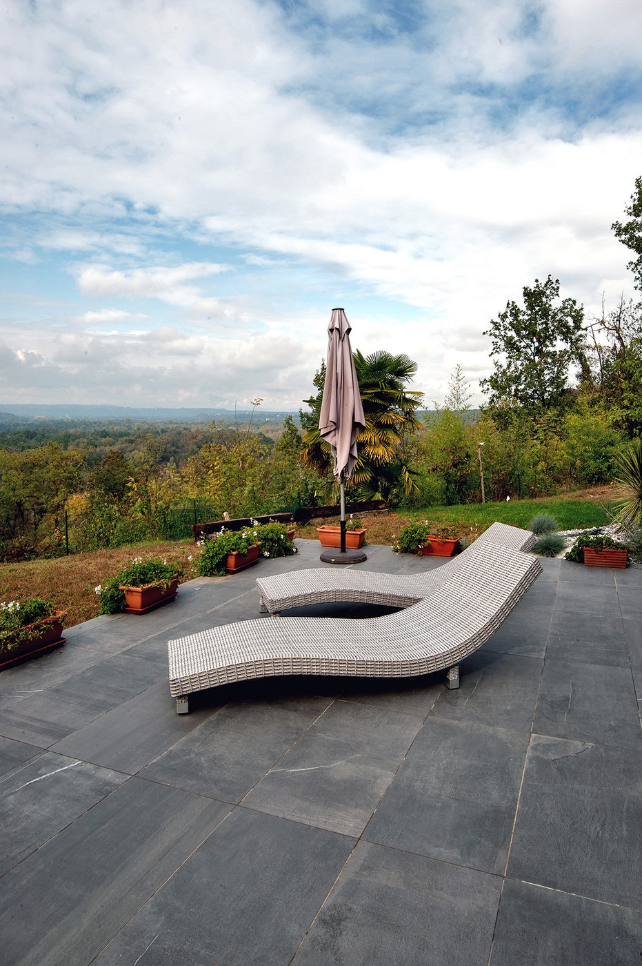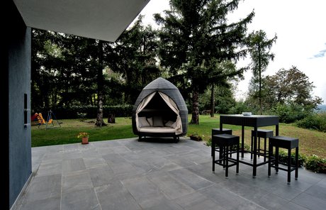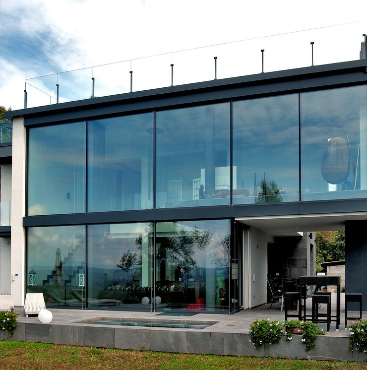 Eine Villa im Industrial-Stil in der grünen Landschaft der Lombardei, ein einfach einzigartiger Anblick dank der imposanten Struktur und dem Spiel von vollen und leeren Räumen, die von Architekt Achini entworfen wurden. Die Fassaden der Residenz, die sich durch die dunkle und intensive Farbe der Keramik mit StoneOne-Steineffekt auszeichnen, wechseln sich mit großen Fenstern ab, die das Licht eindringen lassen und den Blick ins Innere freigeben.