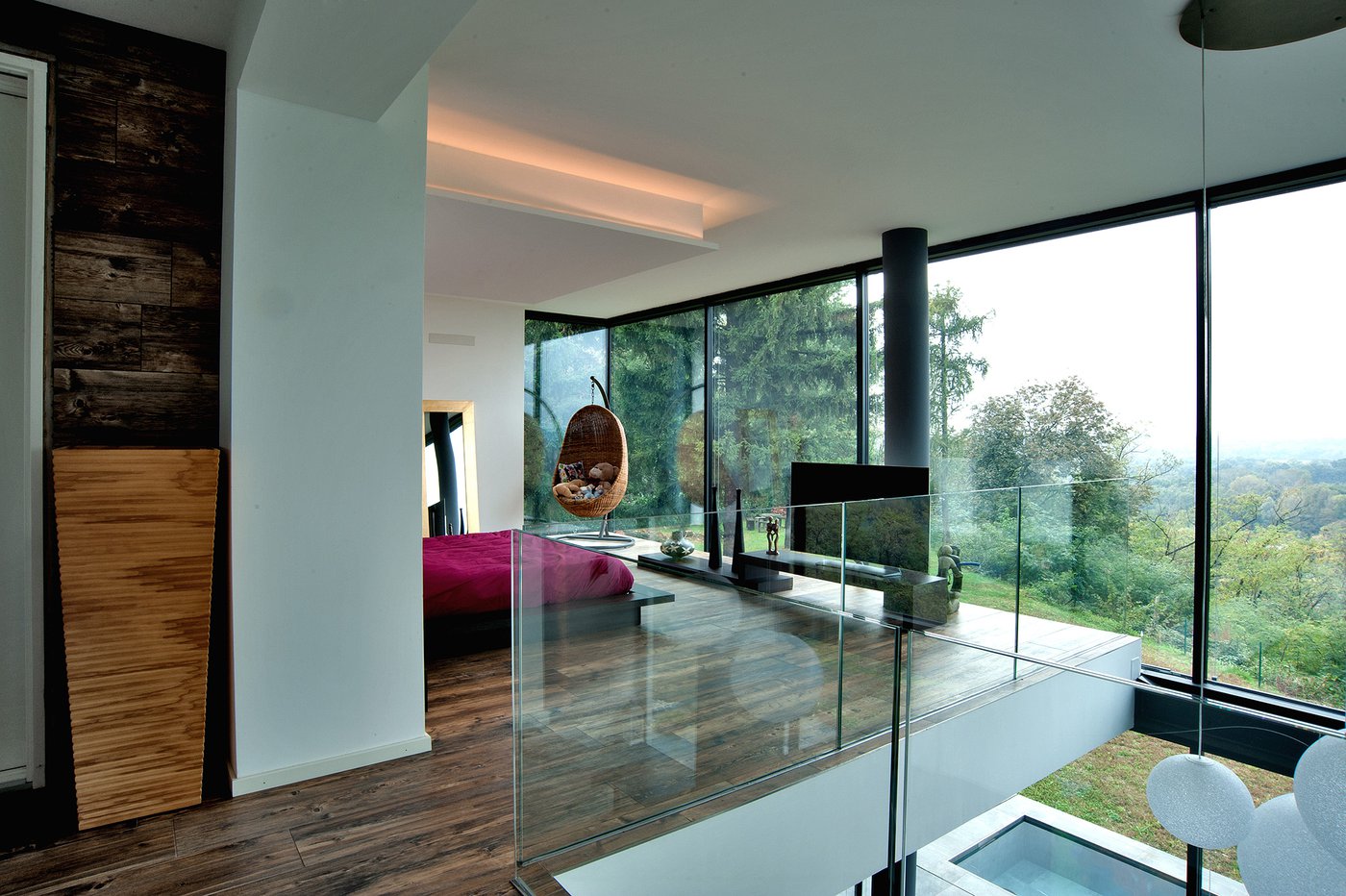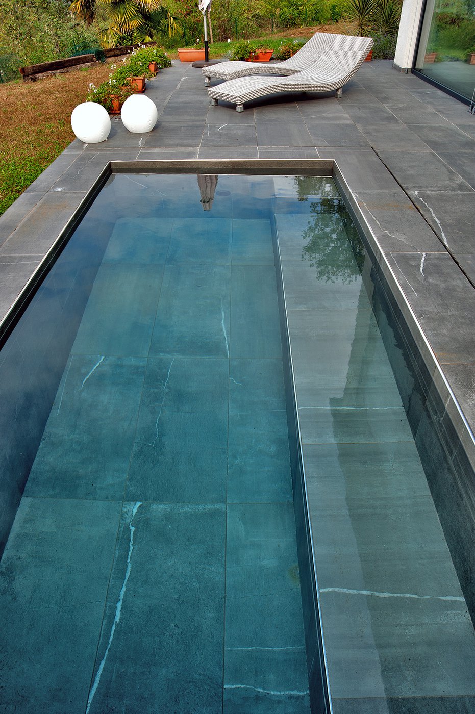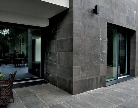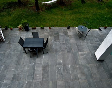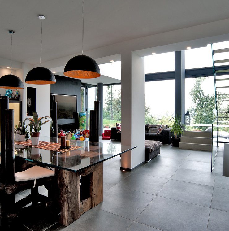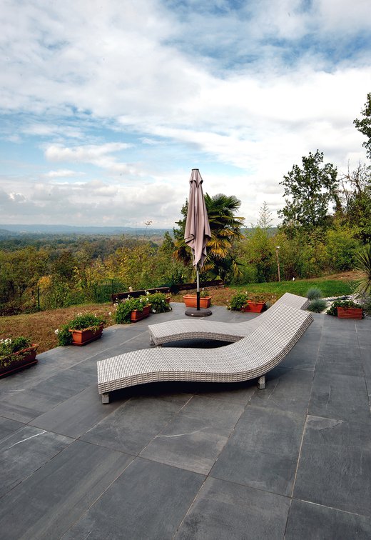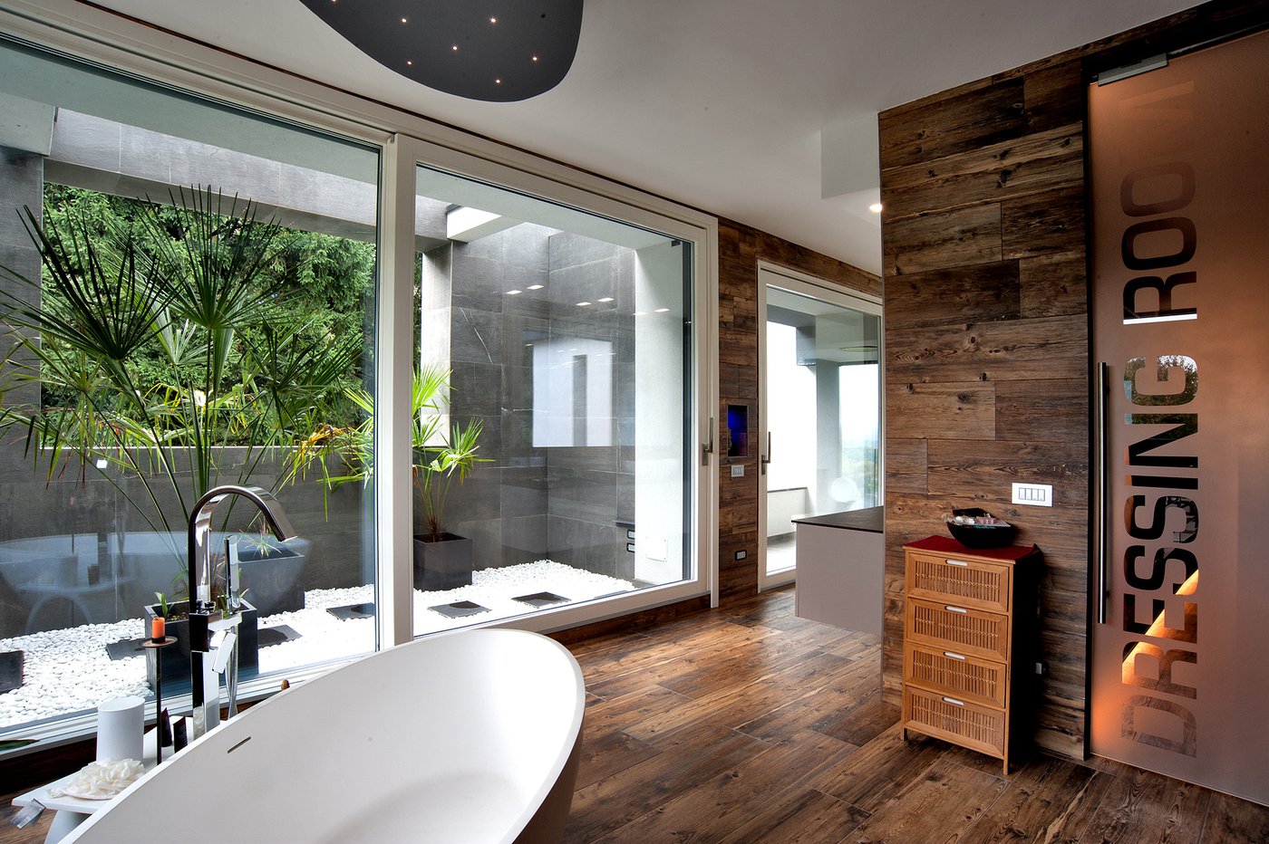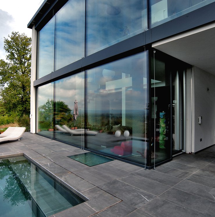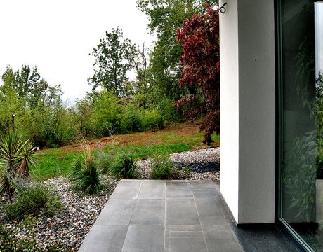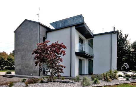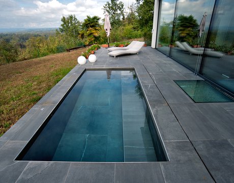 Eine Villa im Industrial-Stil in der grünen Landschaft der Lombardei, ein einfach einzigartiger Anblick dank der imposanten Struktur und dem Spiel von vollen und leeren Räumen, die von Architekt Achini entworfen wurden. Die Fassaden der Residenz, die sich durch die dunkle und intensive Farbe der Keramik mit StoneOne-Steineffekt auszeichnen, wechseln sich mit großen Fenstern ab, die das Licht eindringen lassen und den Blick ins Innere freigeben.