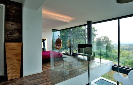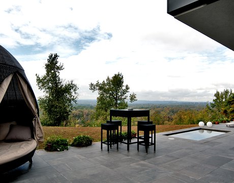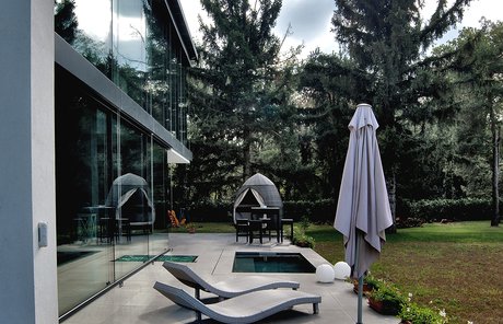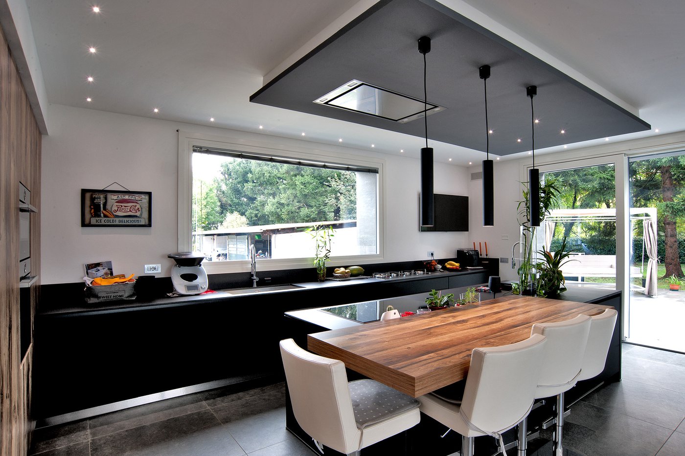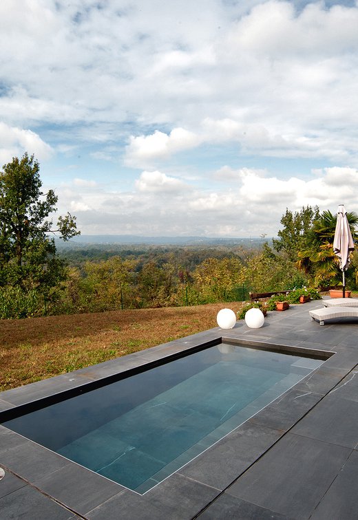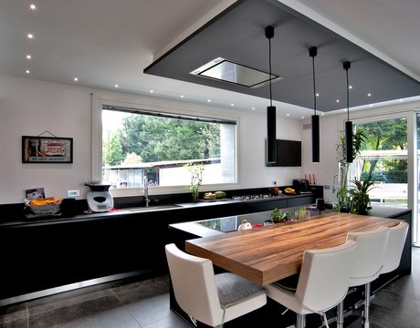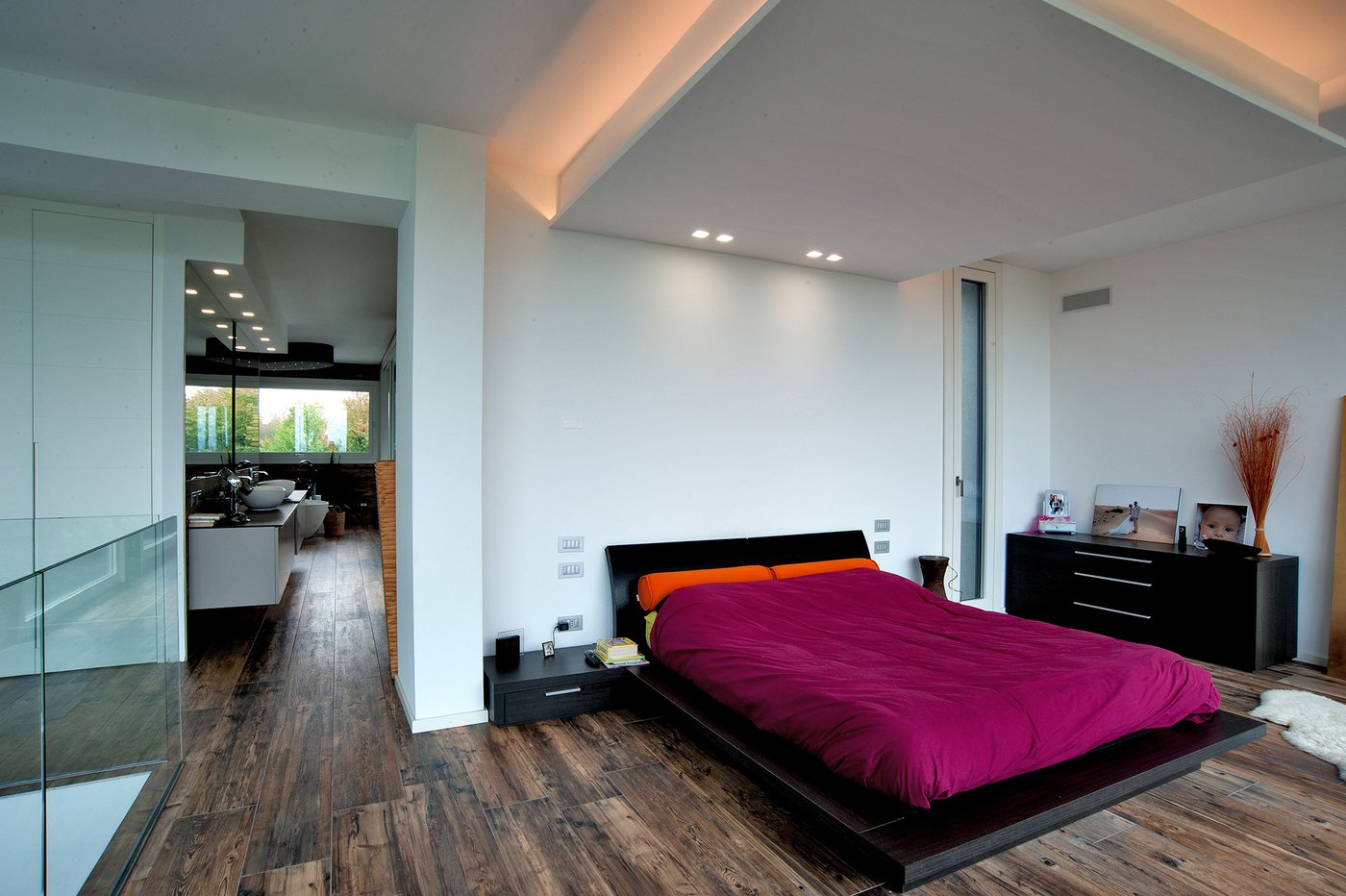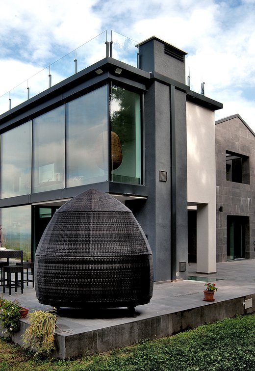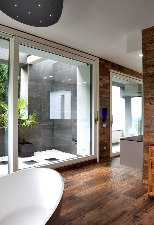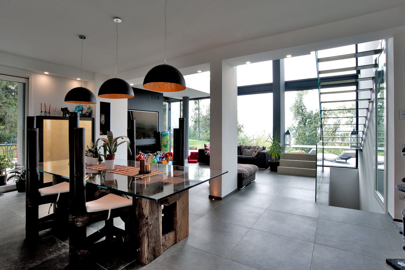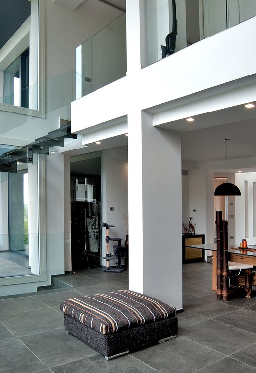 Eine Villa im Industrial-Stil in der grünen Landschaft der Lombardei, ein einfach einzigartiger Anblick dank der imposanten Struktur und dem Spiel von vollen und leeren Räumen, die von Architekt Achini entworfen wurden. Die Fassaden der Residenz, die sich durch die dunkle und intensive Farbe der Keramik mit StoneOne-Steineffekt auszeichnen, wechseln sich mit großen Fenstern ab, die das Licht eindringen lassen und den Blick ins Innere freigeben.