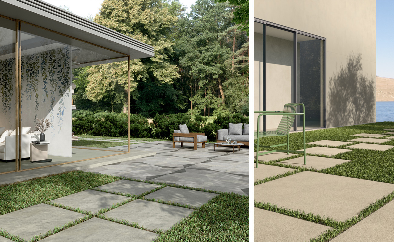 Links: Feinsteinzeugfliesenboden für den Außenbereich auf grauem Rasen in Steinoptik; rechts: Feinsteinzeugfliesenboden für den Außenbereich auf beigem Rasen in Betonoptik.