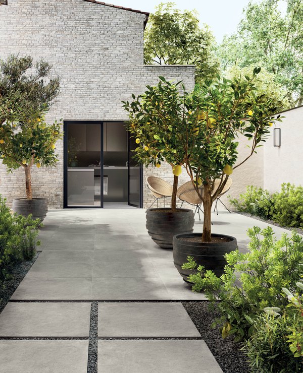 Außenbereich mit grauem Feinsteinzeugboden in Steinoptik und Zierpflanzen an den Seiten.