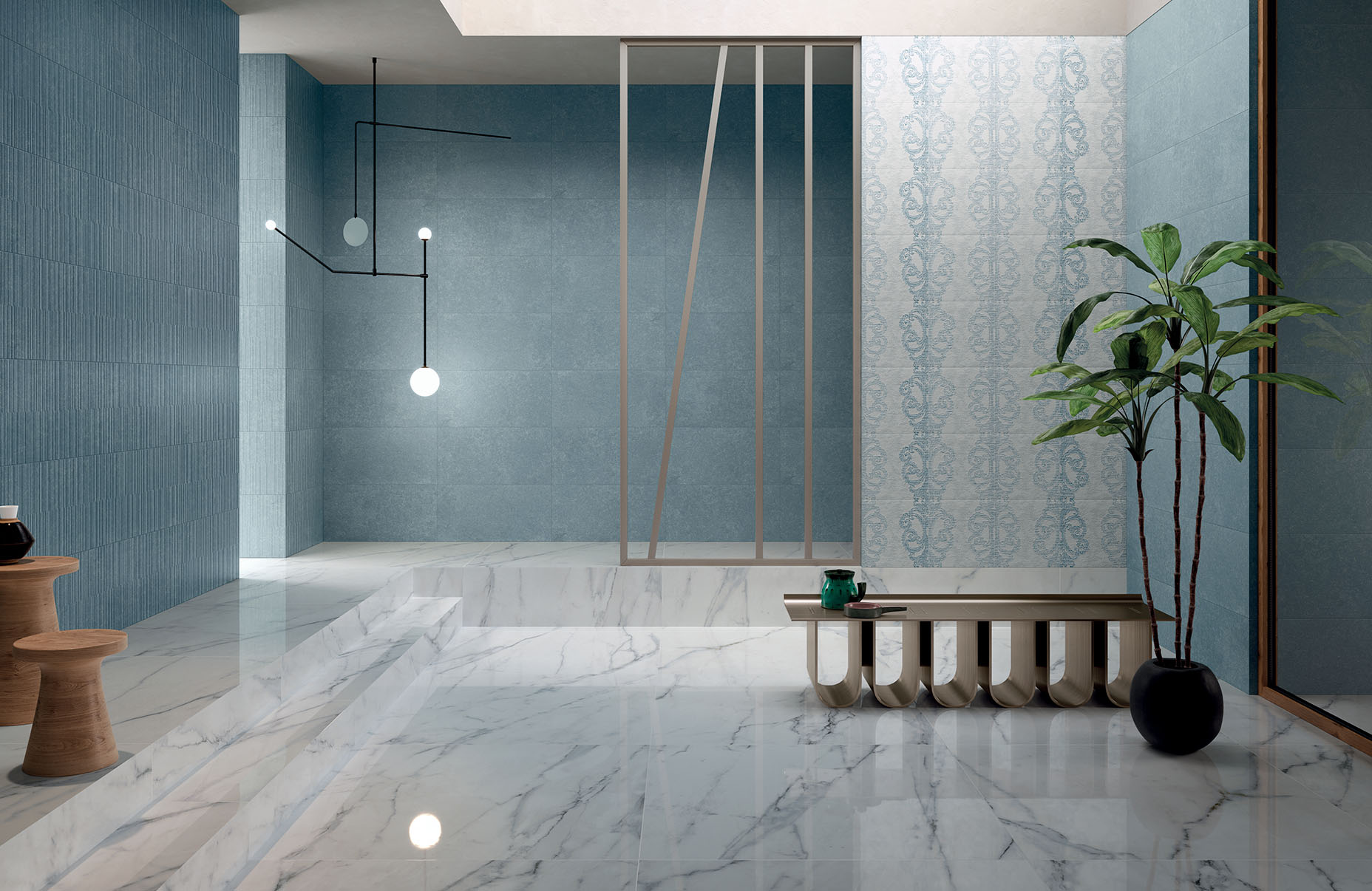 As far as floor and wall tiles are concerned, you can opt for marble-effect surfaces with precious mosaics or stone-effect surfaces in natural shades, such as Foyer Royal or Soul Bay.