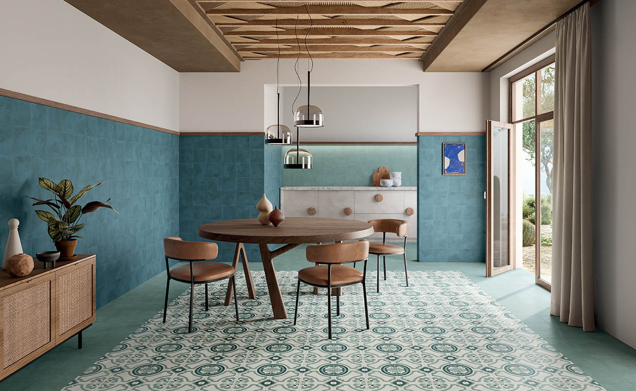 For more eye-catching exotic interiors, on the other hand, one can opt for small-size decorated encaustic tiles, such as those of Terra.Art: a porcelain stoneware collection with vintage graphics, which in the Oceano version immediately brings to mind 'azulejos', a must-have in every traditional Moroccan and Arab construction.