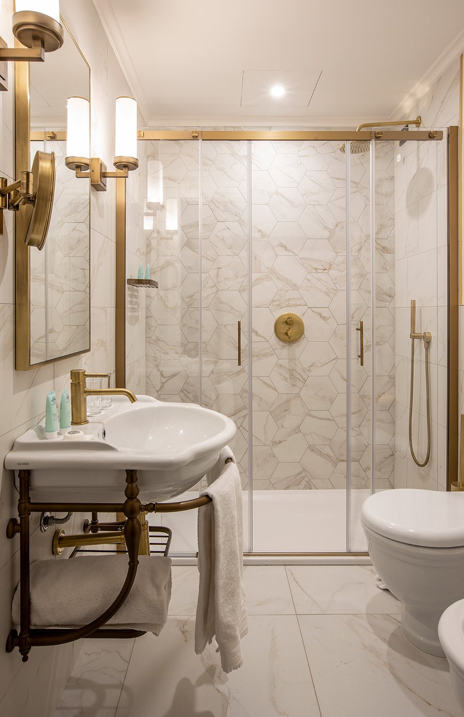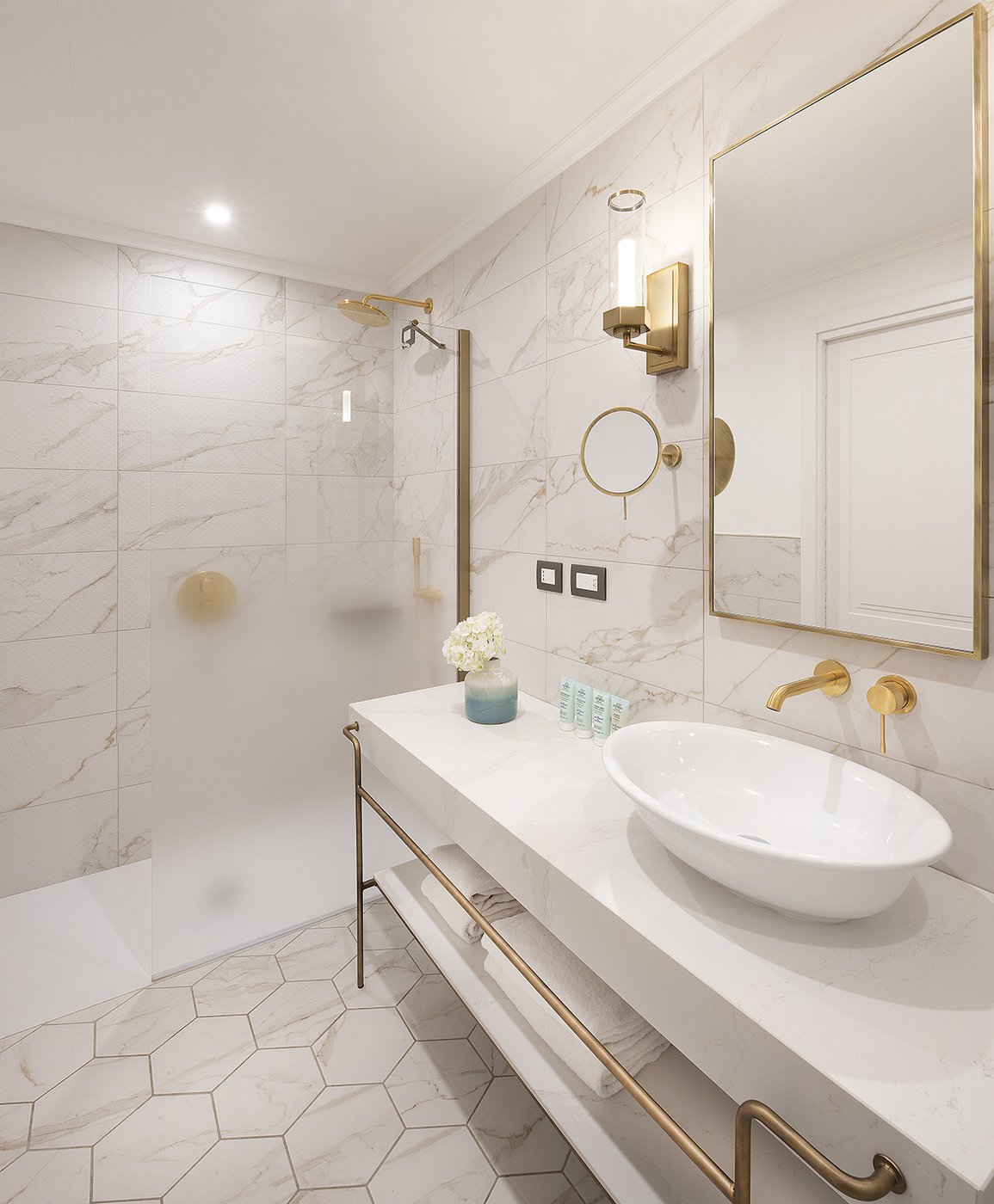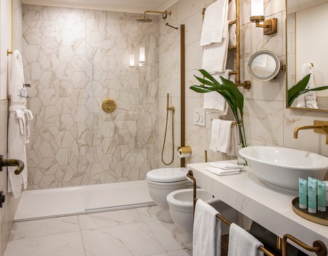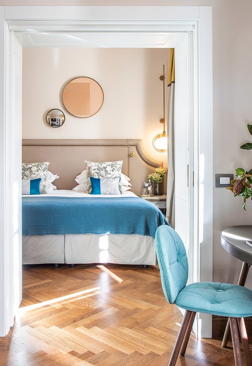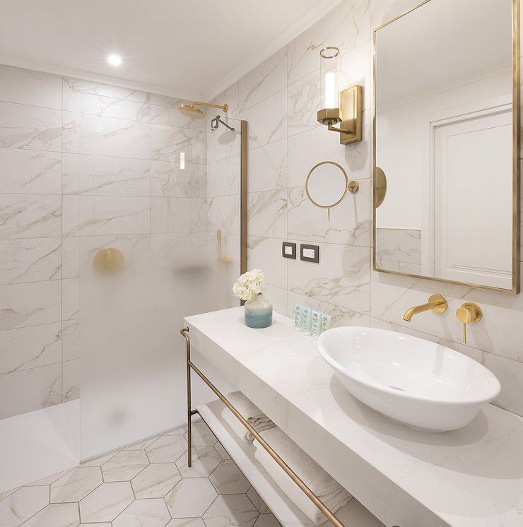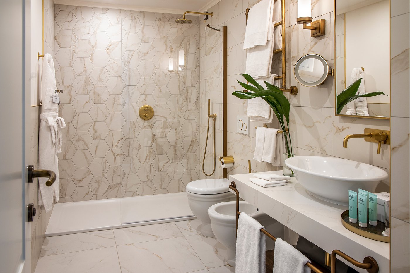 For exclusive yet inviting bedrooms, the choice fell to elegant parquet flooring and the bright marble effect porcelain tiles of Marca Corona: Motif Extra and Motif stoneware flooring and coverings bring a cosy, refined allure and timeless charm to the private bathrooms, turning them into the perfect places to regenerate the body and mind.