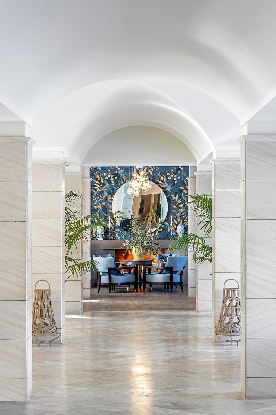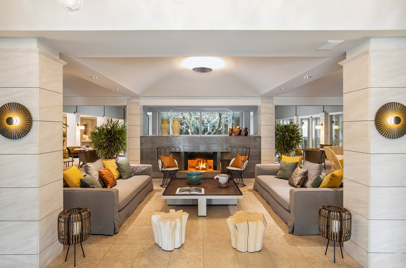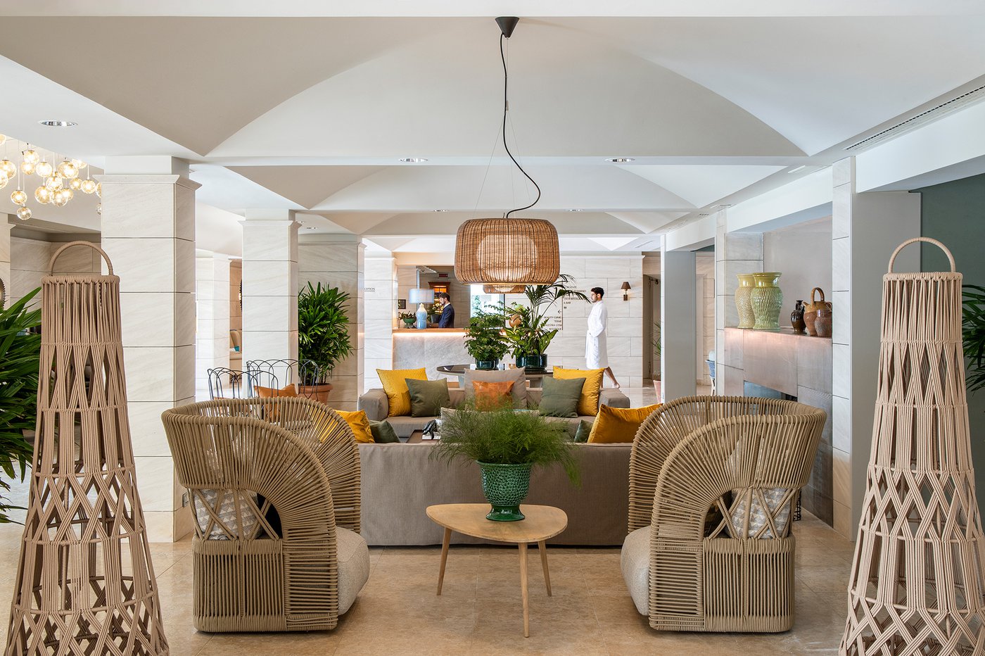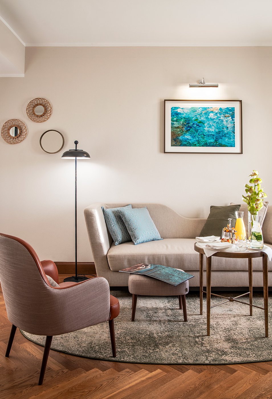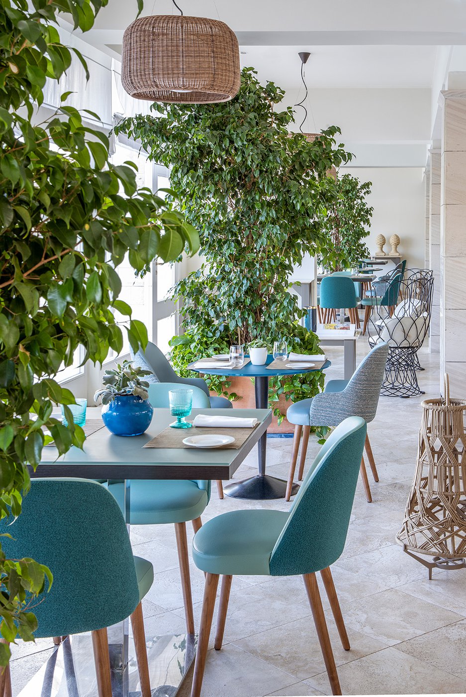 The inspiration came from the surroundings and the interior and exterior design features a palette of natural, revitalising colours, ranging from cool tones of sea blue through to olive green and bright beige. The hall, the restaurants, the library and the private suites are marked by graceful shapes, soft seats and fabrics and artisan furnishings crafted in wood and metal, all designed to spoil guests during their relaxing stay.