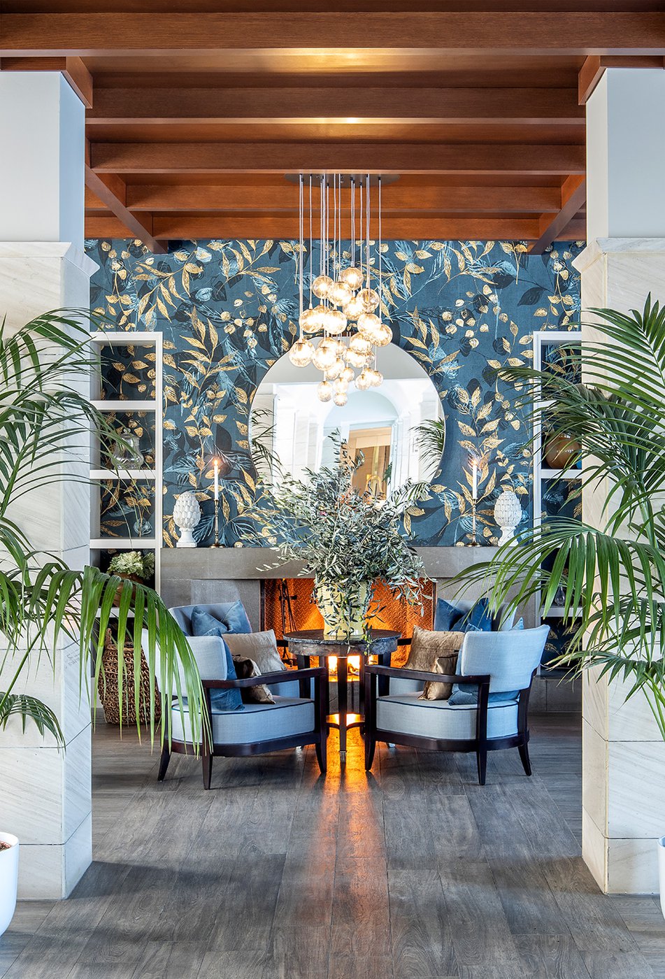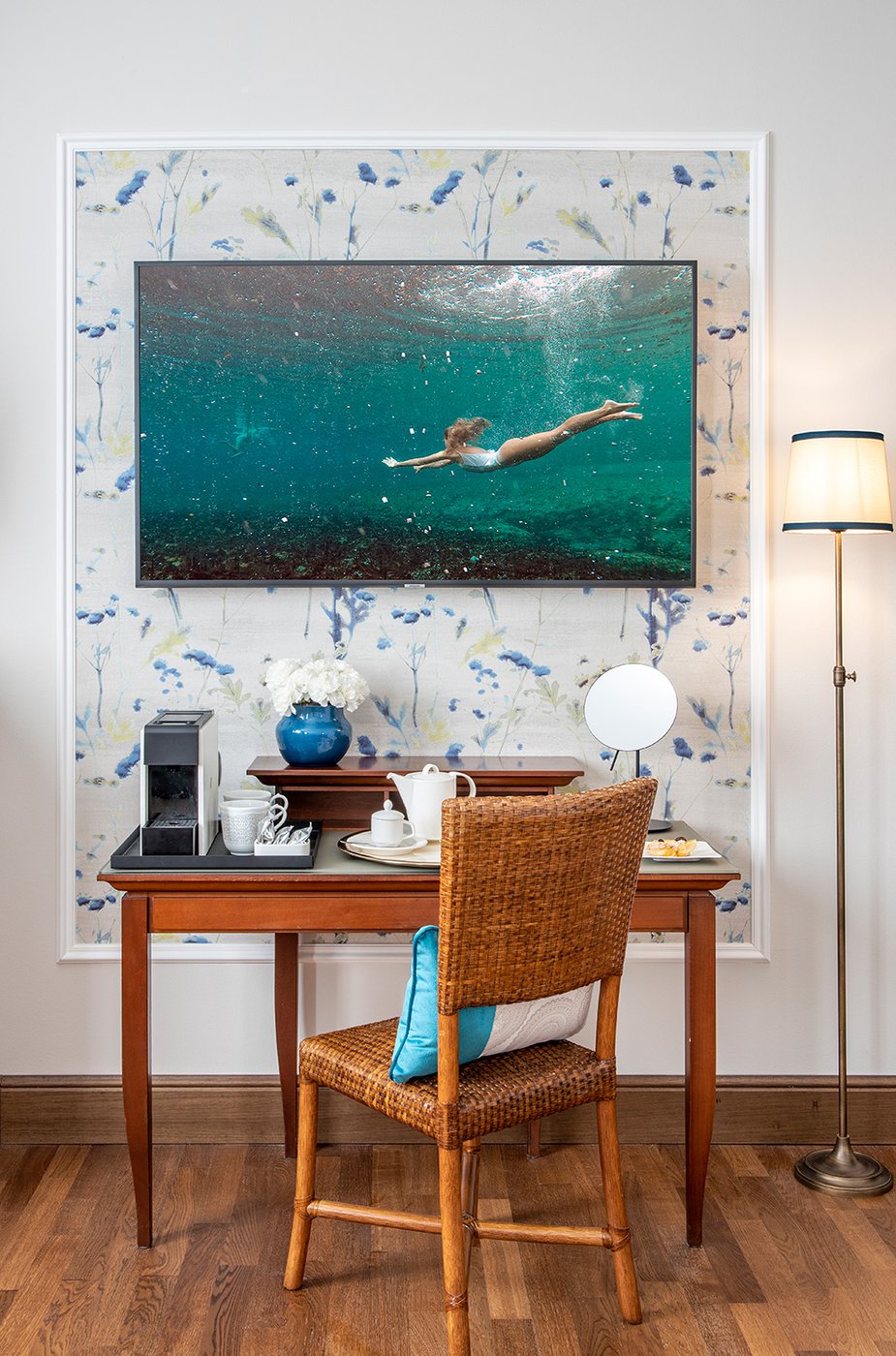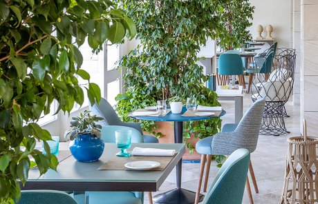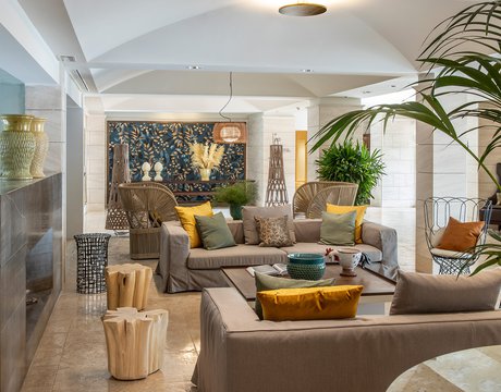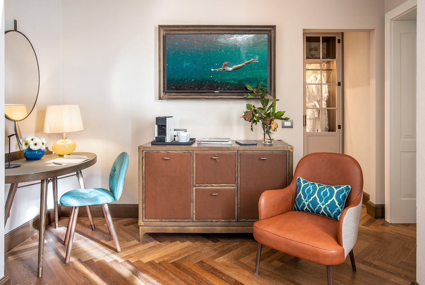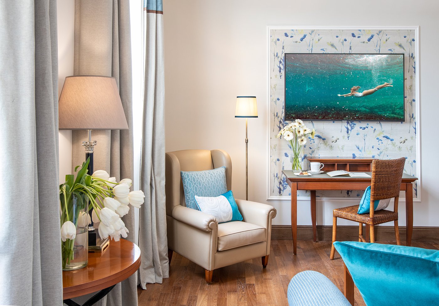The inspiration came from the surroundings and the interior and exterior design features a palette of natural, revitalising colours, ranging from cool tones of sea blue through to olive green and bright beige. The hall, the restaurants, the library and the private suites are marked by graceful shapes, soft seats and fabrics and artisan furnishings crafted in wood and metal, all designed to spoil guests during their relaxing stay.