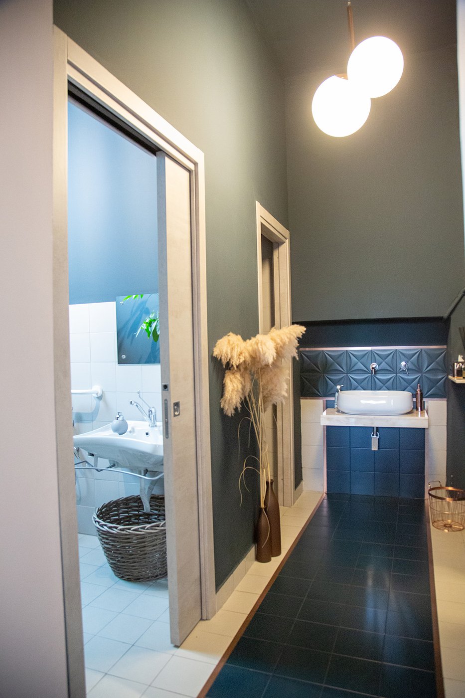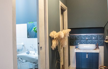The counter, the focal point of the restaurant room, is enhanced by the three-dimensional motifs of the 4D deel blue wall tiles, and the dark parquet-effect floors with their optical effect. The 4D collection can also be found in the corridors and toilets, combined here with shades of pure white to emphasise the elegance of the floral relief decorations.