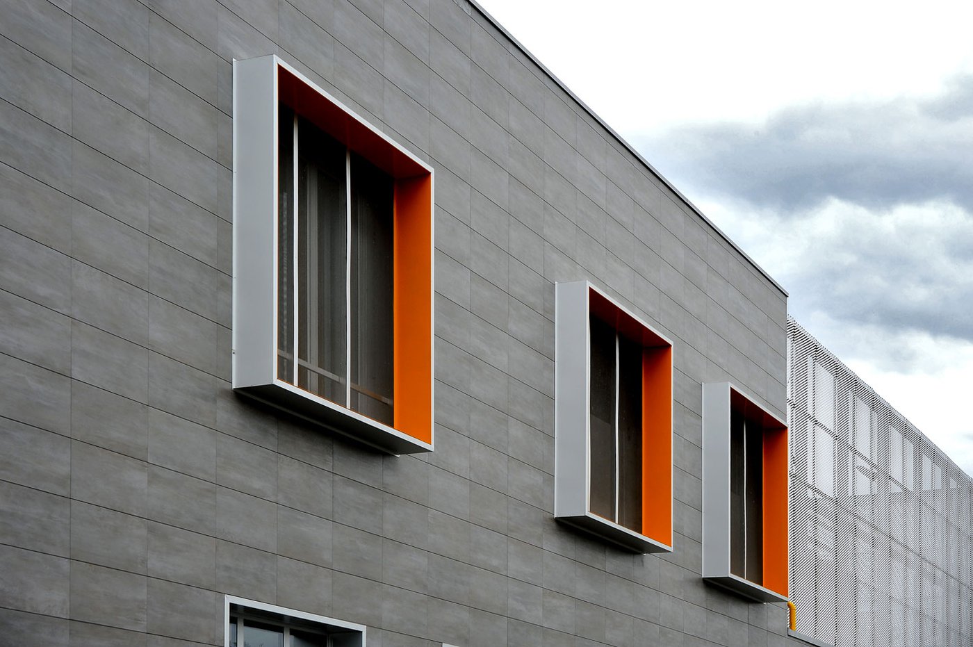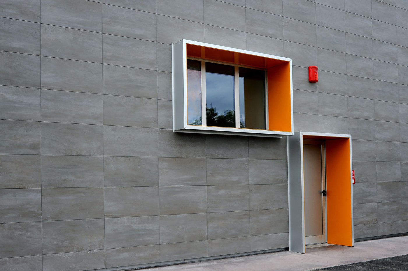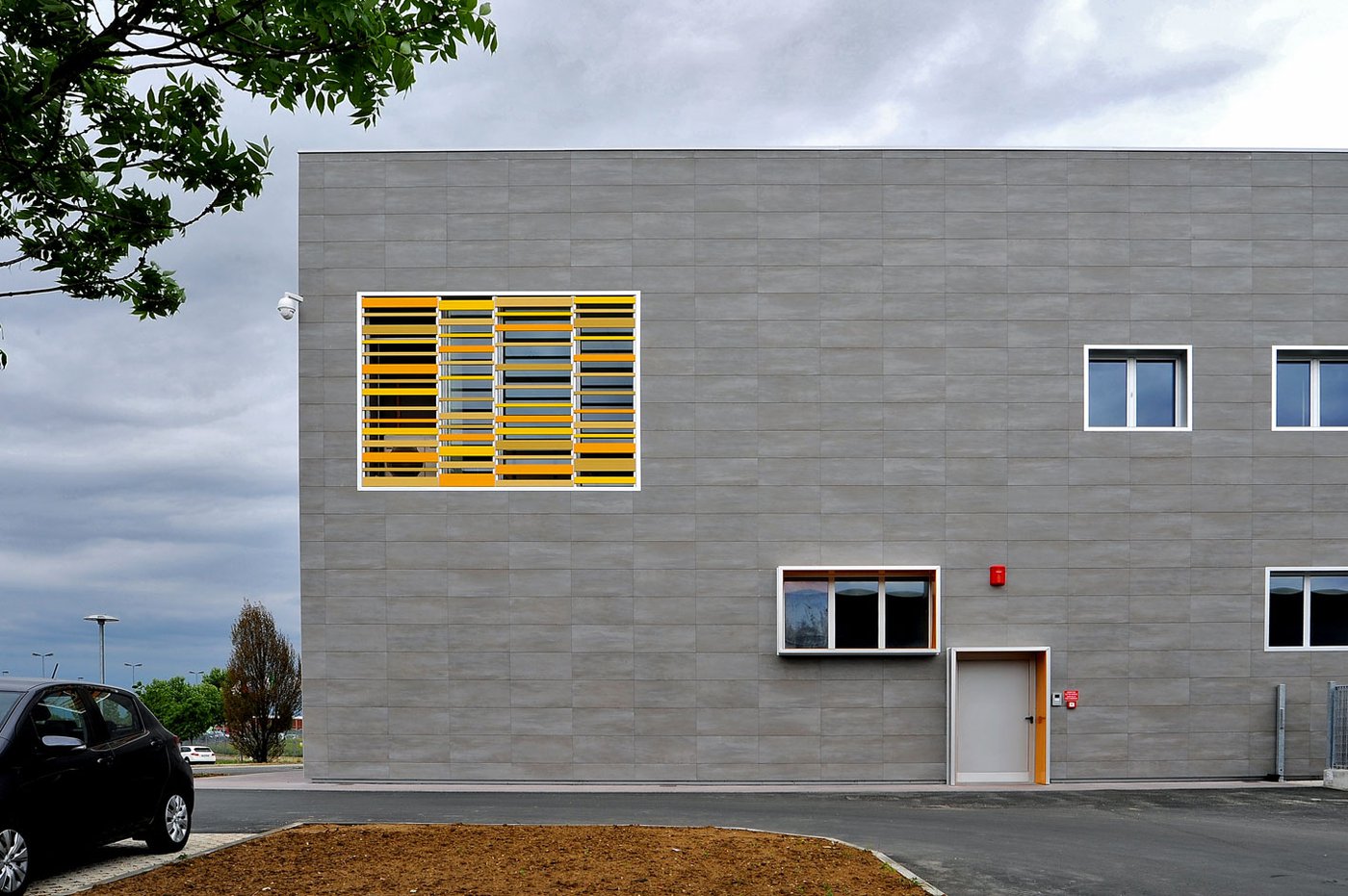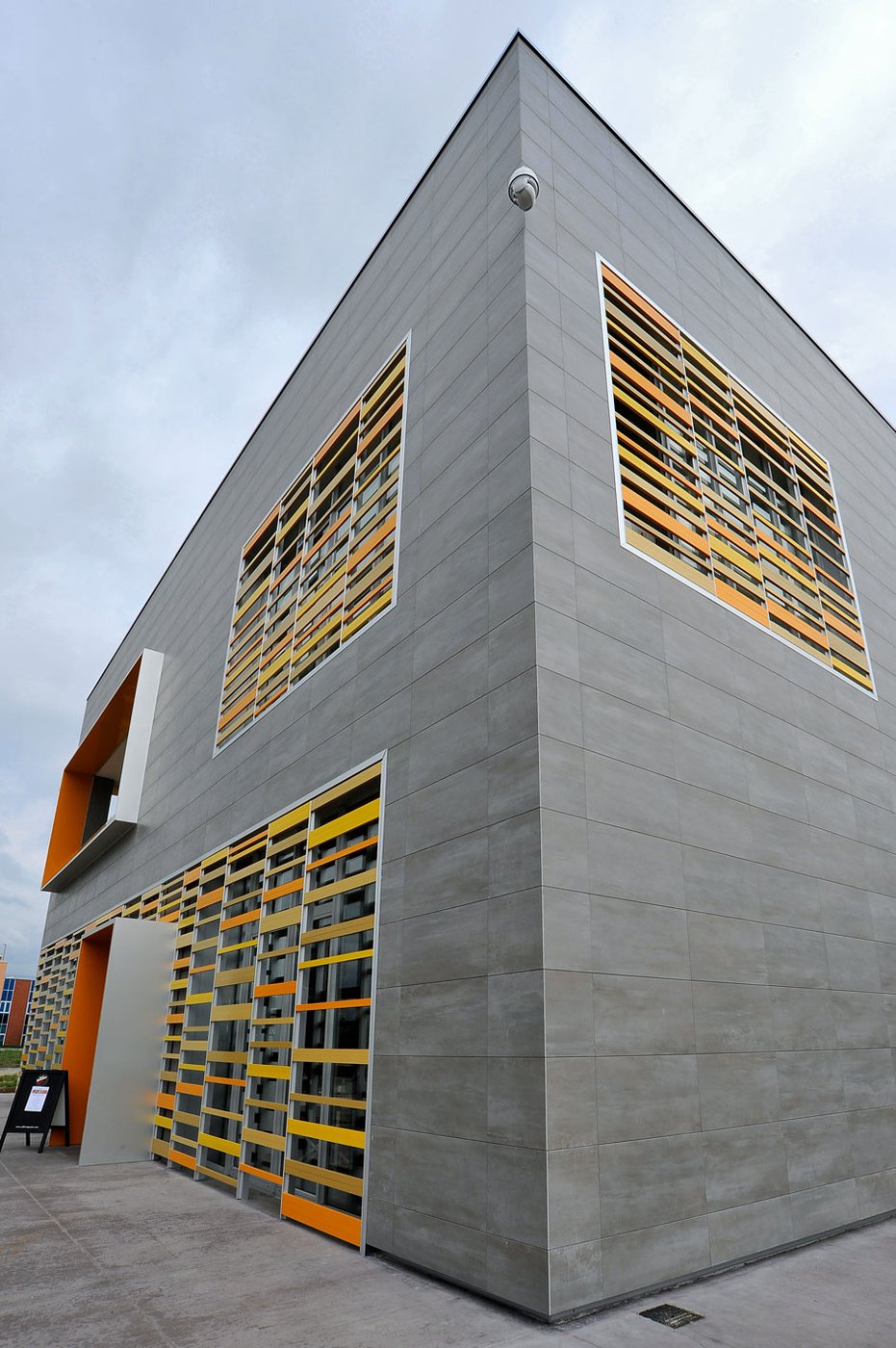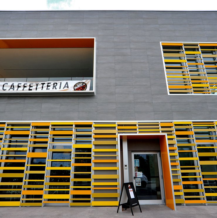 To improve the thermal performance of its new premises near Cuneo, the Camst kitchen chain has opted for an innovative technical solution. The Planet series is used for the facade of the building, part of an efficient system of ventilated walls designed to guarantee maximum functionality without compromising on style, given the pleasant combination between these metal-effect surfaces and the vibrant colours of the exterior door and window frames.