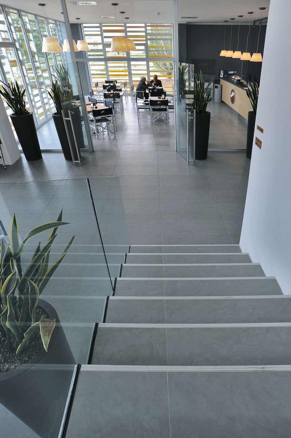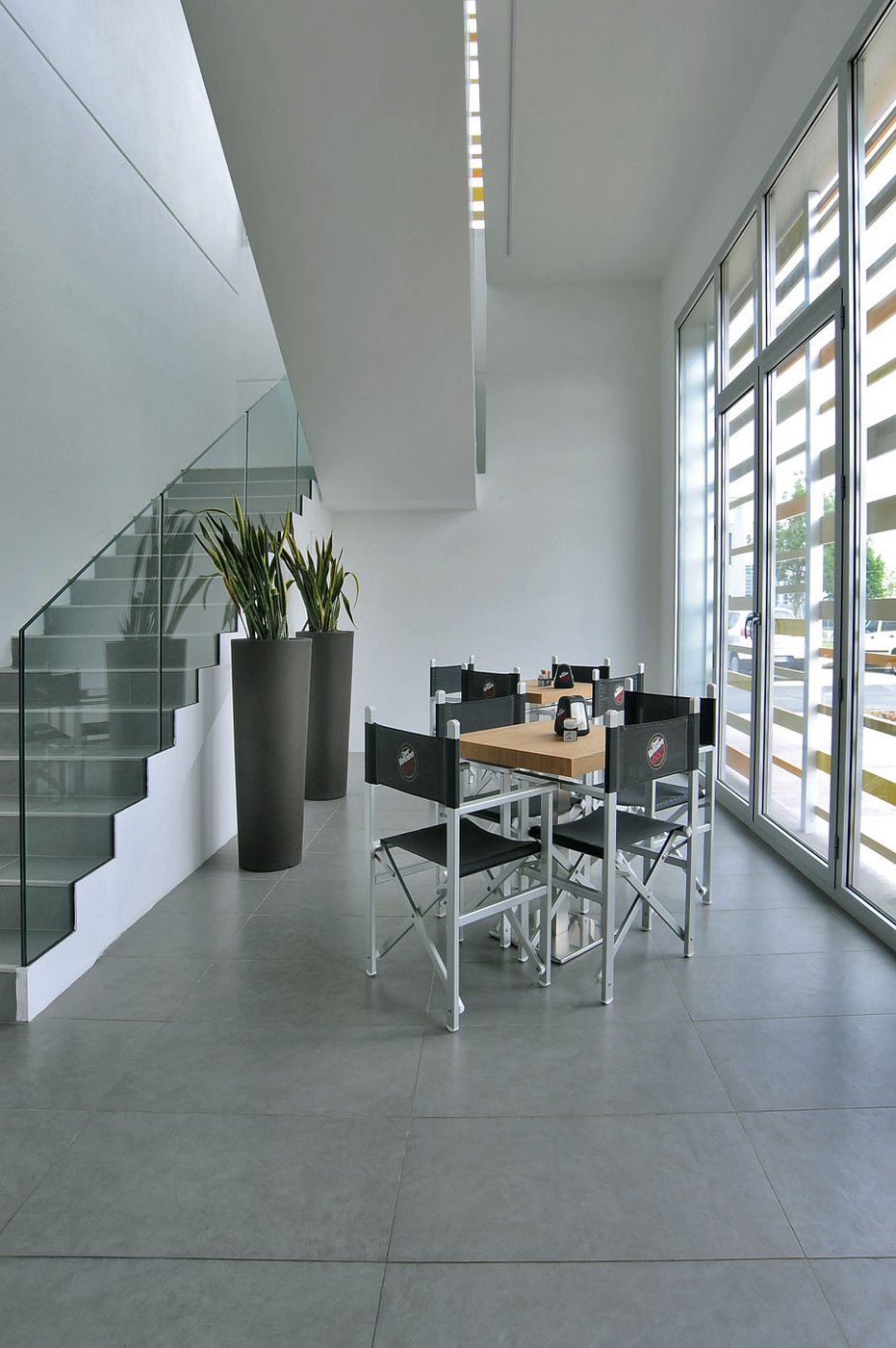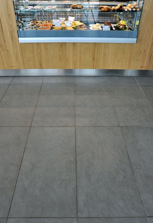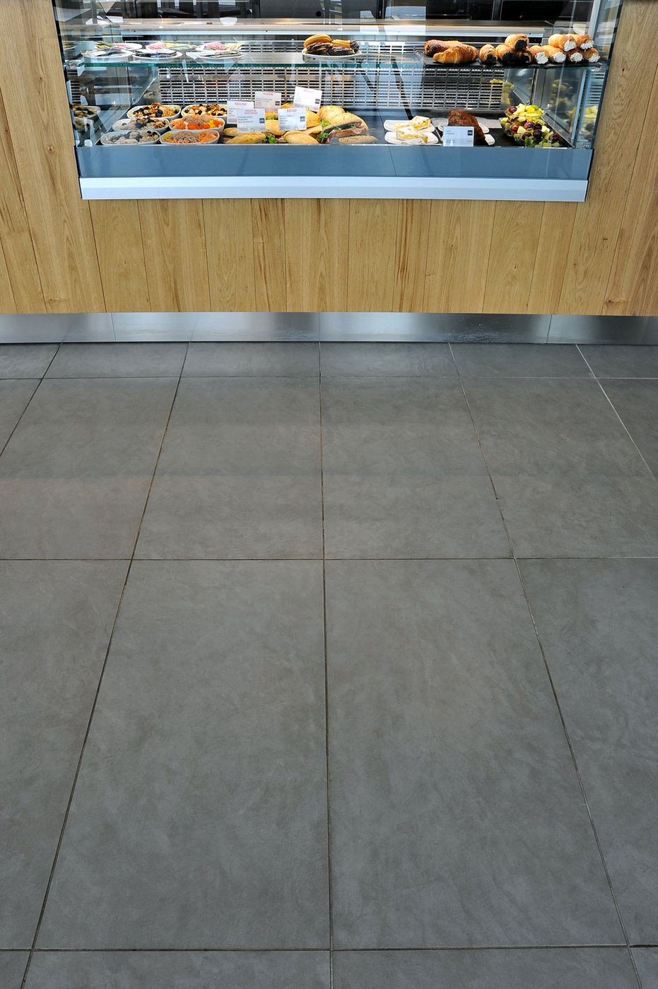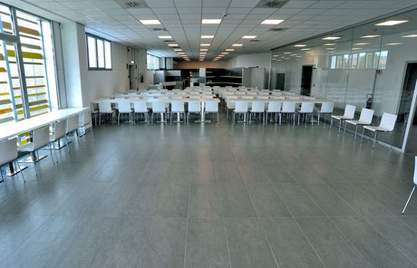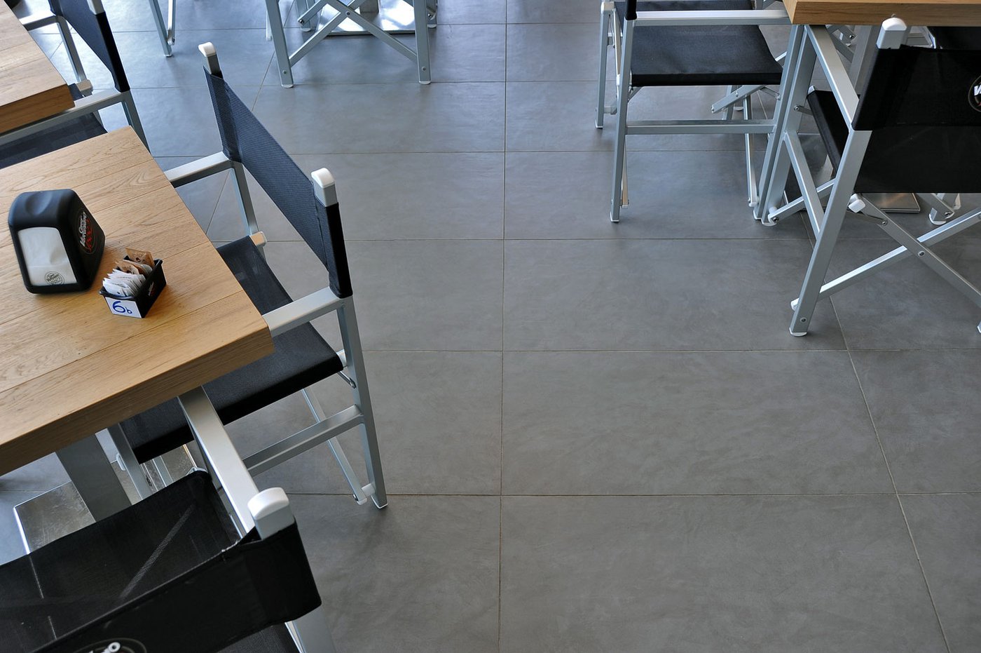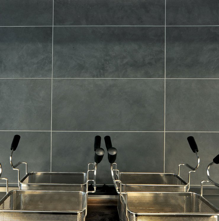 Featured in the interiors is the Work series, in a number of different shades, for a total of over 2500 square meters: from the kitchens to the offices, as well as the dining rooms and the toilets, these concrete-effect floor and wall coverings shape modern, inviting, informal settings.