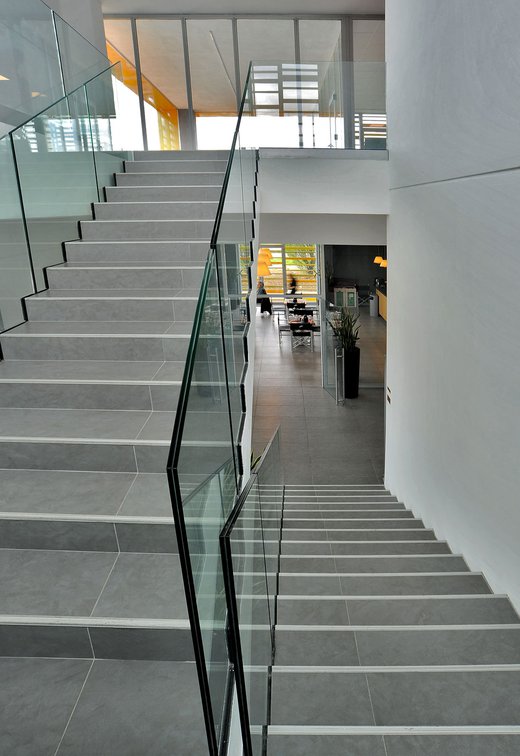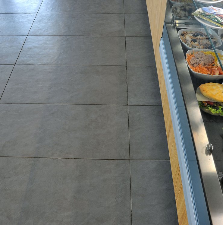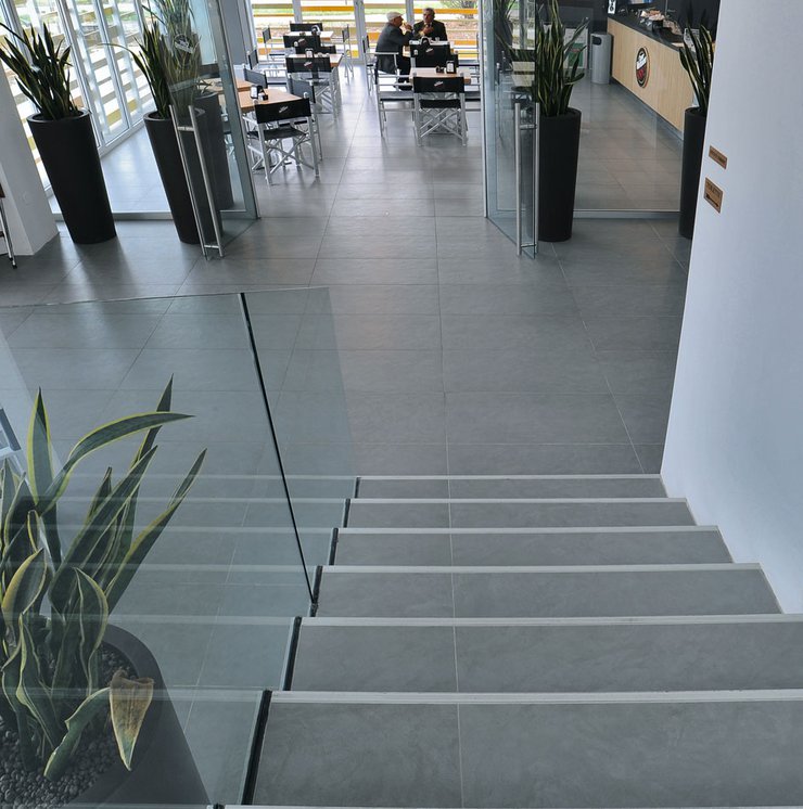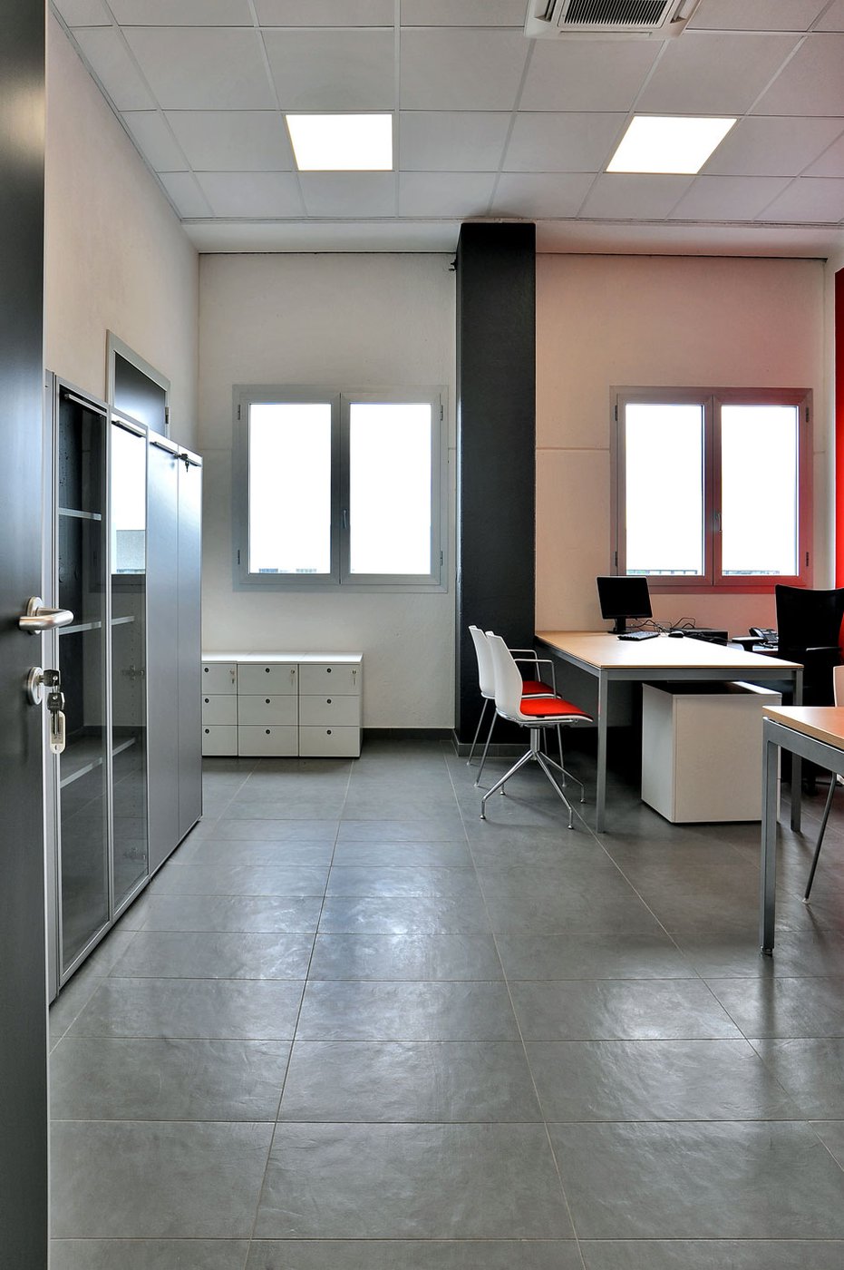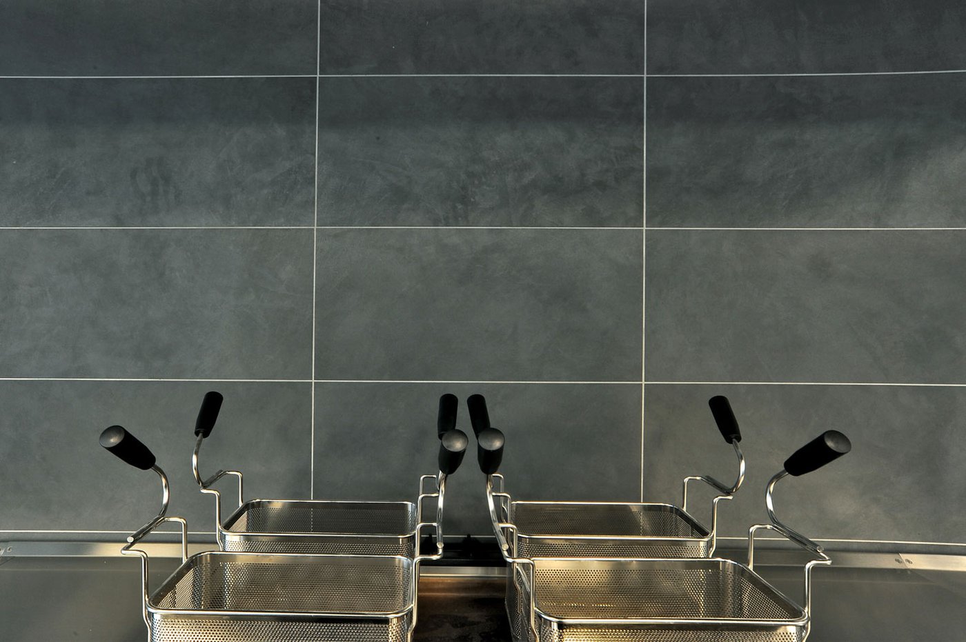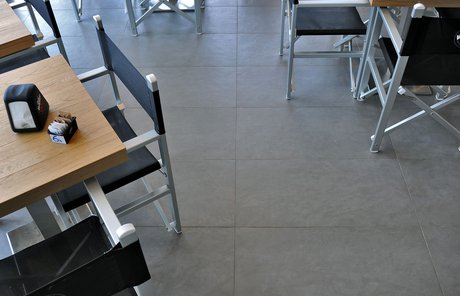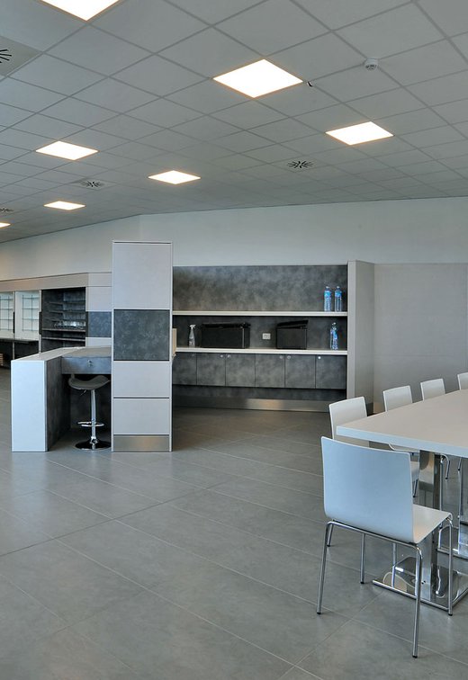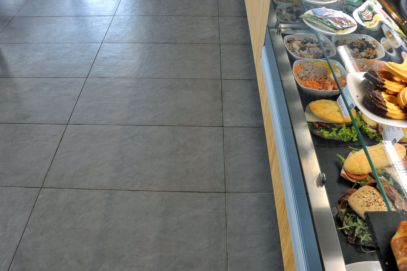 Featured in the interiors is the Work series, in a number of different shades, for a total of over 2500 square meters: from the kitchens to the offices, as well as the dining rooms and the toilets, these concrete-effect floor and wall coverings shape modern, inviting, informal settings.